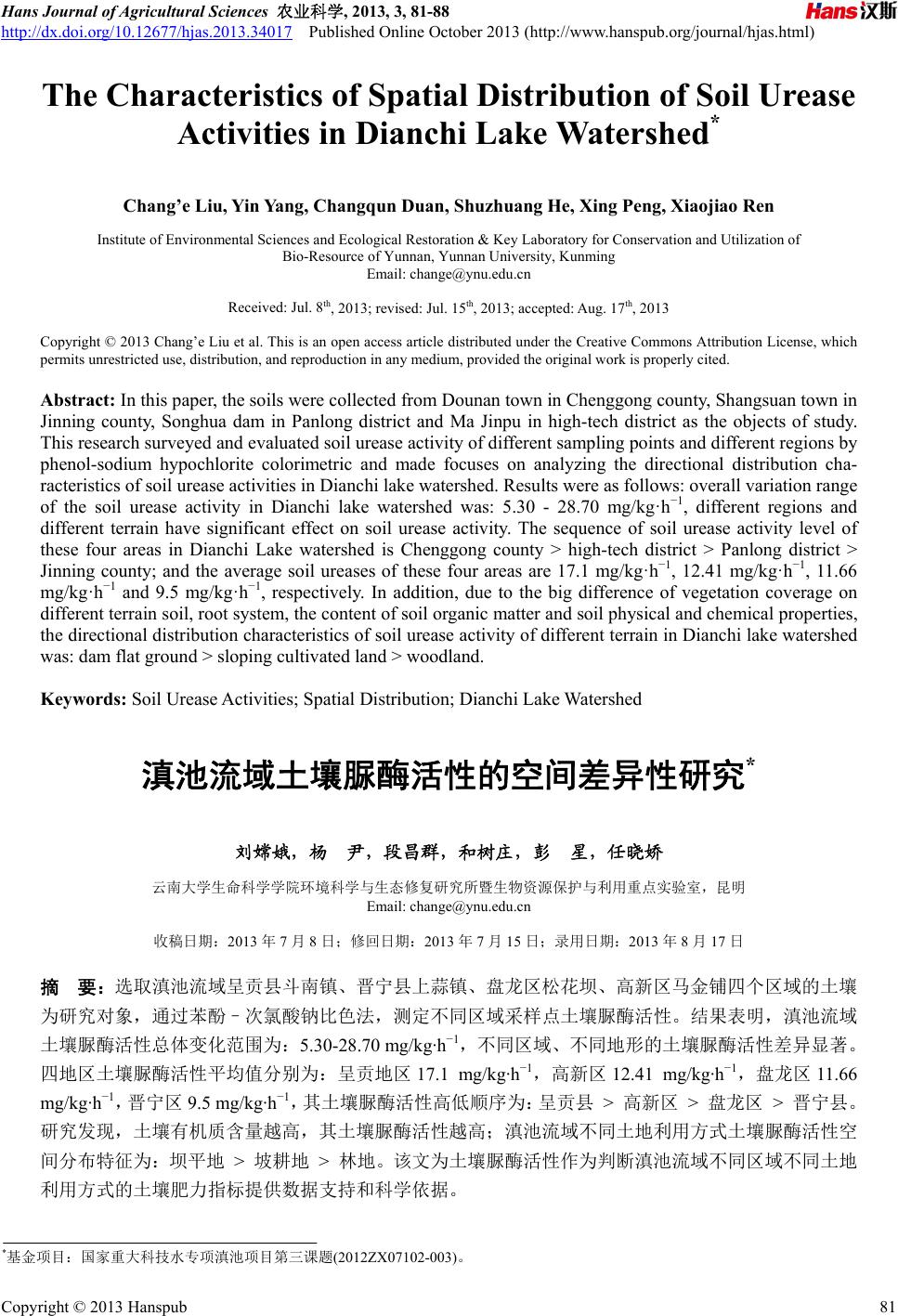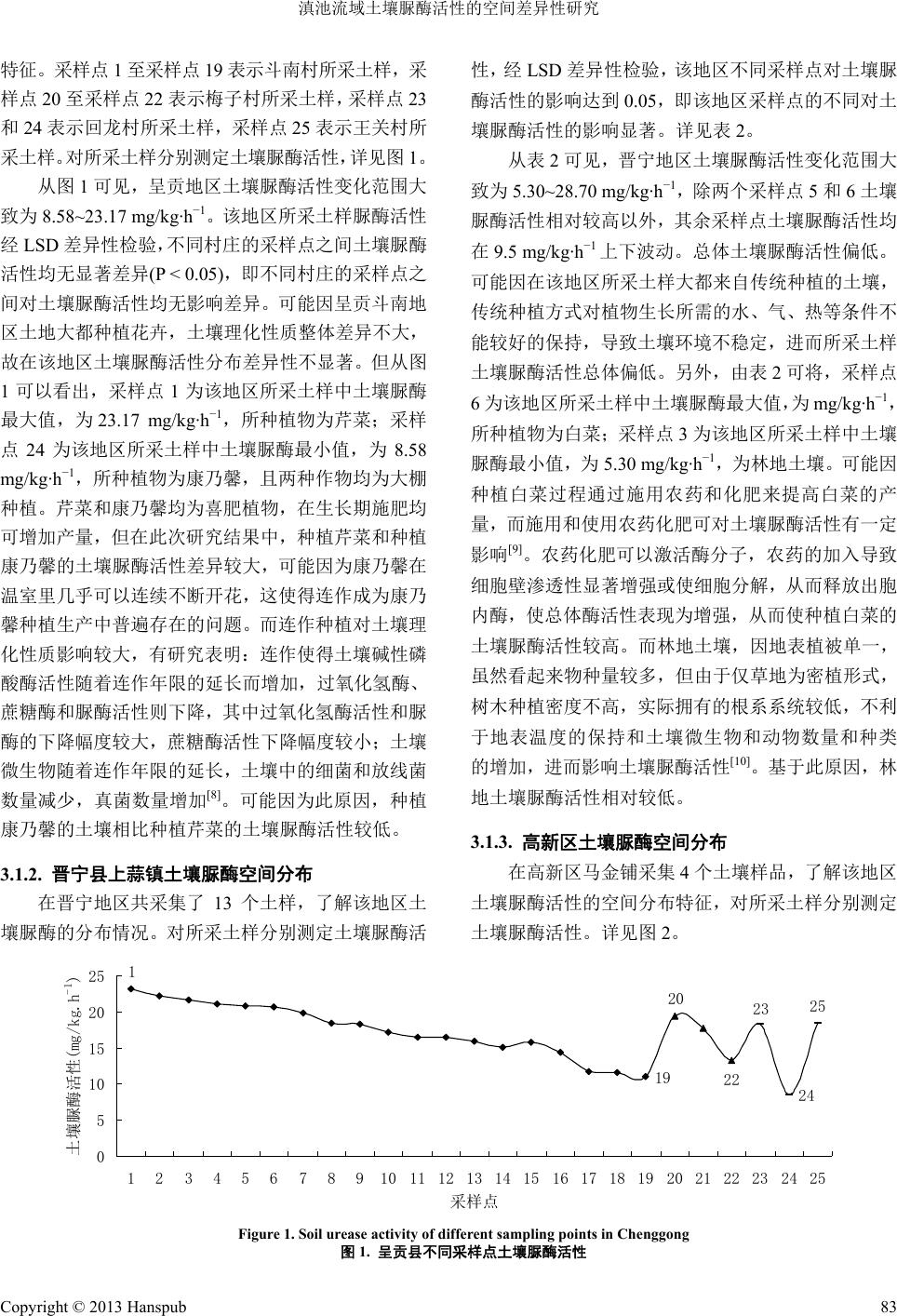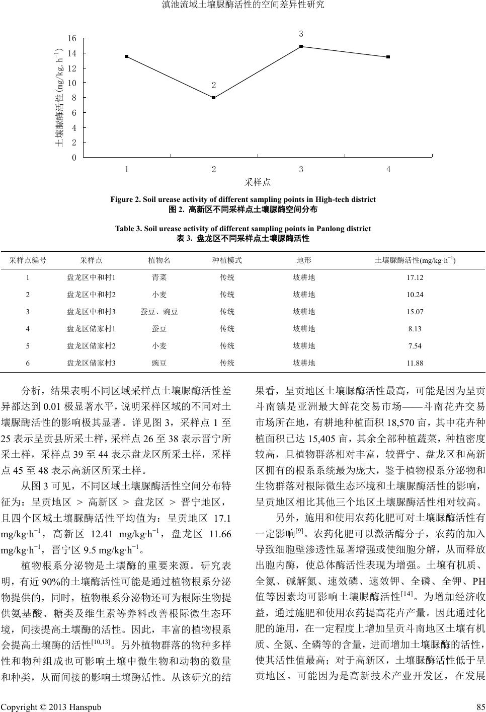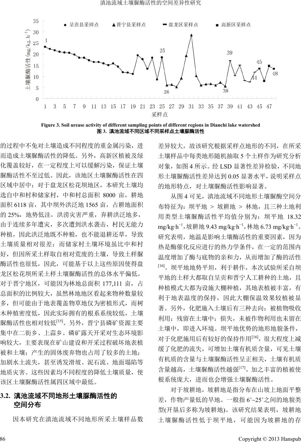 ![]() Hans Journal of Agricultural Sciences 农业科学, 2013, 3, 81-88 http://dx.doi.org/10.12677/hjas.2013.34017 Published Online October 2013 (http://www.hanspub.org/journal/hjas.html) The Characteristics of Spatial Distribution of Soil Urease Activities in Dianchi Lake Watershed* Chang’e Liu, Yin Yang, Changqun Duan, Shuzhuang He, Xing Peng, Xiaojiao Ren Institute of Environmental Sciences and Ecological Restoration & Key Laboratory for Conservation and Utilization of Bio-Resource of Yunnan, Yunnan University, Kunming Email: change@ynu.edu.cn Received: Jul. 8th, 2013; revised: Jul. 15th, 2013; accepted: Aug. 17th, 2013 Copyright © 2013 Chang’e Liu et al. This is an open access article distributed under the Creative Commons Attribution License, which permits unrestricted use, distribution, and reproduction in any medium, provided the original work is properly cited. Abstract: In this paper, the soils were collected from Dounan town in Chenggong county, Shangsuan town in Jinning county, Songhua dam in Panlong district and Ma Jinpu in high-tech district as the objects of study. This research surveyed and evaluated soil urease activity of different sampling points and different regions by phenol-sodium hypochlorite colorimetric and made focuses on analyzing the directional distribution cha- racteristics of soil urease activities in Dianchi lake watershed. Results were as follows: overall variation range of the soil urease activity in Dianchi lake watershed was: 5.30 - 28.70 mg/kg·h−1, different regions and different terrain have significant effect on soil urease activity. The sequence of soil urease activity level of these four areas in Dianchi Lake watershed is Chenggong county > high-tech district > Panlong district > Jinning county; and the average soil ureases of these four areas are 17.1 mg/kg·h−1, 12.41 mg/kg·h−1, 11.66 mg/kg·h−1 and 9.5 mg/kg·h−1, respectively. In addition, due to the big difference of vegetation coverage on different terrain soil, root system, the content of soil organic matter and soil physical and chemical properties, the directional distribution characteristics of soil urease activity of different terrain in Dianchi lake watershed was: dam flat ground > sloping cultivated land > woodland. Keywords: Soil Urease Activities; Spatial Distribution; Dianchi Lake Watershed 滇池流域土壤脲酶活性的空间差异性研究* 刘嫦娥,杨 尹,段昌群,和树庄,彭 星,任晓娇 云南大学生命科学学院环境科学与生态修复研究所暨生物资源保护与利用重点实验室,昆明 Email: change@ynu.edu.cn 收稿日期:2013 年7月8日;修回日期:2013 年7月15 日;录用日期:2013 年8月17 日 摘 要:选取滇池流域呈贡县斗南镇、晋宁县上蒜镇、盘龙区松花坝、高新区马金铺四个区域的土壤 为研究对象,通过苯酚–次氯酸钠比色法,测定不同区域采样点土壤脲酶活性。结果表明,滇池流域 土壤脲酶活性总体变化范围为:5.30-28.70 mg/kg·h−1,不同区域、不同地形的土壤脲酶活性差异显著。 四地区土壤脲酶活性平均值分别为:呈贡地区 17.1 mg/kg·h−1,高新区 12.41 mg/kg·h−1,盘龙区 11.66 mg/k g·h−1,晋宁区 9.5 mg/kg·h−1,其土壤脲酶活性高低顺序为:呈贡县 > 高新区 > 盘龙区 > 晋宁县。 研究发现,土壤有机质含量越高,其土壤脲酶活性越高;滇池流域不同土地利用方式土壤脲酶活性空 间分布特征为:坝平地 > 坡耕地 > 林地。该文为土壤脲酶活性作为判断滇池流域不同区域不同土地 利用方式的土壤肥力指标提供数据支持和科学依据。 *基金项目:国家重大科技水专项滇池项目第三课题(2012ZX07102-003)。 Copyright © 2013 Hanspub 81 ![]() 滇池流域土壤脲酶活性的空间差异性研究 Copyright © 2013 Hanspub 82 关键词:土壤脲酶活性;空间分布;滇池流域 1. 引言 脲酶为尿素胺基水解酶的通称,是一种作用于线 型酰胺的 C-N 键(非肽)的水解酶,可以催化尿素水解 成二氧化碳和氨,是土壤中唯一对重要矿质肥料—— 尿素有重大影响的酶[1]。土壤脲酶作为土壤中重要的 酶之一,在土壤系统氮素循环过程中起着重要作用[2], 特别是在植物尿素利用率方面发挥着关键作用。刘建 新研究表明土壤脲酶反映了土壤肥力在自然条件和 人为作用下的微变化,是敏感的土壤质量指标,可以 用来表示土壤肥力的高低,土壤主成分分析能较为客 观地评价土壤肥力水平[2]。脲酶作为一种重要的土壤 酶,能够促进土壤中含氮有机物尿素分子酰胺肽键的 水解,生成植物根系可吸收利用的氨[3],人们常用土 壤脲酶活性表征土壤的氮素状况。土壤脲酶还可以加 速土壤中潜在养分的有效化。因而检测土壤中脲酶活 性可以作为衡量土壤肥力的指标之一,并能部分反映 土壤生产力[4]。 土壤酶学在环境领域中的应用是新近才被人们 注目的课题,而土壤脲酶活性作为土壤肥力指标的研 究,受到国内外学者的重视。英国、匈牙利等国的专 家对脲酶活性进行了大量研究,初步探明了脲酶与土 壤肥力的关系[5]。对茶园土壤和森林土壤脲酶活性进 行了研究,得出土壤脲酶活性可作为评价土壤肥力的 指标之一的结论[6,7]。但对滇池流域土壤脲酶活性空间 分布方面的研究更少。对此,本文对滇池流域不同区 域土壤脲酶活性进行了初步探讨,通过对不同区域、 不同土地利用类型的土壤脲酶活性的研究分析,旨在 了解滇池流域土壤脲酶活性的空间分布特征,进而为 土壤脲酶活性作为判断土壤肥力的指标提供数据支 持和科学依据。 2. 样地与方法 2.1. 样地概况 滇池流域内 55 个乡(镇、街道办),由于地形地貌、 农业耕作方式具有多样化的特点且对面源污染的贡 献率差异显著,