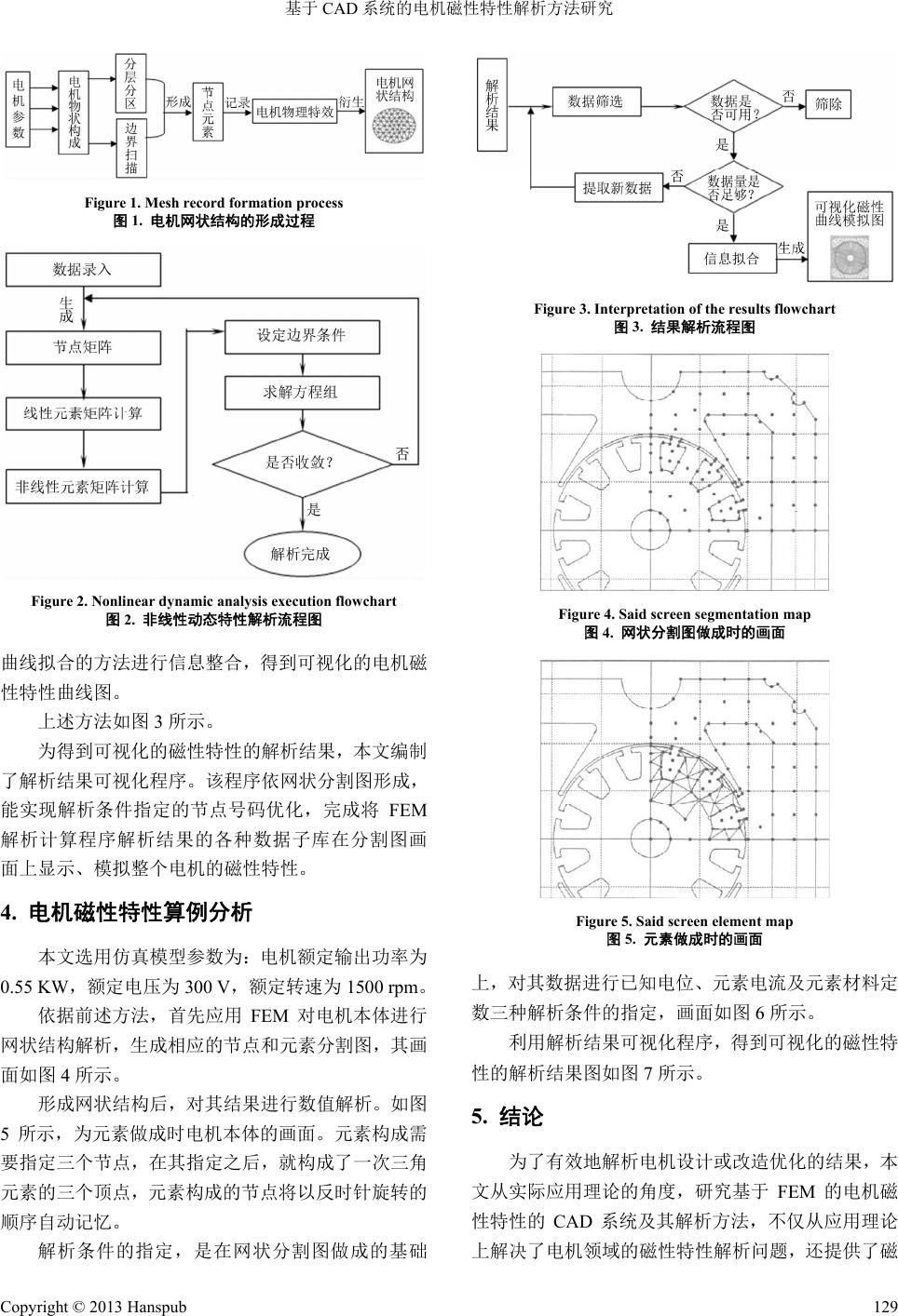 ![]() Smart Grid 智能电网, 2013, 3, 127-130 http://dx.doi.org/10.12677/sg.2013.35023 Published Online October 2013 (http://www.hanspub.org/journal/sg.html) Structuring of Motor Electromagnetism Property CAD Systems and Its Analytic Method* Yi Yang, Zhijian Liu, Lili Yue Faculty of Power Engineering, Kunming University of Science and Technology, Kunming Email: 44947434@qq.com Received: Jul. 29th, 2013; revised: Aug. 24th, 2013; accepted: Sep. 12th, 2013 Copyright © 2013 Yi Yang et al. This is an open access article distributed under the Creative Commons Attribution License, which permits unre- stricted use, distribution, and reproduction in any medium, provided the original work is properly cited. Abstract: This article describes the composition of th e CAD system to solve the electromagnetic characteristics of the motor resolution issues. It researches a motor electromagnetic property of the visual optimization of analytical methods. The study showed that the CAD system can provide the motor magnetic field distribution characteristic visual analog graphics, visual analog graphics based on the magnetic characteristics of the motor can accurately and quickly deter- mine the motor structure to provide reliable motor performance optimization basis for effective and efficient means. Keywords: Motor; Electro-Magnetic Property; CAD System 基于 CAD 系统的电机磁性特性解析方法研究* 杨 毅,刘志坚,岳莉莉 昆明理工大学电力工程学院,昆明 Email: 44947434@qq.com 收稿日期:2013 年7月29 日;修回日期:2013 年8月24 日;录用日期:2013 年9月12 日 摘 要:介绍了 CAD 系统的构成,解决电机的电磁特性解析问题,研究一种可对电机电磁特性进行可视化的优 化解析方法。研究表明,此CAD 系统可提供电机磁场分布特性的可视化模拟图形,根据电机磁场特性的可视化 模拟图形,可以准确、快速地判断出电机结构存在的问题,为电机性能的优化提供可靠的依据及快捷的手段。 关键词:通用电机;电磁特性;CAD 系统 1. 引言 随着科学技术的不断进步,现代化设备对电机的 要求也越来越高,电机小型化、高效率、高速化的要 求在不断提高。与此同时,电机的机械构造及电气构 造也需要不断改进和优化,以满足工业生产需求。因 此,研制性能优越的电机,对电力工业乃至其他相关 工业行业,有着巨大的推动作用。 CAD 系统在电机的研究、开发及制造领域应用非 常广泛。但是,在一般情况下,通常只是用来构建电 机的结构模型,不具备分析电机磁性性征的功能,无 助于电机的功能特性解析[1-3]。本文对电机的构造进行 优化,最主要的环节之一就是分析其磁场特性。如何 检验和分析改进后的电机的磁性特性,是电机理论研 究与实际技术应用相结合的重点问题之一。 本文应用有限单元法[4](Finite Element Method, FEM)和磁回路图的形式[5,6],对电机的磁性特征进行 模拟,并结合现代计算机技术,利用 CAD系统建立 电机磁性特性可视化的模型,提出了相应的解析方 法。 *基金项目:国家自然科学基金项目 ( 51007034 ) 。 Copyright © 2013 Hanspub 127 ![]() 基于 CAD 系统的电机磁性特性解析方法研究 2. 非线性方程组的数值求解 在有限元素法的场合,多元非线性联立方程式常 具有成百上千个变量。可应用牛顿·拉普逊法,对元素 的非线性问题进行求解[5-9]。假设广函数为 F,未知节 点数为 n,应用有限元素法求解的方程式,可用下面 (1)式表示 01,2,, i FD i D n (1) 式中 i F D为有限元素领域中节点的电位 的函数,将这个多变量函数用泰勒展开 可得: 12 ,,, n DD D 11 1 2 1 1 , , nn i n ni iii n i F DD DDFDD D FD DD DD D (2) 对(2)式,略去高次项,可得: 2 1 n i i iii FD FD j F DD D DDDD (3) 在(3)式中,为了简单方便起见,用 () F D代替了 12 ,,, n F DD D,如果将 DD 视为真值则有: 0 i FD D D (4) 于是(4)式可以改写成下式: 2 1 n i iii i F DF D DD D D (5) 将(5)式用矩阵的形式来表示,并用F作为 F D 的省略符号后可得: 22 1 1 11 1 2 22 1 n ii ij n nnn n F D FF D DD DD F FDD DD FF D F DD DDD (6) 可得出(6)式的系数矩阵为对称矩阵。 本文中,首先对全体元素进行计算,求出(6)中的 i F D 和2ij F DD 。然后,将未知节点的电位的 初始值看作为零,在反复计算的过程中,第一次的计 算即可以线性解求。 3. CAD系统及其逻辑指令 依据前述非线形问题的求解方法,构成 FEM 的 软件基础,但是要构成完整的 CAD系统,还须数据 输入及结果解析算法[10-12]。本文将 CAD 系统的功能 进程分成三个,即:网状结构衍生、FEM解析、可视 化模拟结果及解析。 3.1. 数据输入模块 数据输入模块的功能是为满足FEM 解析的需要, 根据不同电机,输入其所有相关参数。这些参数及形 成的网状结构模型,对解析对象的离散化和物理特性 有直接的关联。 在电机网状结构形成前,依据电机各自模块领域 进行分层分区,划定出电机内部结构边界,以形成一 系列的节点和元素。元素划分后,考虑到区域边界和 不同的区域间的边界问题,根据元素的类型和构成节 点,就其特征确定电机坐标。电机网状结构的形成过 程如图 1所示。 3.2. 数值解析模块 数值解析模块的功能是完成 FEM解析中求解未 知变量的计算过程,即求解根据牛拉法、变分法导出 的非线性方程组。 在求解过程中,输入数据为满足分层分区、边界 条件及节点元素特征。其输出数据为网状结构中各元 素及节点未知量所对应的值。在求解对时间有依存性 的数值方程的过程中,本文应用了逐次缓和法等方 法,FEM 解析流程如图 2所示。 3.3. 结果解析模块 结果解析模块的功能是将解析结果进行整合计 算,
