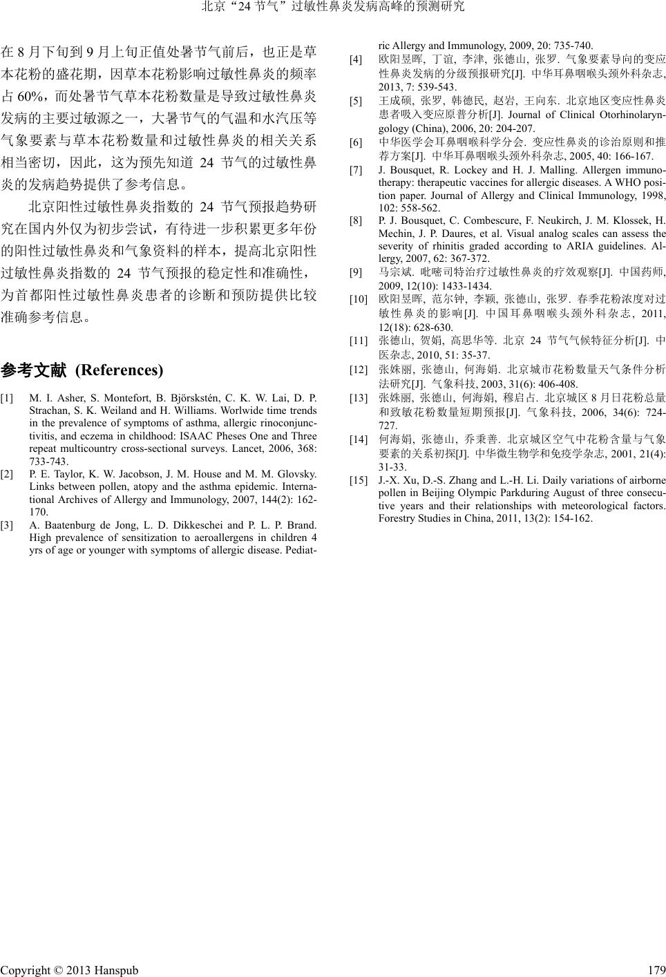 ![]() Climate Change Research Letters 气候变化研究快报, 2013, 2, 174-179 http://dx.doi.org/10.12677/ccrl.2013.24030 Published Online October 2013 (http://www.hanspub.org/journal/ccrl.html) A Study of 24 Sola Terms Prediction of Allergic Rhinitis Peak Incidence in Beijing Yan Liu, Jianhua Zhang, Yi Ding, Deshan Zhang Beijing Meteorological Bureau, Beijing Email: swallow1228@sina.com.cn Received: Aug. 23rd, 2013; revised: Sep. 20th, 2013; accepted: Sep. 28th, 2013 Copyright © 2013 Yan Liu et al. This is an open access article distributed under the Creative Commons Attribution License, which permits unre- stricted use, distribution, and reproduction in any medium, provided the original work is properly cited. Abstract: Based on 24 solar terms, the daily data of four years’ (2007-2010) skin prick test of allergic rhinitis in Beijing Tongren Hospital and the meteorological data of Beijing Observatory were analyzed by correlation analysis, which reached a conclusion that the maximum of allergic rhinitis occurred at the end of heat and the peak of meteorological elements including air temperature, vapor pressure and so on appeared in great heat. It was found that there was a certain correlation between allergic rhinitis in next across solar term and meteorological elements including air temperature and vapor pressure etc. in each solar term. Therefore, 6 nonlinear prediction equations were established and the statistical tests were passed (rα = 0.01 = 0.2670, Fα = 0.01 = 6.965). History matching indicated that the predicted value of allergic rhinitis is consistent with the actual incidence trends. So we draw a conclusion that allergic rhinitis incidence trends could be forecasted by air temperature and vapor pressure in each solar term. Meanwhile, service in- formation about allergic rhinitis prevention could be provided for all levels of health departments and citizens. Keywords: Allergic Rhinitis; Meteorological Elements; Incidence Trends 北京“24 节气”过敏性鼻炎发病高峰的预测研究 刘 燕,张建华,丁 谊,张德山 北京市气象局,北京 Email: swallow1228@sina.com.cn 收稿日期:2013 年8月23 日;修回日期:2013年9月20 日;录用日期:2013年9月28 日 摘 要:根据北京市同仁医院 4年(2007~2010 年)逐日皮肤点刺试验的过敏性鼻炎和北京市观象台的气象要素资 料,按 24 节气纪时法进行统计相关分析,得出过敏性鼻炎的高峰值出现在处暑节气,气温和水汽压等气象要素 的高峰值出现在大暑节气,研究发现各节气的气温和水汽压等气象要素与隔节气的过敏性鼻炎之间存在一定关 联。由此,建立 6个过敏性鼻炎的非线性预报方程,通过了相应的统计学检验(rα = 0.01 = 0.2670,Fα = 0.01 = 6.965)。 历史拟合表明,过敏性鼻炎的预报值与实际发病趋势相符,得出结论,根据节气的水汽压和气温统计值可以预 测未来隔节气的过敏性鼻炎的发病趋势,与此同时,还可为各级卫生部门和市民预防保健提供客观的提示性信 息。 关键词:过敏鼻炎;气象要素;发病趋势 1. 引言 阳性的过敏性鼻炎,是季节性较强的疾病[1-4]。根 据北京市同仁医院 4年的皮肤点刺试验,得到过敏性 鼻炎的历史病例,与北京市观象台的气象要素资料, Copyright © 2013 Hanspub 174 ![]() 北京“24 节气”过敏性鼻炎发病高峰的预测研究 进一步研究 24 节气平均阳性的过敏鼻炎与同期气象 要素的相关关系,建立阳性的过敏性鼻炎的预报方 程,研究结果,可提供下一个节气的阳性过敏性鼻炎 指数的预报,对于当下以“预防为主”的公共卫生宣 传,无论是医疗部门还是公共气象服务,都有着极为 重要的指导意义[5-10]。 2. 资料搜集与统计方法 2.1. 资料来源 皮肤点刺试验的阳性过敏性鼻炎逐日病例,取自 北京市同仁医院的门诊病历档案,时间序列为 2007.02.25~2 010.12.31,搜集到各类病例样本 872 个 ((双休日和法定假日没有病例样本),无缺测。气象因 子使用北京市观象台的观测资料,包括逐日地面基本 气象要素 6项(含1) 日平均气温;2) 日平均相对湿度; 3) 日平均水汽压;4) 日露点温度;5) 日降水量;6) 日 平均风速)。因子样本数共 872 个,资料完整。 2.2. 阳性的过敏性鼻炎病分类 日阳性的过敏性鼻炎数包含花粉阳性的过敏鼻 炎、尘螨阳性的过敏鼻炎、霉菌阳性的过敏鼻炎、食 品阳性的过敏鼻炎、动物毛阳性的过敏鼻炎,上述的 5种阳性过敏性鼻炎的过敏源分类描述为:1) 花粉阳 性的过敏性鼻炎过敏源有树科、禾本科、艾蒿、蒲公 英、大豚草、藜科、葎草、刺槐、德国小蠊、长叶车 前草等;2) 尘螨阳性的过敏鼻炎:粉尘螨、屋尘螨; 3) 霉菌阳性的过敏鼻炎:新月弯孢属、白色念珠菌、 特异青霉、交链孢霉菌、烟曲霉菌等;4) 食品阳性的 过敏鼻炎:咖喱、水果、肉类、羊肉、猪肉、鳕鱼、 鲤鱼、小虾、凤梨、苹果、香蕉、草莓、花生、桃子、 番茄、核桃、葡萄、土豆、菠菜、小麦、牛奶、鸡蛋 等;5) 动物毛阳性的过敏性鼻炎。 2.3. 24节气纪时阳性的过敏性鼻炎的统计方法 根据太阳黄道上的位置,把一年划分 24个彼此 相等的段落。也就是把黄道分成 24 个等份,每个等 份占黄经 15˚。太阳每年通过春分点,黄经为 0˚,以 后每运行15˚,即为一个节气。“24 节气”综合了天文 学、古中医学、物侯学和农作物生长特点等多方面知 识,它比较准确地反映了一年中的大气运动的自然规 律。由此,整理了 4年逐日阳性的过敏性鼻炎数据, 在查对万年历中“24节气”的初始日期基础上,统计 出每年 24 个节气的阳性的过敏性鼻炎平均值。见(1) 式。 24 24 1 1 AR AR N iij j N (1) 式中的 24 AR i为某年某节气过敏性鼻炎的
