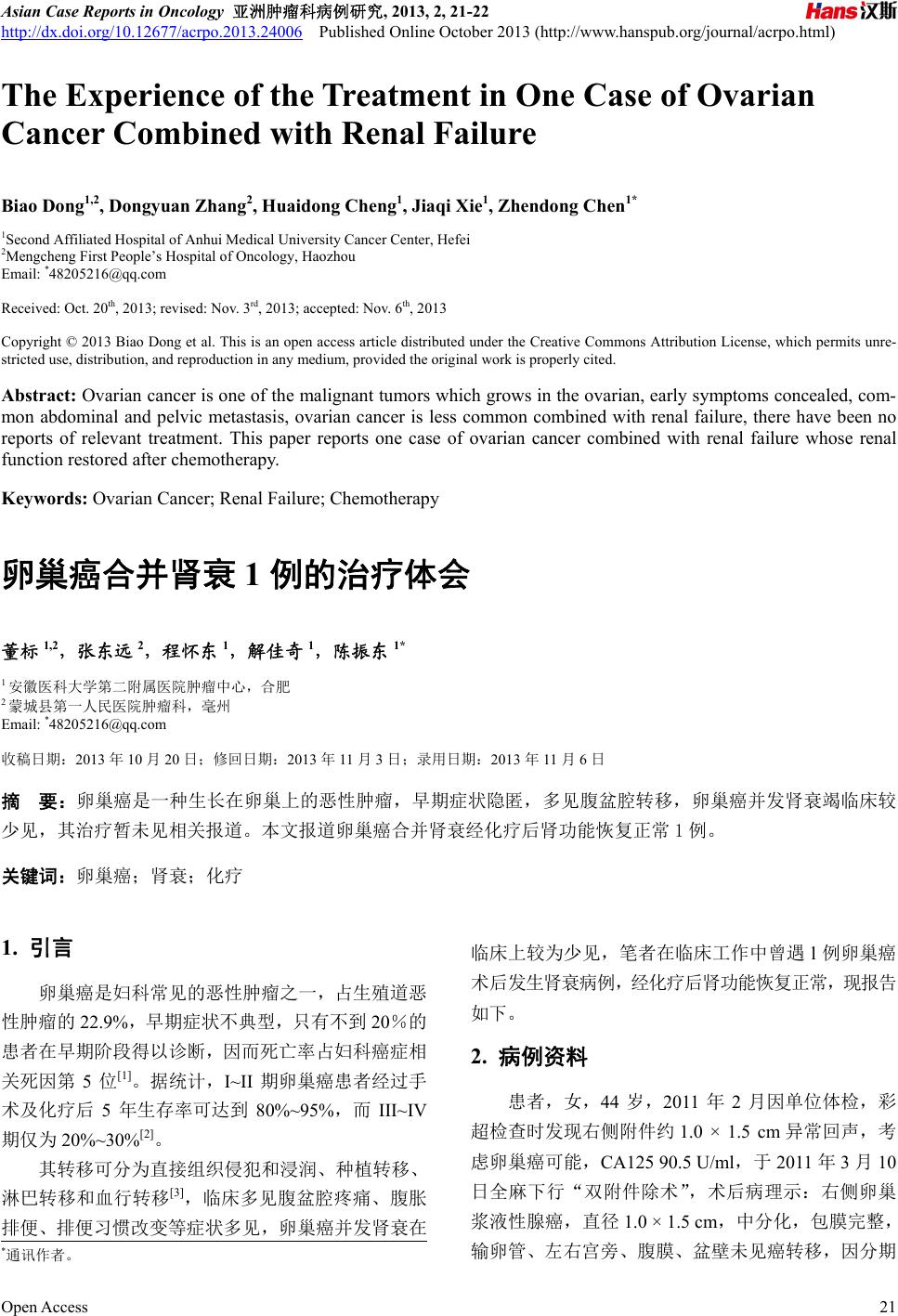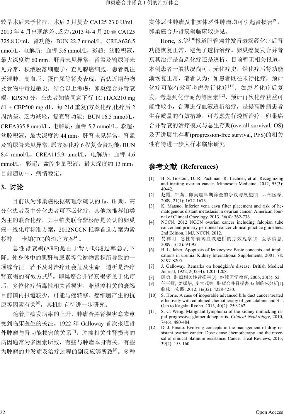 ![]() Asian Case Reports in Oncology 亚洲肿瘤科病例研究, 2013, 2, 21-22 http://dx.doi.org/10.12677/acrpo.2013.24006 Published Online October 2013 (http://www.hanspub.org/journal/acrpo.html) The Experience of the Treatment in One Case of Ovarian Cancer Combined with Renal Failure Biao Don g1,2, Do ng yuan Zhang2, Huaidong Cheng1, Jiaqi Xie1, Zhendo ng Chen1* 1Second Affiliated Hospital of Anhui Medical University Cancer Center, Hefei 2Mengcheng First People’s Hospital of Oncology, Haozhou Email: *48205216@qq.com Received: Oct. 20th, 2013; revised: Nov. 3rd, 2013; accepted: Nov. 6th, 2013 Copyright © 2013 Biao Dong et al. This is an open access article distributed under the Creative Commons Attribution License, which permits unre- stricted use, distribution, and reproduction in any medium, provided the original work is properly cited. Abstract: Ovarian cancer is one of the malignant tumors which grows in the ovarian, early symptoms concealed, com- mon abdominal and pelvic metastasis, ovarian cancer is less common combined with renal failure, there have been no reports of relevant treatment. This paper reports one case of ovarian cancer combined with renal failure whose renal function restored after chemotherapy. Keywords: Ovarian Cancer; Renal Failure; Chemotherapy 卵巢癌合并肾衰 1例的治疗体会 董标 1,2,张东远 2,程怀东 1,解佳奇 1,陈振东 1* 1安徽医科大学第二附属医院肿瘤中心,合肥 2蒙城县第一人民医院肿瘤科,毫州 Email: *48205216@qq.com 收稿日期:2013 年10 月20 日;修回日期:2013 年11 月3日;录用日期:2013 年11 月6日 摘 要:卵巢癌是一种生长在卵巢上的恶性肿瘤,早期症状隐匿,多见腹盆腔转移,卵巢癌并发肾衰竭临床较 少见,其治疗暂未见相关报道。本文报道卵巢癌合并肾衰经化疗后肾功能恢复正常1例。 关键词:卵巢癌;肾衰;化疗 1. 引言 卵巢癌是妇科常见的恶性肿瘤之一,占生殖道恶 性肿瘤的22.9%,早期症状不典型,只有不到 20%的 患者在早期阶段得以诊断,因而死亡率占妇科癌症相 关死因第 5位[1]。据统计,I~II 期卵巢癌患者经过手 术及化疗后 5年生存率可达到 80%~95%,而 III~IV 期仅为 20%~30%[2]。 其转移可分为直接组织侵犯和浸润、种植转移、 淋巴转移和血行转移[3],临床多见腹盆腔疼痛、腹胀 排便、排便习惯改变等症状多见,卵巢癌并发肾衰在 临床上较为少见,笔者在临床工作中曾遇 l例卵巢癌 术后发生肾衰病例,经化疗后肾功能恢复正常,现报告 如下 。 2. 病例资料 患者,女,44 岁,2011年2月因单位体检,彩 超检查时发现右侧附件约 1.0 × 1.5 cm异常回声,考 虑卵巢癌可能,CA125 90.5 U/ml,于 2011 年3月10 日全麻下行“双附件除术”,术后病理示:右侧卵巢 浆液性腺癌,直径 1. 0 × 1.5 cm,中分化,包膜完整, 输卵管、左右宫旁、腹膜、盆壁未见癌转移,因分期 *通讯作者。 Open Access 21 ![]() 卵巢癌合并肾衰 1例的治疗体会 较早术后未予化疗,术后 2月复查CA125 23.0 U/ml。 2013 年4月出现纳差、乏力,2013 年4月20查CA125 325.8 U/ml,肾功能:BUN 22.7 mmol/L,CREA626.5 umol/L,电 解 质 :血钾5.6 mmol/L,彩超:盆腔积液, 最大深度约 60 mm,肝肾未见异常,肾盂及输尿管未 见异常,积液脱落细胞学:查见腺癌细胞。患者既往 无浮肿、高血压、蛋白尿等肾炎表现,否认近期药物 及食物中毒过敏史,结合以上考虑:卵巢癌合并肾衰 竭,KPS70 分,在患者知情同意下行TC (TAX210 mg d1 + CBP500 mg d1,每21d 重复)方案化疗,化疗后 2 周纳差、乏力减轻,复查肾功能:BUN 16 .5 mmol/L, CREA335.8 umol/L,电解质:血钾 5.2 mmol/ L ,彩超: 盆腔积液,最大深度约 44 mm,肝肾未见异常,肾盂 及输尿管未见异常,原方案化疗 6程复查肾功能:BUN 8.4 mmol/L,CREA115.9 umol/L,电解质:血钾 4.6 mmol/L,彩超:盆腔少量积液,最大深度约 13 mm, 目前随访中,病情稳定。 3. 讨论 目前认为卵巢癌根据病理学确认的 Ia、Ib 期、高 分化患者及中分化患者可不必化疗,其他均推荐铂类 为主的联合化疗,其中铂类联合紫杉醇是公认的卵巢 癌一线化疗标准方案,2012NCCN 推荐首选方案为紫 杉醇 + 卡铂(TC)的治疗方案[4]。 急性肾衰竭(ARF)是由于肾小球滤过率急剧下 降。使身体中的肌酐与尿素等代谢物蓄积所导致的一 项综合征。若不及时治疗还会危及生命。透析是治疗 肾衰竭的有效方式[5]。卵巢癌合并肾衰竭多见于化疗 后,多位化疗药毒性相关肾损害,卵巢癌相关的衰竭 目前国内报道较少,可能与癌转移、癌细胞产生的抗 原等因素有关[6],其机制有待进一步研究。 随着肿瘤发病率的上升,肿瘤合并肾损害愈来愈 受到临床医生的关注。1922 年Galloway首次报道肾 外肿瘤与肾功能损害的关系[7],肿瘤相关性肾损害的 病因通常为多因素所致,有些与肿瘤本身有关,有些 为肿瘤的并发症及治疗过程的副反应等所致[8]。多种 实体恶性肿瘤及非实体恶性肿瘤均可引起肾损害[9], 卵巢癌合并肾衰竭临床较少见。 Horie, S.等[10]报道胆管癌并发肾衰竭经化疗后肾 功能恢复正常,避免了透析治疗。卵巢癌复发合并肾 衰其治疗是首选化疗还是透析,目前暂无相关报道, 本例患者一般状况尚可、无化疗史,经化疗后肾功能 渐恢复正常,笔者认为:如患者既往未行化疗,预计 化疗可能有效可考虑先行化疗[11] ;如患者化疗后复 发,考虑到化疗耐药等因素[12],预计再次化疗获益可 能性较小,合理进行血液透析治疗,是提高肿瘤患者 生存质量的有效措施,可考虑先行透析治疗。卵巢癌 合并肾衰的治疗模式与总生存期(overall survival, OS) 及无进展生存期(progression-free survival, PFS)的相关 性有待进一步大样本临床