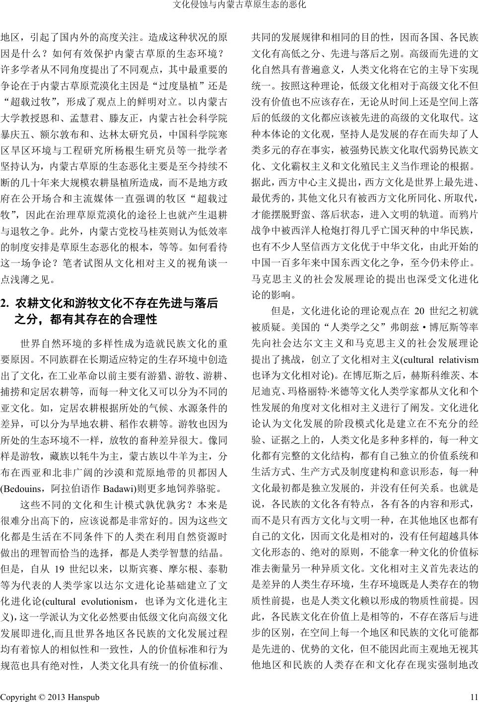 ![]() Modern Anthropology 现代人类学, 2013, 1, 10-16 http://dx.doi.org/10.12677/ma.2013.12003 Published Online October 2013 (http://www.hanspub.org/journal/ma.html) Cultural Erosion and Deterioration of Grasslands in Inner Mongolia —From the Perspective of Cultural Relativism to Look at the Ecological Problem in Grasslands of Inner Mongolia Shujie Luo Guangxi University, Nanning Email: zhholly@163.com Received: Oct. 23rd, 2013; revised: Oct. 25th, 2013; accepted: Oct. 30th, 2013 Copyright © 2013 Shujie Luo. This is an open access article distributed under the Creative Commons Attribution License, which permits unrestricted use, distribution, and reproduction in any medium, provided the original work is properly cited. Abstract: According to the theory of cultural relativism, the existence of farming culture and nomadic culture is justified, which has no advanced or backward distinction. In the use of culture hegemonism and culture colonialism, method to replace the different culture regardless of natural condition and historical tradition is likely to make a disaster to the development of our nation. Today, the deterioration of grasslands in Inner Mongolia is closely related to the grassland culture which erosioned and extruded by farming culture. Recorrecting the view of grassland culture, inheriting and carrying forward the essence of them, we can finally protect the ecology. Keywords: Inner Mongolia Grassland; Ecological Protection; Cultural Relativism; Cultural Erosion 文化侵蚀与内蒙古草原生态的恶化 ——从文化相对主义的视角看内蒙古草原生态问题 罗树杰 广西大学,南宁 Email: zhholly@163.com 收稿日期:2013 年10月23日;修回日期:2013 年10月25日;录用日期:2013 年10月30日 摘 要:按照文化相对主义的理论,农耕文化和游牧文化不存在先进与落后之分,都有其存在的合理 性。不顾自然条件和历史传统,采用文化霸权主义和文化殖民主义的方法实行文化取代,都可能会给 民族发展带来灾难。内蒙古草原生态恶化成今天这个样子,与草原文化被农耕文化所挤压、侵蚀有着 密切的关系。要保护草原生态,必须重新正确看待草原文化,继承和弘扬其中的精华。 关键词:内蒙古草原;生态保护;文化相对主义;文化侵蚀 1. 引言 尽管当今中国的环境立法从法律体系来看越来 越完备、越来越好,环境保护的科技水平越来越高, 然而中国的草原特别是最大的草原——内蒙古草原 环境状况、生态问题却每况愈下,严重地影响着当地 各族居民的生产和生活,同时内蒙地区的沙尘暴和荒 漠化对京津地区、邻近省市的生态安全也构成了威 胁,并且也已经殃及朝鲜半岛、日本列岛等周边国家、 Copyright © 2013 Hanspub 10 ![]() 文化侵蚀与内蒙古草原生态的恶化 地区,引起了国内外的高度关注。造成这种状况的原 因是什么?如何有效保护内蒙古草原的生态环境? 许多学者从不同角度提出了不同观点,其中最重要的 争论在于内蒙古草原荒漠化主因是“过度垦植”还是 “超载过牧”,形成了观点上的鲜明对立。以内蒙古 大学教授恩和、孟慧君、滕友正,内蒙古社会科学院 暴庆五、额尔敦布和、达林太研究员,中国科学院寒 区旱区环境与工程研究所杨根生研究员等一批学者 坚持认为,内蒙古草原的生态恶化主要是至今持续不 断的几十年来大规模农耕垦植所造成,而不是地方政 府在公开场合和主流媒体一直强调的牧区“超载过 牧”,因此在治理草原荒漠化的途径上也就产生退耕 与退牧之争。此外,内蒙古党校马桂英则认为低效率 的制度安排是草原生态恶化的根本,等等。如何看待 这一场争论?笔者试图从文化相对主义的视角谈一 点浅薄之见。 2. 农耕文化和游牧文化不存在先进与落后 之分,都有其存在的合理性 世界自然环境的多样性成为造就民族文化的重 要原因。不同族群在长期适应特定的生存环境中创造 出了文化,在工业革命以前主要有游猎、游牧、游耕、 捕捞和定居农耕等,而每一种文化又可以分为不同的 亚文化。如,定居农耕根据所处的气候、水源条件的 差异,可以分为旱地农耕、稻作农耕等。游牧也因为 所处的生态环境不一样,放牧的畜种差异很大。像同 样是游牧,藏族以牦牛为主,蒙古族以牛羊为主,分 布在西亚和北非广阔的沙漠和荒原地带的贝都因人 (Bedouins,阿拉伯语作 Badawi)则更多地饲养骆驼。 这些不同的文化和生计模式孰优孰劣?本来是 很难分出高下的,应该说都是非常好的。因为这些文 化都是生活在不同条件下的人类在利用自然资源时 做出的理智而恰当的选择,都是人类学智慧的结晶。 但是,自从 19 世纪以来,以斯宾赛、摩尔根、泰勒 等为代表的人类学家以达尔文进化论基础建立了文 化进化论(cultural evolutionism,也译为文化进化主 义),这一学派认为文化必然要由低级文化向高级文化 发展即进化,而且世界各地区各民族的文化发展过程 均有着惊人的相似性和一致性,人的价值标准和行为 规范也具有绝对性,人类文化具有统一的价值标准、 共同的发展规律和相同的目的性,因而各国、各民族 文化有高低之分、先进与落后之别。高级而先进的文 化自然具有普遍意义,人类文化将在它的主导下实现 统一。按照这种理论,低级文化相对于高级文化不但 没有价值也不应该存在,无论从时间上还是空间上落 后的低级的文化都应该被先进的高级的文化取代。这 种本体论的文化观,坚持人是发展的存在而失却了人 类多元的存在事实,被强势民族文化取代弱势民族文 化、文化霸权主义和文化殖民主义