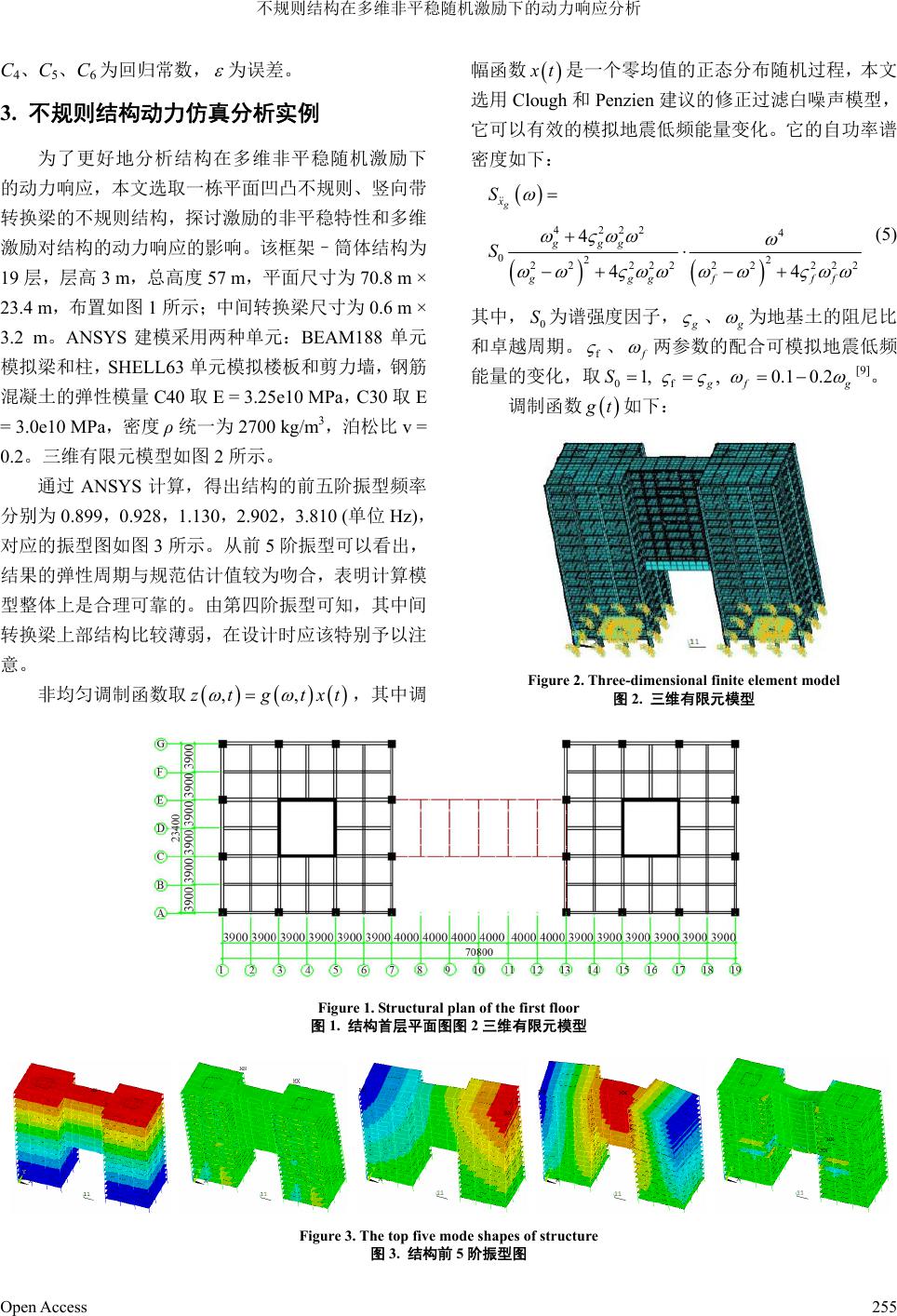 ![]() Hans Journal of Civil Engineering 土木工程, 2013, 2, 253-258 http://dx.doi.org/10.12677/hjce.2013.25043 Published Online November 2013 (http://www.hanspub.org/journal/hjce.html) Analysis for Dynamic Response of Irregular Structure under Multi-Dimensional Non-Stationary Random Excitations* Mingsheng Fang, Zuoyu Sun#, Hui Wang College of Civil Engineering, Guangzhou University, Guangzhou Email: #sunzuoyu@163.com Received: Sep. 13th, 2013; revised: Oct. 8th, 2013; accepted Oct. 17th, 2013 Copyright © 2013 Mingsheng Fang. This is an open access article distributed under the Creative Commons Attribution License, which permits unre- stricted use, distribution, and reproduction in any medium, provided the original work is properly cited. Abstract: Dynamic responses analysis of an irregular structure under multi-dimensional seismic excitations is studied, in which the seismic excitations are constructed by equivalent excitation method, while the non-stationary features of the input power spectral density both in time domain and frequency domain are considered, and the characteristics of local site are also incorporated in the model. The simulation of a typical frame-tube building is carried out; the results demonstrate that those factors mentioned are very essential to the dynamic responses of the structure. Keywords: Irregular Structure; Dynamic Response; Non-Stationary; Equivalent Excitation 不规则结构在多维非平稳随机激励下的动力响应分析* 方明胜,孙作玉#,王 晖 广州大学土木工程学院,广州 Email: #sunzuoyu@163.com 收稿日期:2013 年9月13 日;修回日期:2013年10 月8日;录用日期:2013 年10月17 日 摘 要:本文着重研究不规则结构在多维地震动激励下的动力响应分析,基于等效激励法构造了多维地震动激 励,考虑了随机激励功率谱在时域和频域上的非平稳性,同时模型中也考虑了场地等因素的影响。对一个典型 的框架–筒体不规则结构进行了数值仿真,结果表明同时考虑激励的非平稳特性和多维激励对结构的动力响应 至关重要。 关键词:不规则结构;动力响应;非平稳;等效激励法 1. 引言 随着现代建筑结构技术的发展,高耸大跨等结构 日益增多,同时由于对建筑美学和实际应用的功能需 求,不规则结构也得到了广泛的应用,如国家歌剧院、 中央电视台总部大楼、上海证券大厦等。对于这类结 构,详细地分析其在多维地震激励作用下动力响应具 有十分重要的科学意义和工程价值。近年来,国内外 学者在此方面做了一系列的探讨,取得了诸多研究成 果[1-3],但多数局限于单维地震激励分析或者平稳随机 震动分析,同时考虑激励的非平稳特性和多维激励对 结构的动力响应的影响并不多见。而真实地震激励往 往是多维、非平稳的,并和建筑所在场地以及震中距 等诸多因素有关。李宏男进行了多维地震激励的研 究,但没有考虑激励的非平稳特性[4]。林家浩在传统 理论的基础上提出了虚拟激励法[5],大大提高了计算 效率和精度,但并没有解决激励的非平稳特性。孙作 *基金项目:国家自然科学基金资助项目(51178127)。 #通讯作者。 Open Access 253 ![]() 不规则结构在多维非平稳随机激励下的动力响应分析 玉在虚拟激励法的基础上提出了等效激励法[6],进一 步地提高了计算效率,并考虑了激励能量的在时域上 的非平稳特性,但忽略掉了随机激励中振动能量随频 率分布的非平稳性。为此,他进一步提出了考虑双非 平稳性的等效地震动激励的构造方法[7],即基于等效 激励法,运用连续小波变换理论构造了多维等效非平 稳演变随机地震激励,实现了随机激励的能量在时域 和频域上的非平稳性。本文采用了这种方法,构造了 多维地震动激励,同时考虑场地特性、震中距、震级 等因素的影响,更真实地模拟了实际地震波。对一个 典型的不规则结构进行了数值仿真分析,探讨了这些 因素对结构动力响应的影响。 2. 多维非平稳激励的构造 2.1. 等效非平稳随机激励的构造 结构受地震、强风等随机激励作用往往持续时间 较短,以至于激励的平稳特性假设不能成立。若再考 虑震中距与震级对地震动特性的影响,这一矛盾将更 加突出。因此施加于建筑结构上的大多数外部激励都 是非平稳的随机过程。由于演变功率谱的复调制函数 难以确定,因此在工程应用和大多数的理论研究中, 往往忽略掉随机激励中振动能量随频率分布的非平 稳性,将实际的双非平稳激励简化为了强度非平稳激 励,这样必然带来计算上的误差。最近孙作玉教授提 出了能同时考虑随机激励的能量在时域和频域上的 双平稳性的等效非平稳演变随机地震激励[7],实现了 激励的双非平稳特性。其主要思路是,基于虚拟激励 法可以构造出虚拟激励 it xx Sgte ,同理可以构 造等效激励 T it xx Sgte d ,运用非平稳功 率谱密度函数 来处理更为真实的情况,通过 连续小波变换同时考虑幅值和相位。其中 a为伸缩因 子,a > 0, , xx S t 为偏移,对 f t进行连续小波变换表达 式如下: ,, * ,, 1d aa Cft tft t t f t a a t (1) 其中*表示复共轭。这个公式进行逆傅里叶变换后: * , 1ˆˆ ,, 2π it a Cfttftaa e 其中 ˆ, f t 和 ˆ 为傅里叶变换的信号和小波。 在逆傅里叶变换中的是时间变量平移参数 t。这 表明我们可以通过逆傅里叶变换对其进行连续小波 变换,其中 ˆ,, i xx f tSte , 。 0, 2π 对于连续小波变换,小波函数必须经过精心挑 选,本文使用 Morelet 函数。在进化功率谱密度中给 出了圆频率、时间、CWT 系数,确定计算的尺度 范 围和位置,小波系数可以采用MATLAB 小波工具箱 