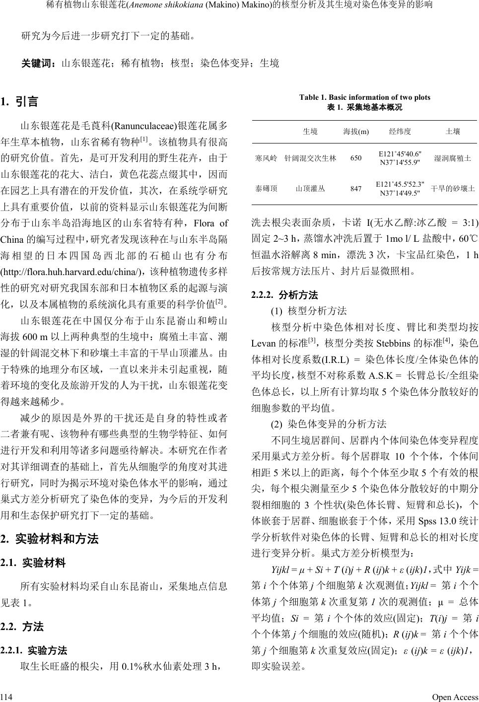 ![]() Botanical Research 植物学研究, 2013, 2, 113-116 http://dx.doi.org/10.12677/br.2013.25020 Published Online November 2013 (http://www.hanspub.org/journal/br.html) Karyotype Analysis and Influence of Habitats on Chromosomal Variation of Rare Plant Anemone shikokiana (Makino) Makino* Zhi Wang, Yujuan Pang, Chuanlin Liu, Shuhong Zhuang, Fuhua Bian College of Life Sciences, Yantai University, Yantai Email: fh_bian@163.com Received: Sep. 22nd, 2013; revised: Oct. 24th, 2013; accepted: Nov. 2nd, 2013 Copyright © 2013 Zhi Wang et al. This is an open access article distributed under the Creative Commons Attribution License, which permits unrestricted use, distribution, and reproduction in any medium, provided the original work is properly cited. Abstract: Anemone shikokiana (Makino) Makino, which has important research values, is a rare plant. The species has two different habitats, the shrubs in mountaintop and understorey of the conifer and broad-leaf mixed forest. Karyotype is very important for the other researches of a plant. The chromosome numbers and karyotype of A. shikokiana were firstly studied using a traditional squash method and Leven’s karyotype analysis standard. The results showed that the karyotype of metaphase chromosomes in somatic cells is as follows: the number of chromosomes is 14, karyotypic formula is 2n = 2X = 14 = 12m + 2t, the A.S.K% is 56.5%, and the relative length of chromosome is 2n = 2X = 14 = 12L + 2M1. For exploring the influences of habitats on chromosomal variation, the morphology of chromosomes was analysed by nested analysis. The results showed that chromosomal variation is not evident between populations in different habitats, but obvious within the same population. So we think that chromosomal variation of A. shikokiana presents in the small scope, and chromosomal variation in large scale may cancel each other out because of enough large scale. This study will provide the basis and reference for future work on A. shikokiana. Keywords: Anemone shikokiana; Rare Plant; Karyotype; Chromosomal Variation; Habitat 稀有植物山东银莲花(Anemone shikokiana (Makino) Makino)的核型分析及其生境对染色体变异的影响* 王 鸷,逄玉娟,刘传林,庄树宏,卞福花 烟台大学生命科学学院,烟台 Email: fh_bian@163.com 收稿日期:2013 年9月22 日;修回日期:2013 年10 月24 日;录用日期:2013 年11月2日 摘 要:山东银莲花(Anemone shikokiana)分布极其狭域,典型的稀有物种,具有很高的研究价值。主 要分布于含有大量腐殖土的针阔混交林下和含砂壤土的干旱山顶灌丛。植物的核型对其后续研究至关 重要,本研究采用常规压片法和Levan 的核型分析方法,首次研究了山东银莲花的染色体数目及核型, 结果表明:体细胞中期染色体数目为 14,核型公式为 2n = 2X = 14 = 12m + 2t,核型为“2A”型,核 型不对称系数(A.S.K%)为56.5%,染色体相对长度组成为2n = 2X = 14 = 12L + 2M1。为了探索生境对 染色体的影响,对染色体的性状进行了巢式方差分析,发现不同生境的居群间染色体形态和大小变异 不显著,居群内染色体的形态和大小存在一定程度的变异,表明山东银莲花染色体的变异存在于小尺 度范围内,大尺度范围的变异可能由于足够大的群体足够多的个体而导致染色体水平的相互抵消。本 *基金项目:国家自然科学基金项目 ( 31100395 ) 科技基础性工作专项 ( 2013FY112100 ) 。 Open Access 113 ![]() 稀有植物山东银莲花(Anemone shikokiana (Makino) Makino)的核型分析及其生境对染色体变异的影响 Open Access 114 研究为今后进一步研究打下一定的基础。 关键词:山东银莲花;稀有植物;核型;染色体变异;生境 1. 引言 山东银莲花是毛莨科(Ranunculaceae) 银莲 花属多 年生草本植物,山东省稀有物种[1]。该植物具有很高 的研究价值。首先,是可开发利用的野生花卉,由于 山东银莲花的花大、洁白,黄色花蕊点缀其中,因而 在园艺上具有潜在的开发价值,其次,在系统学研究 上具有重要价值,以前的资料显示山东银莲花为间断 分布于山东半岛沿海地区的山东省特有种,Flora of China 的编写过程中,研究者发现该种在与山东半岛隔 海相望的日本四国岛西北部的石槌山也有分布 (http://flora.huh.harv ard.edu/chin a/),该种植物遗传多样 性的研究对研究我国东部和日本植物区系的起源与演 化,以及本属植物的系统演化具有重要的科学价值[2]。 山东银莲花在中国仅分布于山东昆嵛山和崂山 海拔 600 m 以上两种典型的生境中:腐殖土丰富、潮 湿的针阔混交林下和砂壤土丰富的干旱山顶灌丛。由 于特殊的地理分布区域,一直以来并未引起重视,随 着环境的变化及旅游开发的人为干扰,山东银莲花变 得越来越稀少。 减少的原因是外界的干扰还是自身的特性或者 二者兼有呢、该物种有哪些典型的生物学特征、如何 进行开发和利用等诸多问题亟待解决。本研究在作者 对其详细调查的基础上,首先从细胞学的角度对其进 行研究,同时为揭示环境对染色体水平的影响,通过 巢式方差分析研究了染色体的变异,为今后的开发利 用和生态保护研究打下一定的基础。 2. 实验材料和方法 2.1. 实验材料 所有实验材料均采自山东昆嵛山,采集地点信息 见表 1。 2.2. 方法 2.2.1. 实验方法 取生长旺盛的根尖,用0.1%秋水仙素处理3 h, Table 1. Basic information of two plots 表1. 采集地基本概况 生境 海拔(m) 经纬度 土壤 寒风岭 针阔混交次生林650 E121˚45'40.6'' N37˚14'55.9'' 湿润腐殖土 泰礡顶 山顶灌丛 847 E121˚45.5'52.3'' N37˚14'49.5'' 干旱的砂壤土 洗去根尖表面杂质,卡诺 I(无水乙醇:冰乙酸 = 3:1) 固定 2~3 h,蒸馏水冲洗后置于 1mo l/ L 盐酸中,60℃ 恒