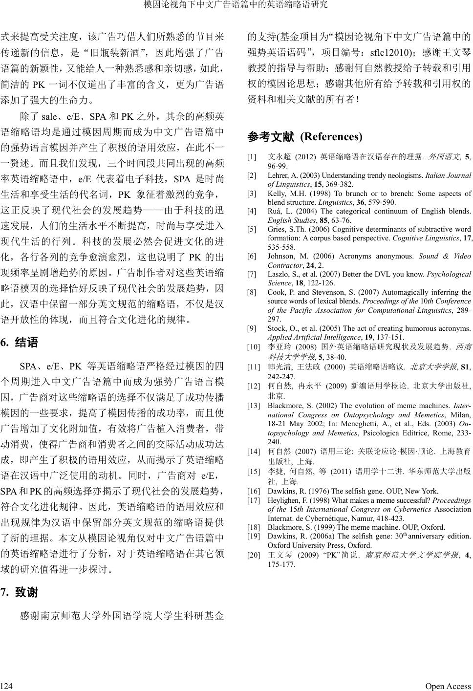 ![]() Modern Linguistics现代语言学, 2013, 1, 119-124 http://dx.doi.org/10.12677/ml.2013.13022 Published Online November 2013 (http://www.hanspub.org/journal/ml.html) A Brief Investigation into English Abbreviations Embedded in Chinese Ads from the Perspective of Memetics* Huanhuan Hou, Wenqin Wang School of Foreign Languages and Cultures, Nanjing Normal University, Nanjing Email: happyhuan99@163. com, 04188@njnu.edu.cn Received: Oct. 8th, 2013; revised: Oct. 30th, 2013; accep ted: Nov. 8th, 2013 Copyright © 2013 Huanhuan Hou, Wenqin Wang. This is an open access article distributed under the Creative Commons Attribution License, which permits unrestricted u se, distribution, and reproduction in any medium, provided the original work is properly cited. Abstract: English abbreviations have been largely embedded into Chinese since they apply with the “principles of economy” in life, and they are of interest to researchers. By making an investigation into the data of Chinese advertisements embedded with English abbreviations from popular newspapers and based on the theory of memetics, the present paper hopes to find out the English abbreviations frequently used in the ads, discusses how some abbreviations become powerful memes and probes into their pragmatic effects, so as to provide the rationale for the existence of English abbreviations in Chinese from a brand perspective. Keywords: Memetics; Advertising Discourse; English Abbreviation s; Pragmatic Effect 模因论视角下中文广告语篇中的英语缩略语研究* 侯环环,王文琴 南京师范大学外国语学院,南京 Email: happyhuan99@163. com, 04188@njnu.edu.cn 收稿日期:2013 年10 月8日;修回日期:2013 年10 月30 日;录用日期:2013 年11 月8日 摘 要:英语缩略语由于顺应了人们生活中的“经济原则”而大量嵌入到汉语中,并引起了学者的研 究兴趣。本文以都市类报纸中嵌入英语缩略语的中文广告语篇为语料,找出使用频率较高的英语缩略 语,并对这一语言现象从模因概念、周期以及语用效应的角度探讨其成为强势模因的动因及其产生的 语用功能,从一个新的角度揭示英语缩略语在汉语中存在的理据。 关键词:模因论;广告语篇;英语缩略语;语用效应 1. 引言 由于社会的发展,英语缩略语已充斥在我国社会 生活、工作和学习等各个层面——打开电视,CCTV, CETV,MTV,SDTV 等目不暇接,浏览各大报纸, WTO,GDP,NBA,PK 等星罗棋布,游逛书店和商 店,DVD、VCD、PC、SALE 等数见不鲜,走在城市 的大街上,KFC、KTV、SPA、EMS 等缩略语已司空 见惯。然而国内学者声称,为了维护汉语的纯洁性, 应当将英语缩略语从汉语中剔除,国家广电总局亦向 央视下发通知,要求主持人在口播、记者采访和字幕 中,不能再使用 CBA、NBA、GDP、CPI 等英语缩略 词,改用原中文译文全称。但是,亦有学者认为尽管 这种做法主观上为了尊重中国文化,保持汉语的纯洁 性,但是通过行政指令的形式限制英语缩略语的使 用,违背了语言发展的规律,亦脱离了语言交际要求 *基金项目:本文系南京师范大学外国语学院大学生科研基金项目: “模因论视角下中文广告语篇中的强势英语语码”的阶段性成果, (项目编号:sflc12010)。 Open Access 119 ![]() 模因论视角下中文广告语篇中的英语缩略语研究 简练的客观实际。对于英语缩略语在汉语中存在的理 据研究尚未不足,文永超(2012)[1]从语言杂合(hybridity) 的现象出发,阐释使用缩略语比使用全称更具语用优 势,加之受众有接受外来语的客观条件,指出一定比 例的英语缩略语在汉语中的存在更能体现汉文化的 包容性和开放性。本文将从一个新的角度,即模因论 视角下对中文广告语篇中的英语缩略语现象进行探 讨,阐释其成为强势语言模因的复制与传播过程,并 分析其产生的语用效应,为揭示英语缩略语在汉语中 大量存在的理据提供新的视角与选择。 2. 英语缩略语 关于英语缩略语词典及其分类词典为数众多, 然而人们对于英语缩略语的语言学价值还未能深刻 认识,造成对英语缩略语的研究处于一种边缘的地 位(Adrienne Lehrer, 2003)[2]。国外对英语缩略语广泛 运用的研究和解释集中在认知语言学(Michael H. Kelly, 1998[3]; Paula López Ruá, 2004[4]; Gries, 2006[5]),心理语言学(Mark Johnson, 2006[6]; Sarah Laszlo et al, 2007[7])以及计算机语言学(Cook et al., 2007[8])的层面。只有 Adrienne Lehrer(2003)[2] 和 Oliviero Stock et al.(2005)[9]从语用学的角度对于英 语缩略语的使用价值进行了探讨,前者提出制造缩 略词的“言后行为意图”,认为缩略词的使用可能是 出于审美的需要,后者分析了具有幽默效果的首字 母缩略语的行为。尽管国内学者对英语缩略语的语 言学价值具有共识,但总体上研究深度不够(李亚玲, 2008)[10]。 迄今国外尚缺乏统一认可的缩略语分类术语及 标准,根据韩光清、王法政(2000)[11]的统计,有关英 语缩略语的术语至少有十来个,包括 abbreviation, acronym,initialism,contraction,nickname,clipped word,eponym,geographical equivalent,exonym,place name,pseudonym 等。以下将界定英语缩略语的几个 常用术语。根据韦氏词典的定义,abbreviation 意为“a shortening of a word or a phrase(词或短语的缩略形 式)”,如 acdt(accident)。Acronym是abbreviation 的一 个子集,它以词的形式出现,如 BASIC(Begenner’s All-Purpose Sequential Instruction Code),通常当做一 个词来读,因此,汉语中常常将 acronym 译为首字母 缩略词。不同于 acronym,initialism 须分别按字母发 音读,如 FDRF(Ranklin Delano Roosevelt)。Contraction 指省略不发音字母而以“,”(apostroph e)代替的缩略 词,如 can’t。nickname是一种