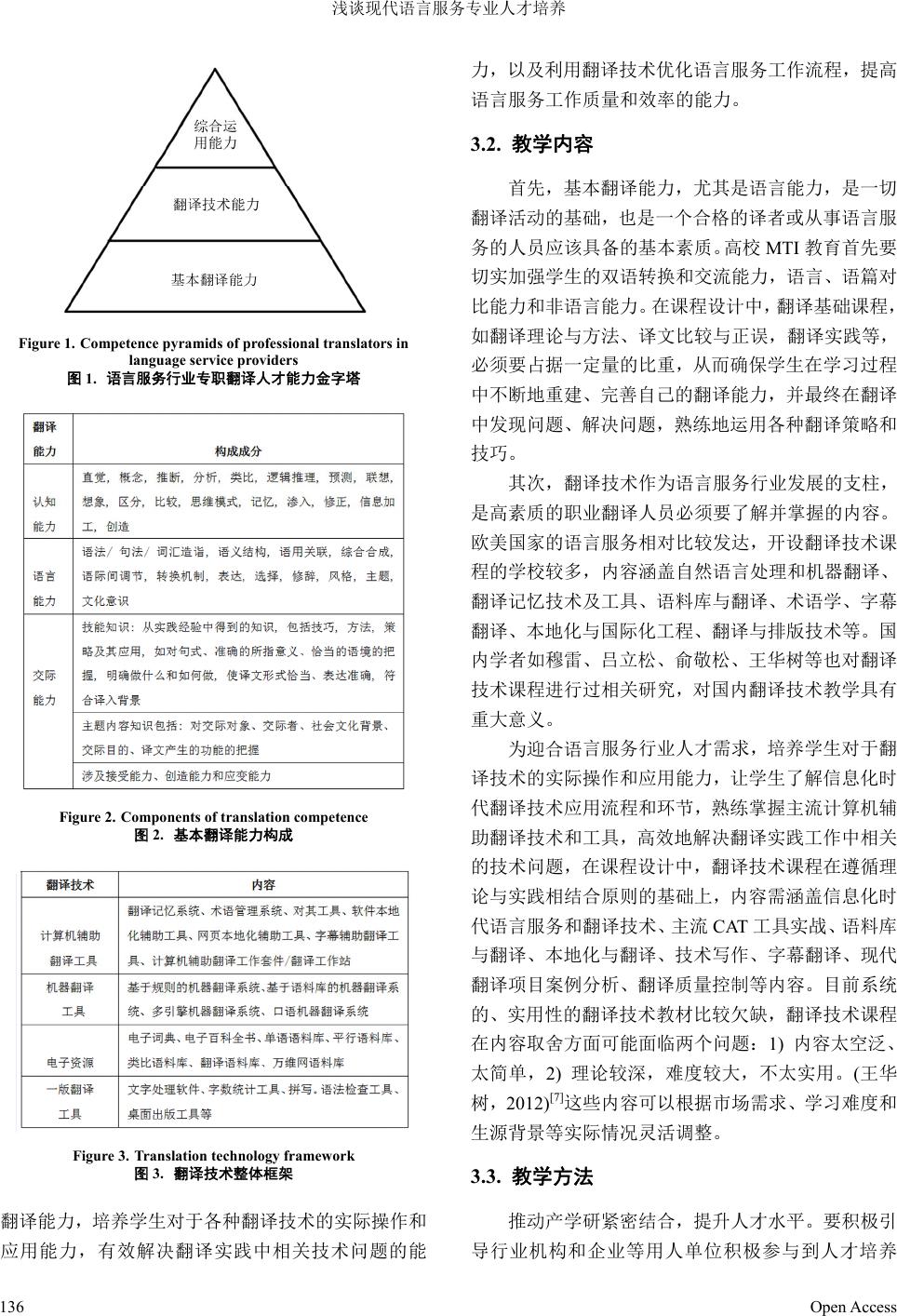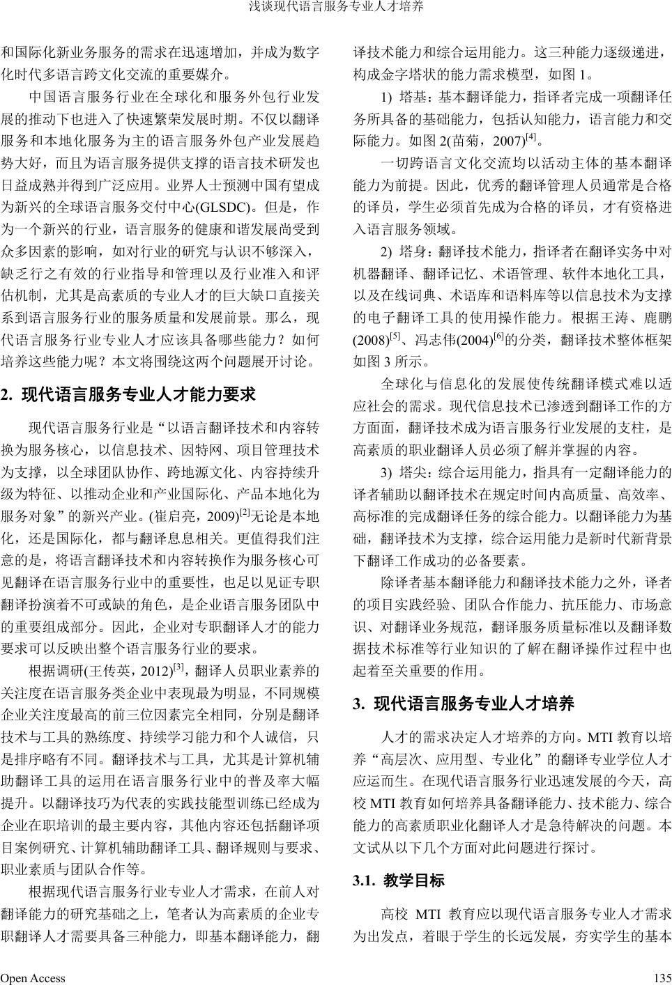 ![]() Modern Linguistics现代语言学, 2013, 1, 134-137 http://dx.doi.org/10.12677/ml.2013.13025 Published Online November 2013 (http://www.hanspub.org/journal/ml.html) On Training of Professional Translators for Language Service Providers Yun Meng The College of Foreign Languages, Nankai University, Tianjin Email: miranda1919@126.com Received: Sep. 20th, 2013; r evised: Oct. 20th, 2013; accepted: Nov. 1st, 2013 Copyright © 2013 Yun Meng. This is an open access article distributed under the Creative Commons Attribution License, which permits unrestricted use, dist ribution, and reproduc ti o n i n a n y medium, p rovided the original work is properly cited. Abstract: Based on the previous study, this paper explores the competence that professional translators should have in Language Service Providers. And suggestions about how MTI education trains the pr ofess ional translators are given. It is found that, to cultivate in novative and practical high-end professio nal talents, MTI education as an important training center should adjust the training goal according to market demand, pay attention to knowledge and technology integration in the teaching programs, and meanwhile enhance teacher resource. Keywords: Language Service Providers; Competence of Professional Translators in Language Service Providers; Training; MT I Education 浅谈现代语言服务专业人才培养 孟 云 南开大学外国语学院,天津 Email: miranda1919@126.com 收稿日期:2013 年9月20 日;修回日期:2013 年10 月20日;录用日期:2013 年11 月1日 摘 要:本文在前人研究的基础上探讨了现代语言服务专业人才的能力要求,并从教学目标、教学内 容、教学方法、师资培训四个方面对高校 MTI 教育培养语言服务专业人才问题提出了建议。高校MTI 教育作为高素质翻译人才的培养基地要不断加强翻译技术师资建设,根据实际需要调整培养目标,同 时要注重学科交叉、知识融合,技术集成,使产学研紧密结合,培养创新型、实用型、复合型高端职 业化人才。 关键词:现代语言服务;语言服务专业人才能力;培养;MTI 教育 1. 引言 语言服务是指“以语言技术为技能和内容提供专 业服务的服务方式”,而“由提供语言服务的各种组 织和机构构成的产业生态链”则被称为语言服务行 业。语言服务行业是经济全球化与信息国际化的产 物。它涵盖“语言文字信息内容设计与开发、文字 信息内容翻译与本地化、语言技术软件开发、语言技 能教育与培训、语言行业研究与咨询、语言服务行业 管理”(崔启亮,2010)[1]六方面的服务内容,其大量的 业务需求不仅存在于传统业务中,如图书出版、文化 交流、社科政经、国防外交、工业企业、商务、法律, 而且伴随新世纪全球化与信息化的迅猛发展,本地化 Open Access 134 ![]() 浅谈现代语言服务专业人才培养 和国际化新业务服务的需求在迅速增加,并成为数字 化时代多语言跨文化交流的重要媒介。 中国语言服务行业在全球化和服务外包行业发 展的推动下也进入了快速繁荣发展时期。不仅以翻译 服务和本地化服务为主的语言服务外包产业发展趋 势大好,而且为语言服务提供支撑的语言技术研发也 日益成熟并得到广泛应用。业界人士预测中国有望成 为新兴的全球语言服务交付中心(GLSDC)。但是,作 为一个新兴的行业,语言服务的健康和谐发展尚受到 众多因素的影响,如对行业的研究与认识不够深入, 缺乏行之有效的行业指导和管理以及行业准入和评 估机制,尤其是高素质的专业人才的巨大缺口直接关 系到语言服务行业的服务质量和发展前景。那么,现 代语言服务行业专业人才应该具备哪些能力?如何 培养这些能力呢?本文将围绕这两个问题展开讨论。 2. 现代语言服务专业人才能力要求 现代语言服务行业是“以语言翻译技术和内容转 换为服务核心,以信息技术、因特网、项目管理技术 为支撑,以全球团队协作、跨地源文化、内容持续升 级为特征、以推动企业和产业国际化、产品本地化为 服务对象”的新兴产业。(崔启亮,2009)[2]无论是本地 化,还是国际化,都与翻译息息相关。更值得我们注 意的是,将语言翻译技术和内容转换作为服务核心可 见翻译在语言服务行业中的重要性,也足以见证专职 翻译扮演着不可或缺的角色,是企业语言服务团队中 的重要组成部分。因此,企业对专职翻译人才的能力 要求可以反映出整个语言服务行业的要求。 根据调研(王传英,2012)[3],翻译人员职业素养的 关注度在语言服务类企业中表现最为明显,不同规模 企业关注度最高的前三位因素完全相同,分别是翻译 技术与工具的熟练度、持续学习能力和个人诚信,只 是排序略有不同。翻译技术与工具,尤其是计算机辅 助翻译工具的运用在语言服务行业中的普及率大幅 提升。以翻译技巧为代表的实践技能型训练已经成为 企业在职培训的最主要内容,其他内容还包括翻译项 目案例研究、计算机辅助翻译工具、翻译规则与要求、 职业素质与团队合作等。 根据现代语言服务行业专业人才需求,在前人对 翻译能力的研究基础之上,笔者认为高素质的企业专 职翻译人才需要具备三种能力,即基本翻译能力,翻 译技术能力和综合运用能力。这三种能力逐级递进, 构成金字塔状的能力需求模型,如图 1。 1) 塔基:基本翻译能力,指译者完成一项翻译任 务所具备的基础能力,包括认知能力,语言能力和交 际能力。如图 2(苗菊,2007)[4]。 一切跨语言文化交流均以活动主体的基本翻译 能力为前提。因此,优秀的翻译管理人员