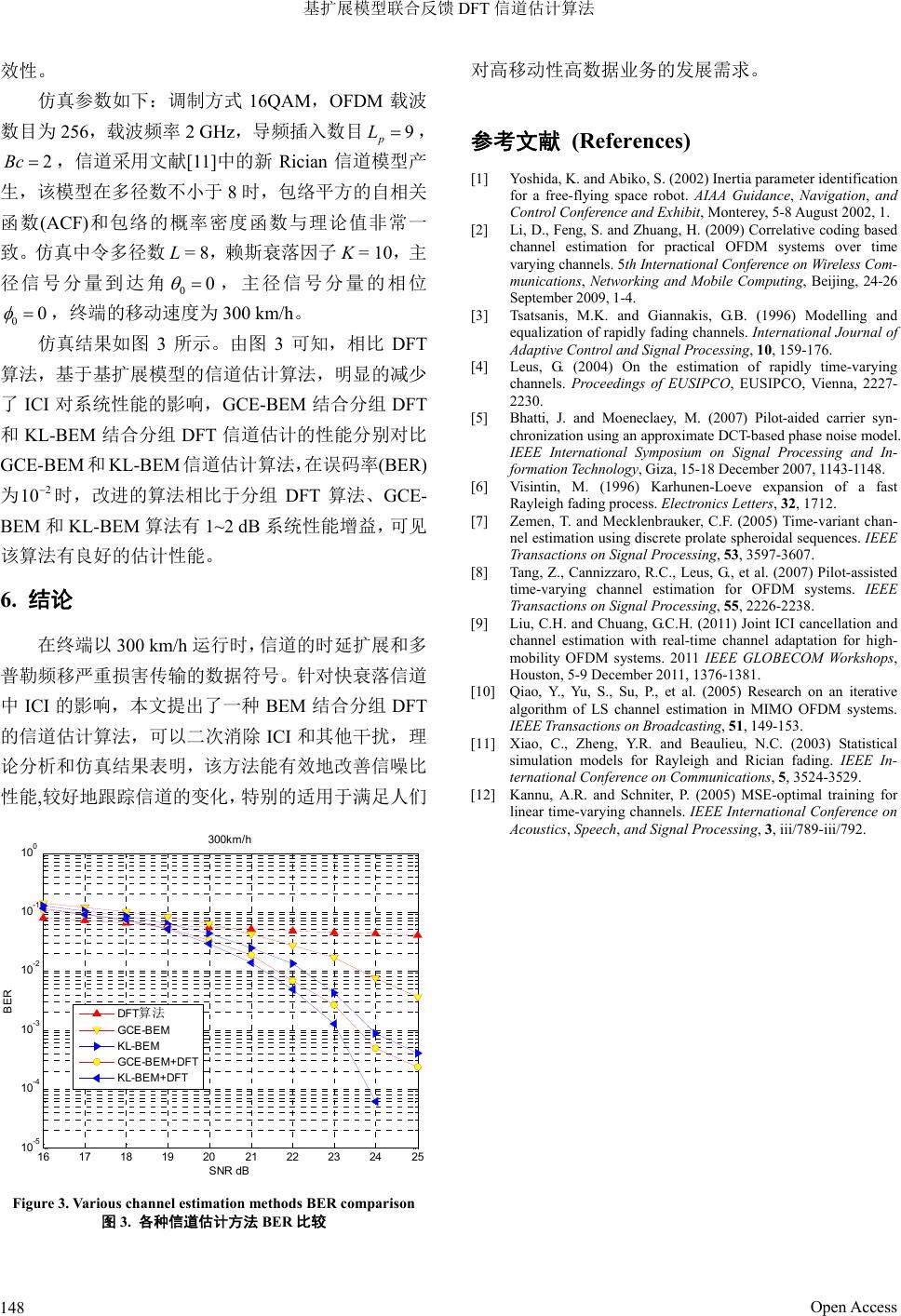 ![]() Hans Journal of Wireless Communications 无线通信, 2013, 3, 144-148 http://dx.doi.org/10.12677/hjwc.2013.36023 Published Online December 2013 (http://www.hanspub.org/journal/hjwc.html) The Channel Estimation Algorithm with Basis Expansion Model Combined Feedback Packet DFT Anting Qi, Shunlan Liu College of Communication Engineering, Hangzhou Dianzi University, Hangzhou Email: qianting6417@163.com Received: Oct. 8th, 2013; revised: Oct. 11th, 2013; accepted: Oct. 12th, 2013 Copyright © 2013 Anting Qi, Shunlan Liu. This is an open access article distributed under the Creative Commons Attribution License, which permits unrestricted use, distribution, and reproduction in any medium, provided the original work is properly cited. Abstract: To improve the fast-moving OFDM system channel estimation accuracy and further inhibit inter-carrier interference (ICI), we propose a channel estimation algorithm (BEM + DFT) with basis expansion model (BEM) combined feedback packet DFT. First, the BEM algorithm is used to estimate the fast moving channel information and the inter-carrier interference. And then, the packet DFT algorithm is used to further estimate the channel information and eliminate the ICI interference, etc. So the proposed algorithm can achieve more accurate estimate of the channel, and further enhancement in the performance of the system. Simulation results show that the proposed GCE-BEM + DFT and KL-BEM + DFT algorithm performance has been significantly improved compared to the grouping DFT algorithm, GCE-BEM and KL-BEM algorithm. Keywords: Orthogonal Frequency Division Multiplexing (OFDM); Inter-Carrier Interference (ICI); Discrete Fourier Transform (DFT); Base Extension Model (BEM); Fast Moving 基扩展模型联合反馈 DFT 信道估计算法 漆安廷,刘顺兰 杭州电子科技大学通信工程学院,杭州 Email: qianting6417@163.com 收稿日期:2013 年10 月8日;修回日期:2013年10月11日;录用日期:2013 年10月12日 摘 要:为了提高快速移动OFDM 系统的信道估计的精度,进一步抑制载波间干扰(ICI),本文提出了一种基扩 展模型(BEM)联合反馈分组DFT 的信道估计算法(BEM + DFT)。首先,利用 BEM 算法估计出快速移动的信道信 息和载波间干扰,然后,利用分组 DFT 算法进行二次信道估计,并对ICI 及其他干扰进行二次消除,从而更加 精确的估计出信道且进一步提升系统性能。仿真结果表明:本文建议的 GCE-BEM + DFT 和KL-BEM + DFT 算 法性能相对于分组 DFT算法、GCE-BEM 和KL-BEM 性能有了明显的提升。 关键词:正交频分复用(OFDM);载波间干扰(ICI);离散傅立叶变换(DFT);基扩展模型(BEM);快速移动 1. 引言 正交频分复用(OFDM)具有抗频率选择 性衰落和 频谱利用率高﹑传输速率高的优点,并已成为下一代 宽带无线通信系统物理层的核心技术。OFDM 系统要 求各子载波严格正交,而当移动终端在 300 km/h 运行 环境下,快速时变信道导致的多普勒频移将破坏子载 波间的正交性,引起载波间干扰(ICI),导致系统性能 下降,因此要在双选择信道下对快变信道进行估计, 就必须要考虑ICI 的消除问题。 针对 OFDM 系统中消除 ICI 的信道估计,消除子 Open Access 144 ![]() 基扩展模型联合反馈 DFT 信道估计算法 载波间干扰的方法有:ICI 自消除方法[1]﹑差分编码[2] 和基于基扩展模型(Basis Expansion Model BEM)的各种 信道方法[3-7]。通常采用不依赖于信道统计特性的复指 数基扩展模型(CE-BEM, Complex Exponential BEM)[3], 虽然这种基模型的代数式最为简单,但信道模型误差较 大;为了弥补复指数基扩展模型的边缘误差,提出了采 用频率为符号长度整数倍的密集采样的泛化复指数基 扩展模型(GCE-BEM)[4];然后是多普勒扩展较低时的性 能优于多普勒扩展较高时的性能的多项式 BEM (P-BEM, Polynomial BEM)[5]被提出;最后还有均方误差 最优的卡洛 BEM (KL-BEM, Karhuen-Loeve BEM)[6],以 及后来针对非 jakes 模型环境提出的基于离散椭球序列 BEM (discrete prolate spheroidal BEM, DPS-BEM)[7],但 是以上的算法都是一次粗略的信道估计和消除载波间 干扰(ICI),很难达到非常高的信道估计精度。 本文主要以现有高铁的运行速度300 km/h为研 究对象进行 OFDM 信道估计,因此我们可以采用 GCE-BEM 和KL-BEM 两种相对性能较好的扩展模型 进行信道估计,文献[8]提出了基于梳状(Comb-type) 导频的基于各种基扩展模型的信道估计,文献[9]提出 并行迭代 ICI 消除算法,但是由于扩展模型的信道估 计算法复杂度比较高,采用并行迭代消除ICI 会较大 的增加算法的复杂度。文献[10]提出了一种改进的 DFT算法二次去除 ICI 和噪声,但是在快衰落的环境 下由于载波间干扰(ICI)较大,很难达到较好的信道估 计精度。 本文提出了一种基扩展模型(BEM)联合反馈分组 DFT 的信道估计算法,该算法通过 BEM 估计得出 ICI, 再通过分组 DFT 算法二次消除 ICI 和其他干扰来进一 步提高系统的性能。并利用文献[11]中的 Rician 信道 模型作为仿真的信道模型,对于该模型,模型的多径 数L不小于 8时,包络平方的自相关函数(ACF)和包 络的概率密度函数与理论值非常一致。仿真结果表明 本文提出的算法能有效提高系统的误码率性能,而且 相对于一般的反馈算法有较低的复杂度和良好的健 壮性。 2. 系统模型 图1给出了基于导频的 OFDM 系统的模型,假设 一个 OFDM 符号有 N个子载波,其中 N为数据子载 波和导频子载波数之和。输入二进制数据流经过调制 二 进 制 数 据 调 制 串 并 转 换 插 入 导 频 I D F T 插 入 CP 并 串 转 换 时变衰落信道时变衰落信道 串 并 转 换 去 除 CP D F T 并 串 转 换 解 调 输 出 数 据 流 均 衡 信道估计 ICI消除 )(kX