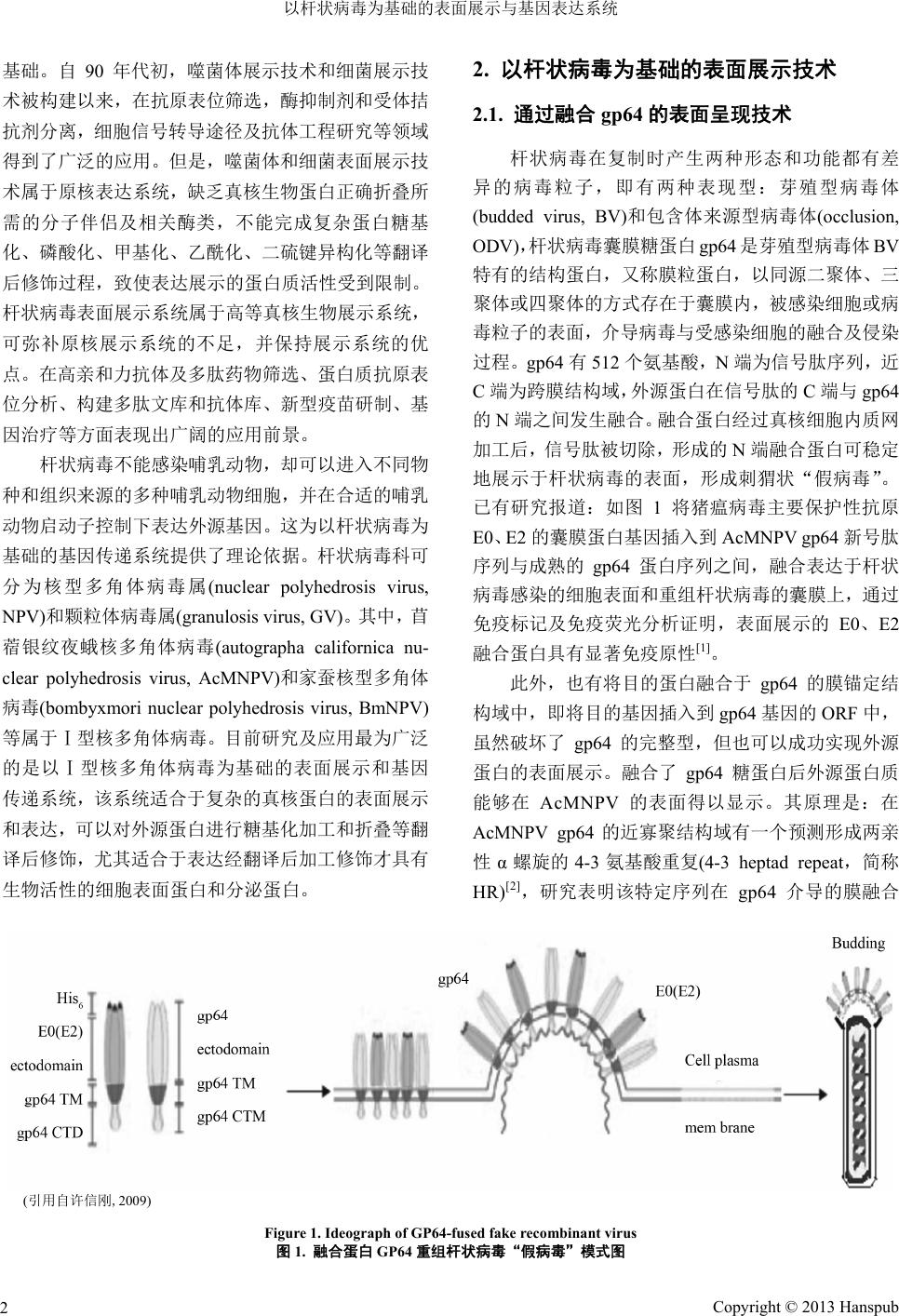 ![]() Immunology Studies免疫学研究, 2013, 1, 1-6 http://dx.doi.org/10.12677/is.2013.11001 Published Online May 2013 (http://www.hanspub.org/journal/is.html) Baculovirus Based Display and Gene Delivery System* Yong Leng1, Zhenhui Song1,2#, Y ingjun Zhang3, Xiaojuan Qi2 1Department of Animal Medicine, Southwest University Rongchang School District, Chongqing 2College of Veterinary Medicine, Xinjiang Agricultural University, Urumqi 3Library, Southwest University Rongchang School District, Chongqing Email: #szh7678@yahoo.com.cn Received: Apr. 2nd, 2013; revised: Apr. 10th, 2013; accepted: May 4th, 2013 Copyright © 2013 Yong Leng et al. This is an open access article distributed under the Creative Commons Attribution License, which permits unre- stricted use, distribution, and reproduction in any medium, provided the original work is properly cited. Abstract: The baculovirus expression vector system has been used extensively to produce numerous proteins originat- ing from both prokaryotic and eukaryotic sources. Through fusing to the entire membrane protein gp64 of baculovirus or combining with special membrane anchor domain, exotic proteins could be expressed on the surface of baculovirus. It was found that baculovirus harboring mammalian expression cassettes could efficiently deliver foreign genes into mammalian cells and successfully express foreign genes. The baculovirus as surface display and gene delivery vector in mammalian cells have extensive prospects. In this article, the progress of baculovirus surface display technology and gene delivery system in mammalian cells was reviewed. Keywords: Baculovirus; Surface Display; Gene Delivery 以杆状病毒为基础的表面展示与基因表达系统* 冷 勇1,宋振辉 1,2#,张鹦俊 3,齐小娟 2 1西南大学荣昌校区动物医学系,重庆 2新疆农业大学动物医学学院,乌鲁木齐 3西南大学荣昌校区图书馆,重庆 Email: #szh7678@yahoo.com.cn 收稿日期:2013 年4月2日;修回日期:2013年4月10 日;录用日期:2013 年5月4日 摘 要:杆状病毒表达载体系统已被广泛应用于真核和原核生物的各种蛋白生产。通过与杆状病毒囊膜蛋白 gp64 融合表达或与特异性的锚定部位结合,可以将外源蛋白质展示在杆状病毒表面。研究发现,携带哺乳动物启动 子的重组杆状病毒能将外源基因传递入哺乳动物细胞,实现外源蛋白的有效表达,表达蛋白的结构更接近天然 蛋白。杆状病毒作为一种新型的基因表面展示和基因传递系统,具有广阔的应用前景,本文对杆状病毒作为外 源蛋白表面展示技术和作为基因传递载体在哺乳动物细胞中表达外源基因的研究进展进行了综述。 关键词:杆状病毒;表面展示;基因传递 1. 引言 杆状病毒属于昆虫病毒,作为一种高效基因转移 载体被广泛用于外源基因的表达研究,该表达系统能 够生产具有翻译后修饰的蛋白产物,接近于天然的蛋 白结构,且有较高的生物学活性,杆状病毒载体除具 备病毒载体的优势外,还具有低毒、安全、制备简单 和易于得到高滴度的病毒粒子等优点。这为开发杆状 病毒作为基因表面展示和基因传递系统提供了理论 *基金项目:中央高校基本科研业务基金(XDJK2010C093)。 #通讯作者。 Copyright © 2013 Hanspub 1 ![]() 以杆状病毒为基础的表面展示与基因表达系统 基础。自 90 年代初,噬菌体展示技术和细菌展示技 术被构建以来,在抗原表位筛选,酶抑制剂和受体拮 抗剂分离,细胞信号转导途径及抗体工程研究等领域 得到了广泛的应用。但是,噬菌体和细菌表面展示技 术属于原核表达系统,缺乏真核生物蛋白正确折叠所 需的分子伴侣及相关酶类,不能完成复杂蛋白糖基 化、磷酸化、甲基化、乙酰化、二硫键异构化等翻译 后修饰过程,致使表达展示的蛋白质活性受到限制。 杆状病毒表面展示系统属于高等真核生物展示系统, 可弥补原核展示系统的不足,并保持展示系统的优 点。在高亲和力抗体及多肽药物筛选、蛋白质抗原表 位分析、构建多肽文库和抗体库、新型疫苗研制、基 因治疗等方面表现出广阔的应用前景。 杆状病毒不能感染哺乳动物,却可以进入不同物 种和组织来源的多种哺乳动物细胞,并在合适的哺乳 动物启动子控制下表达外源基因。这为以杆状病毒为 基础的基因传递系统提供了理论依据。杆状病毒科可 分为核型多角体病毒属(nuclear polyhedrosis virus, NPV)和颗粒体病毒属(granulosis virus, GV)。其中,苜 蓿银纹夜蛾核多角体病毒(autographa californica nu- clear polyhedrosis virus, AcMNPV)和家蚕核型多角体 病毒(bombyxmori nuclear polyhedrosis virus, BmNPV) 等属于Ⅰ型核多角体病毒。目前研究及应用最为广泛 的是以Ⅰ型核多角体病毒为基础的表面展示和基因 传递系统,该系统适合于复杂的真核蛋白的表面展示 和表达,可以对外源蛋白进行糖基化加工和折叠等翻 译后修饰,尤其适合于表达经翻译后加工修饰才具有 生物活性的细胞表面蛋白和分泌蛋白。 2. 以杆状病毒为基础的表面展示技术 2.1. 通过融合 gp64 的表面呈现技术 杆状病毒在复制时产生两种形态和功能都有差 异的病毒粒子,即有两种表现型:芽殖型病毒体 (budded virus, BV)和包含体来源型病毒体(occlusion, ODV),杆状病毒囊膜糖蛋白 gp64 是芽殖型病毒体BV 特有的结构蛋白,又称膜粒蛋白,以同源二聚体、三 聚体或四聚体的方式存在于囊膜内,被感染细胞或病 毒粒子的表面,介导病毒与受感染细胞的融合及侵染 过程。gp64 有512 个氨基酸,N端为信号肽序列,近 C端为跨膜结构域,外源蛋白在信号肽的C端与 gp64 的N端之间发生融合。融合蛋白经过真核细胞内质网 加
