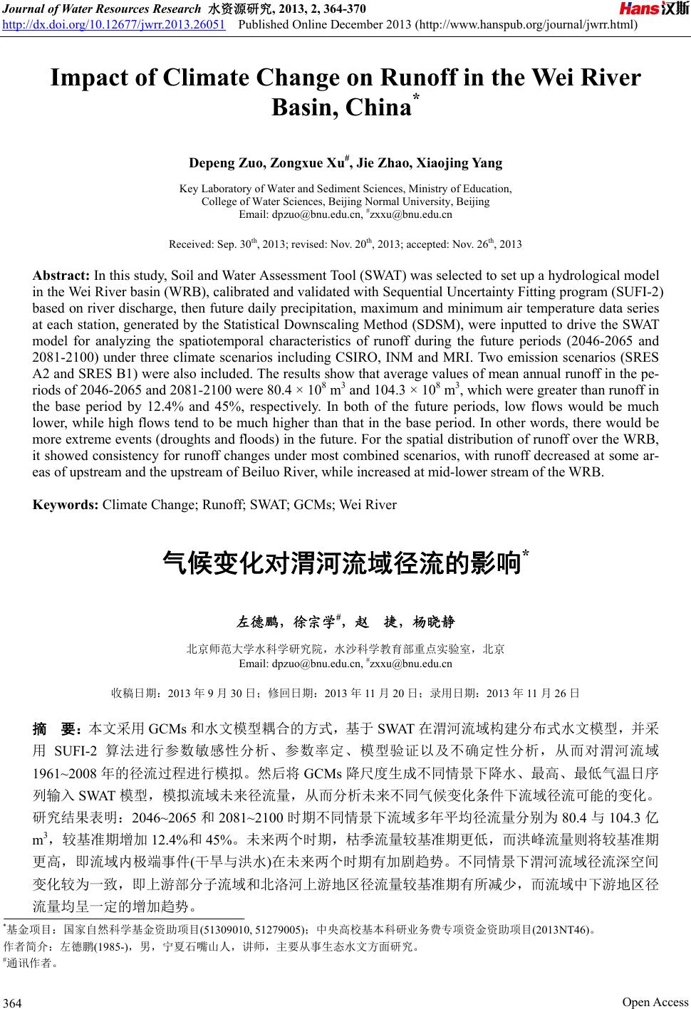 ![]() Journal of Water Resources Research 水资源研究, 2013, 2, 364-370 http://dx.doi.org/10.12677/jwrr.2013.26051 Published Online December 2013 (http://www.hanspub.org/journal/jwrr.html) Impact of Climate Change on Runoff in the Wei River Basin, China* Depeng Zuo, Z ongxu e Xu#, Jie Z hao, Xiaojing Ya n g Key Laboratory of Water and Sediment Sciences, Ministry of Education, College of Water Sciences, Beijing Normal University, Beijing Email: dpzuo@bnu.edu.cn, #zxxu@bnu.edu.cn Received: Sep. 30th, 2013; revised: Nov. 20th, 2013; accepted: Nov. 26th, 2013 Abstract: In this study, Soil and Water Assessment Tool (SWAT) was selected to set up a hydrological model in the Wei River basin (WRB), calibrated and validated with Sequential Uncertainty Fitting program (SUFI-2) based on river discharge, then future daily precipitation, maximum and minimum air temperature data series at each station, generated by the Statistical Downscaling Method (SDSM), were inputted to drive the SWAT model for analyzing the spatiotemporal characteristics of runoff during the future periods (2046-2065 and 2081-2100) under three climate scenarios including CSIRO, INM and MRI. Two emission scenarios (SRES A2 and SRES B1) were also included. The results show that average values of mean annual runoff in the pe- riods of 2046-2065 and 2081-2100 were 80.4 × 108 m3 and 104.3 × 108 m3, which were greater than runoff in the base period by 12.4% and 45%, respectively. In both of the future periods, low flows would be much lower, while high flows tend to be much higher than that in the base period. In other words, there would be more extreme events (droughts and floods) in the future. For the spatial distribution of runoff over the WRB, it showed consistency for runoff changes under most combined scenarios, with runoff decreased at some ar- eas of upstream and the upstream of Beiluo River, while increased at mid-lower stream of the WRB. Keywords: Climate Change; Runoff; SWAT; GCMs; Wei River 气候变化对渭河流域径流的影响* 左德鹏,徐宗学#,赵 捷,杨晓静 北京师范大学水科学研究院,水沙科学教育部重点实验室,北京 Email: dpzuo@bnu.edu.cn, #zxxu@bnu.edu.cn 收稿日期:2013 年9月30 日;修回日期:2013 年11 月20 日;录用日期:2013 年11 月26 日 摘 要:本文采用 GCMs和水文模型耦合的方式,基于SWAT 在渭河流域构建分布式水文模型,并采 用SUFI-2 算法进行参数敏感性分析、参数率定、模型验证以及不确定性分析,从而对渭河流域 1961~2008 年的径流过程进行模拟。然后将GCMs 降尺度生成不同情景下降水、最高、最低气温日序 列输入 SWAT模型,模拟流域未来径流量,从而分析未来不同气候变化条件下流域径流可能的变化。 研究结果表明:2046~2065 和2081~2100时期不同情景下流域多年平均径流量分别为 80.4 与104.3 亿 m3,较基准期增加 12.4%和45%。未来两个时期,枯季流量较基准期更低,而洪峰流量则将较基准期 更高,即流域内极端事件(干旱与洪水)在未来两个时期有加剧趋势。不同情景下渭河流域径流深空间 变化较为一致,即上游部分子流域和北洛河上游地区径流量较基准期有所减少,而流域中下游地区径 流量均呈一定的增加趋势。 *基金项目:国家自然科学基金资助项目(51309010, 51279005);中央高校基本科研业务费专项资金资助项目(2013NT46)。 作者简介:左德鹏(1985-),男,宁夏石嘴山人,讲师,主要从事生态水文方面研究。 #通讯作者。 Open Access 364 ![]() 左德鹏,等:气候变化对渭河流域径流的影响 Open Access 第2卷 · 第6期 365 关键词:气候变化;径流;SWAT;GCMs;渭河 1. 引言 许多学者研究表明,人类活动对黄河流域水资源 锐减的影响非常显著,如水土保持工程建设、水库和 灌溉设施等[1,2]。然而,气候变化在黄河流域径流变化 过程中也起到了至关重要的作用,如降水的减少,气 温的增加等[3]。水文循环作为联结大气圈和生物圈的 重要纽带,必然受到由气候变化引起的降水时空分 布、强度和总量的变化、蒸散发以及土壤水等变化的 影响[4]。全球气候变化对环境、生态和社会经济具有 深远的影响,对于现在及未来的水资源规划和管理而 言,研究径流对气候变化的响应至关重要[5]。 渭河是黄河第一大支流,涉及甘肃、宁夏、陕西 三省区,是关中平原主要供水水源地,也是我国西部 地区经济中心。渭河在黄河治理开发中占有重要地 位,同时作为西北经济发达地区,在区域经济发展和 西部大开发中也具有重要作用和战略意义。因此,研 究渭河流域气候变化对保护和改善我国西部地区生 态环境、高效合理利用水资源以及维护河流生态系统 健康等具有重要意义[6]。 目前评估气候变化的水文响应基本都遵从“未来 气候情景设计–水文模拟–影响研究”模式。由于 GCMs 能提供未来气候变化更为可靠的信息,且水文 模拟能获得更详细的水文变化过程,因此将GCMs 和 水文模型相耦合的方法被认为是最有效评估气候变 化对水文水资源影响的方法[7]。尽管拥有更精细分辨 率的分布式水文模型与 GCMs在时间和空间上本并不 兼容,但统计降尺度方法通过将 GCMs 模拟的大尺度 气候特征与区域/站点气候变量建立经验统计关系,从 而为这两种不同尺度的模式建立连接[8]。 本文采用 GCMs和水文模型耦合的方式评估未来 气候变化情景的水文响应,在渭河流域建立GCMs 输 出数据–统计降尺度方法–分布式水文模型单向连 接系统。首先通过统计降尺度方法将 GCMs 输出数据 生成未来气候情景数据;然后基于基准期径流数据率 定并验证分布式水文模型 SWAT;最后基于未来气候 情景数据驱动 SWAT 模型预估未来