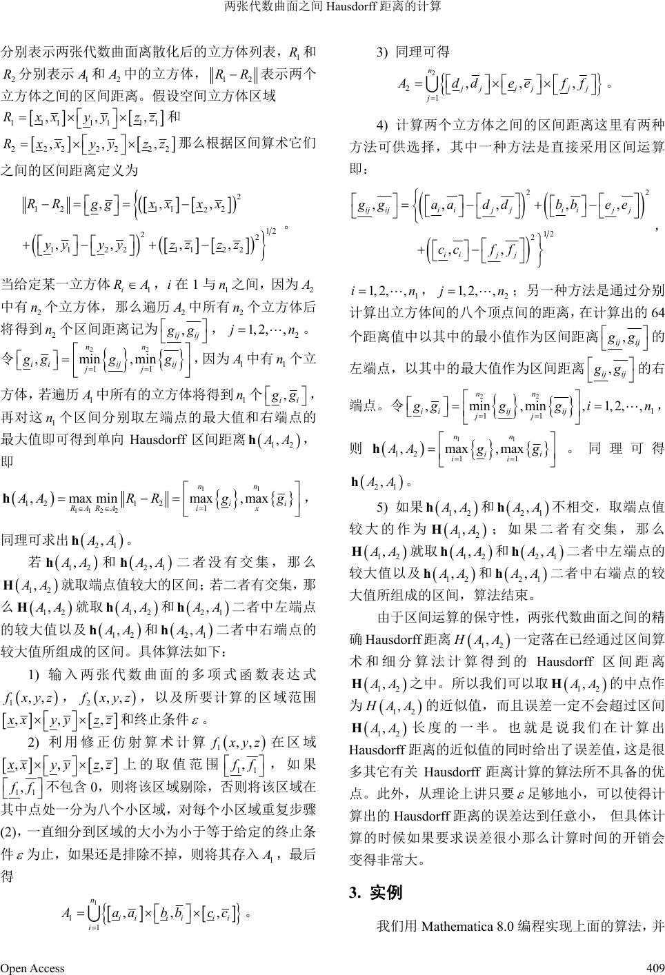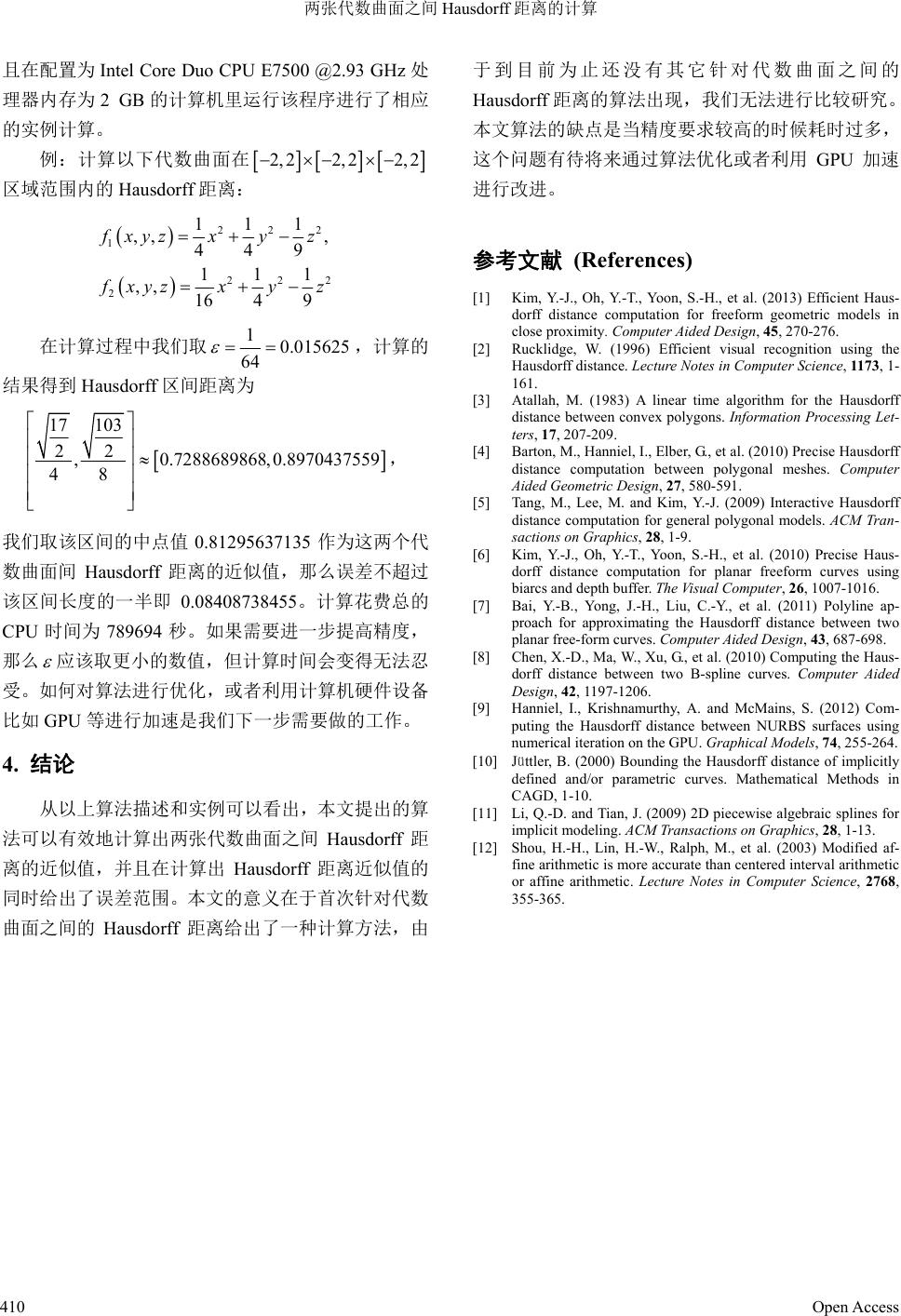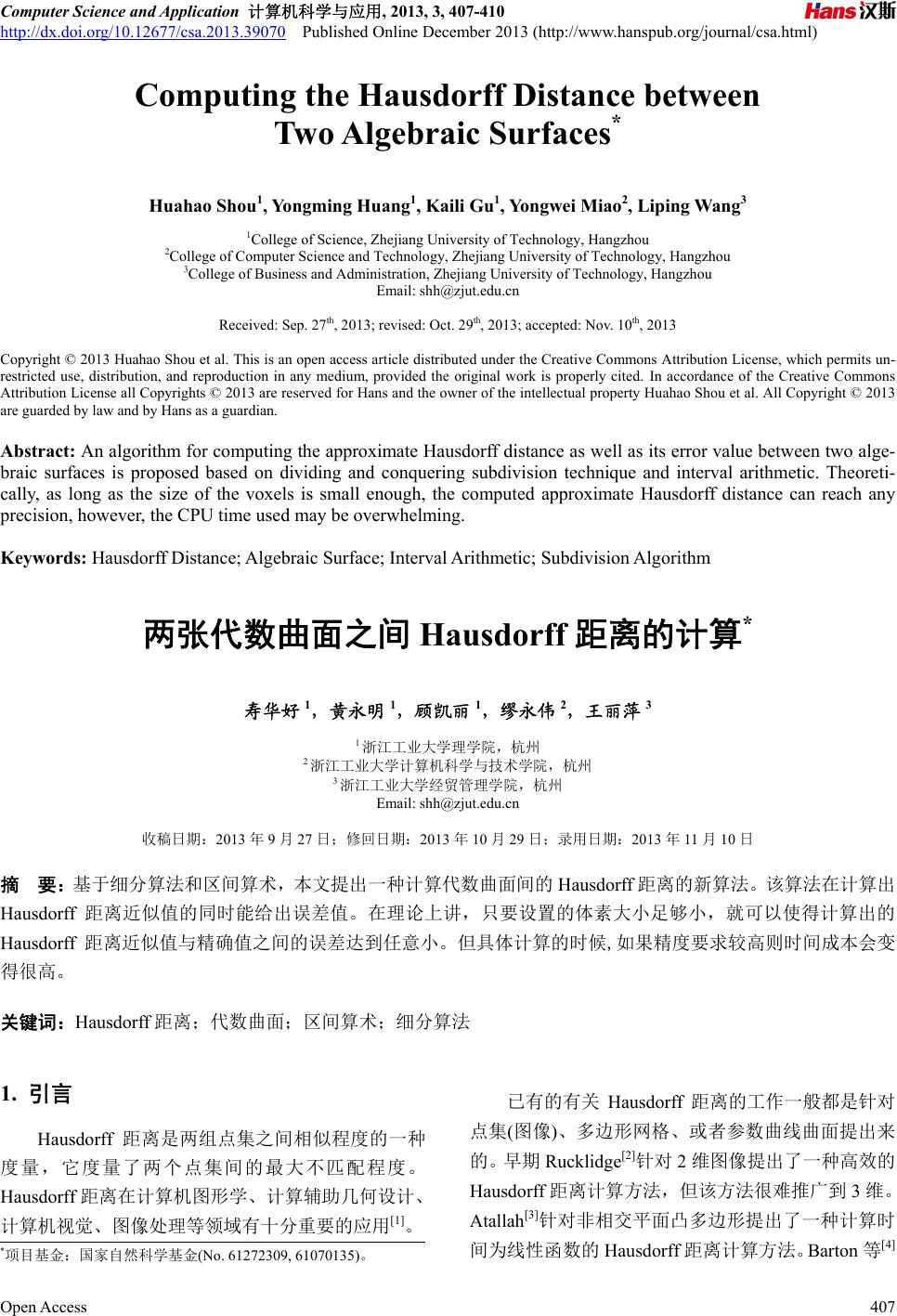 ![]() Computer Science and Application 计算机科学与应用, 2013, 3, 407-410 http://dx.doi.org/10.12677/csa.2013.39070 Published Online December 2013 (http://www.hanspub.org/journal/csa.html) Computing the Hausdorff Distance between Two Algebraic Surfaces* Huahao Shou1, Yongming Huang1, Kaili Gu1, Yongwei Miao2, Liping Wang3 1College of Science, Zhejiang University of Technology, Hangzhou 2College of Computer Science and Technology, Zhejiang University of Technology, Hangzhou 3College of Business and Administration, Zhejiang University of Technology, Hangzhou Email: shh@zjut.edu.cn Received: Sep. 27th, 2013; revised: Oct. 29th, 2013; accepted: Nov. 10th, 2013 Copyright © 2013 Huahao Shou et al. This is an open access article distributed under the Creative Commons Attribution License, which permits un- restricted use, distribution, and reproduction in any medium, provided the original work is properly cited. In accordance of the Creative Commons Attribution License all Copyrights © 2013 are reserved for Hans and the owner of the intellectual property Huahao Shou et al. All Copyright © 2013 are guarded by law and by Hans as a guardian. Abstract: An algorithm for computing the approximate Hausdorff distance as well as its error value between two alge- braic surfaces is proposed based on dividing and conquering subdivision technique and interval arithmetic. Theoreti- cally, as long as the size of the voxels is small enough, the computed approximate Hausdorff distance can reach any precision, however, the CPU time used may be overwhelming. Keywords: Hausdorff Distance; Algebraic Surface; Interval Arithm etic; Subdivision Algorithm 两张代数曲面之间 Hausdorff 距离的计算* 寿华好 1,黄永明 1,顾凯丽 1,缪永伟 2,王丽萍 3 1浙江工业大学理学院,杭州 2浙江工业大学计算机科学与技术学院,杭州 3浙江工业大学经贸管理学院,杭州 Email: shh@zjut.edu.cn 收稿日期:2013 年9月27 日;修回日期:2013 年10 月29 日;录用日期:2013 年11 月10 日 摘 要:基于细分算法和区间算术,本文提出一种计算代数曲面间的 Hausdorff 距离的新算法。该算法在计算出 Hausdorff 距离近似值的同时能给出误差值。在理论上讲,只要设置的体素大小足够小 ,就可以使得计算出 的 Hausdorff 距离近似值与精确值之间的误差达到任意小。但具体计算的时候,如果精度要求较高则时间成本会变 得很高。 关键词:Hausdorff 距离;代数曲面;区间算术;细分算法 1. 引言 Hausdorff 距离是两组点集之间相似程度的一种 度量,它度量了两个点集间的最大不匹配程度。 Hausdorff 距离在计算机图形学、计算辅助几何设计、 计算机视觉、图像处理等领域有十分重要的应用[1]。 已有的有关 Hausdorff 距离的工作一般都是针对 点集(图像)、多边形网格、或者参数曲线曲面提出来 的。早期 Rucklidge[2]针对 2维图像提出了一种高效的 Hausdorff 距离计算方法,但该方法很难推广到 3维。 Atallah[3]针对非相交平面凸多边形提出了一种计算时 间为线性函数的 Hausdorff距离计算方法。Barton 等[4] *项目基金:国家自然科学基金(No. 61272309, 61070135)。 Open Access 407 ![]() 两张代数曲面之间 Hausdorff 距离的计算 针对多边形网格提出了一种计算精确 Hausdorff 距离 的方法,但是速度很慢,达不到实时计算的目的。Tang 等[5]借助于 BVH 技术提出了一种多边形网格之间 Hausdorff 距离近似计算的方法,速度很快,可以达到 实时计算的要求。Kim 等[6]借助于双圆弧和深度缓存 技术提出了一种计算参数曲线之间 Hausdorff 距离的 方法。Bai 等[7]用折线逼近的办法提出了一种计算参数 曲线之间 Hausdorff 距离的方法。Chen 等[8]提出了一 种计算 B样条曲线之间Hausdorff 距离的方法。近期, Hanniel 等[9]使用 GPU加速技术提出了一种针对 NURBS 曲面的 Hausdorff距离计算方法。以上这些算 法都没有涉及到代数曲面之间的 Hausdorff 距离计算 问题。Jüttler[10]对隐式曲线之间或者参数曲线之间的 Hausdorff 距离的上界进行了理论上的估计,但是关于 隐式曲线之间 Hausdorff 距离没有给出具体的计算算 法。 近年来随着计算机计算能力的大幅提升,代数曲 线曲面在计算机图形学和几何造型中的运用越来越 多[11],从而代数曲线曲面间的Hausdorff 距离的计算 也就显得十分重要。然而由于代数曲面的难操作性, 一般情况下很难进行参数化,所以到目前为止代数曲 面之间的 Hausdorff距离计算还没有任何算法问世。 本文在区间分析和细分算法的基础上针对代数曲面 之间的 Hausdorff 距离计算问题首次提出了一种计算 方法。该算法的基本思想是用修正仿射算术[12]先对代 数曲面进行离散化,然后通过计算离散化后的一个个 小立方体(体素)间的Hausdorff 距离来近似代替代数 曲面间的 Hausdorff距离,在求解过程中借助了八叉 树和区间算术进行加速。数值试验表明本文给出的算 法能有效且稳定地计算出两张代数曲面之间的 Hausdorff 距离的近似值,并且能在计算出近似值的同 时给出误差范围。但是当精度要求较高的时候,时间 开销会变得很大。 2. 算法 两张代数曲面和间的 Hausdorff 距离定义为 1 S2 S 1212 21 ,max,,, H SShSS hSS, 其中 2 1 12 ,maxmin qS pS hS Spq 从到的单向 Hausdorff 距离, 2 S1 Spq是某种距离 范式(通常取 Euclidean 距离),取到 Hausdorff 距离的 点对称为 Hausdorff 点对。 假设 1,, 0fxyz , 是给定的两张 空间代数曲面,其中 2,, 0fxyz ,, 1 f xyz 2 , ,, f xyz是三元多 项式,所考虑的计算区域是 ,,, x xyyzz ,终 止条件给定为 。算法的第一个关键步骤是代数曲面 离散化,也就是利用八叉树和区间算术分别找出包含 这两