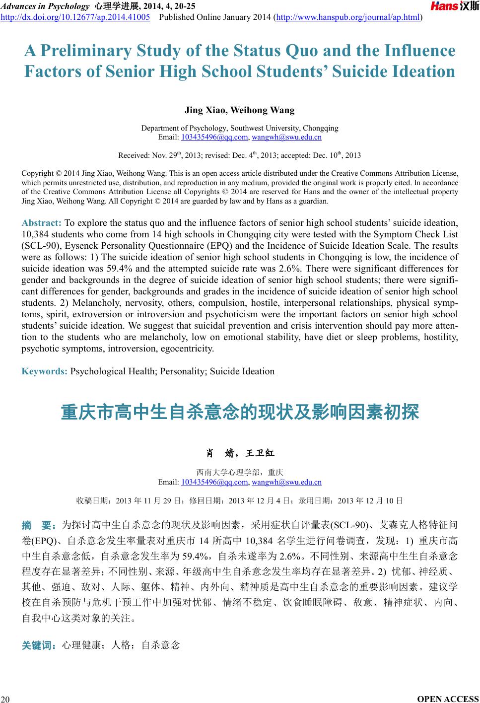 of senior high school students’ s uicide ideation,