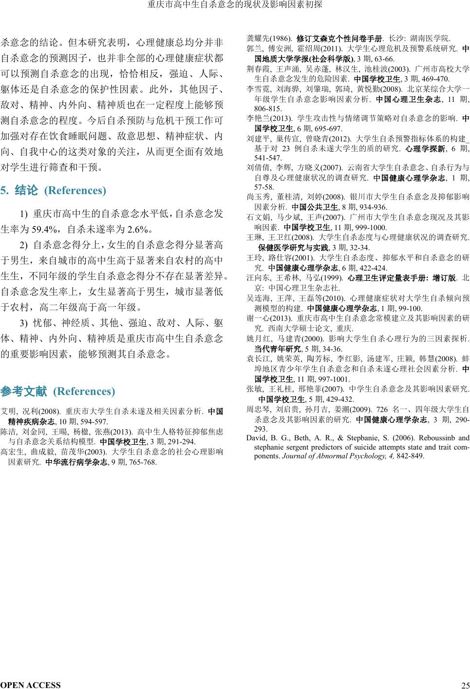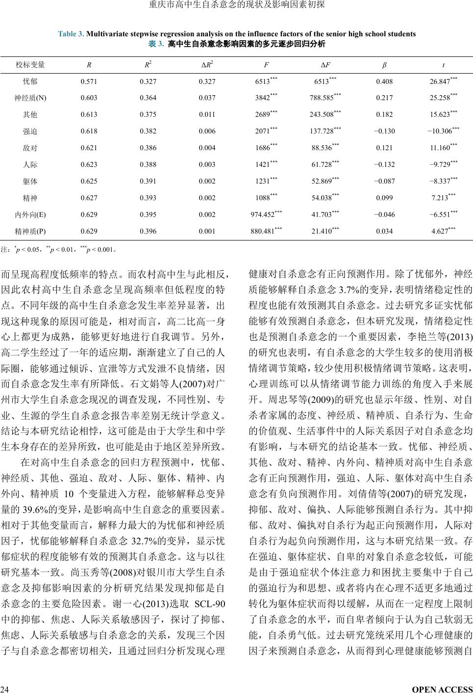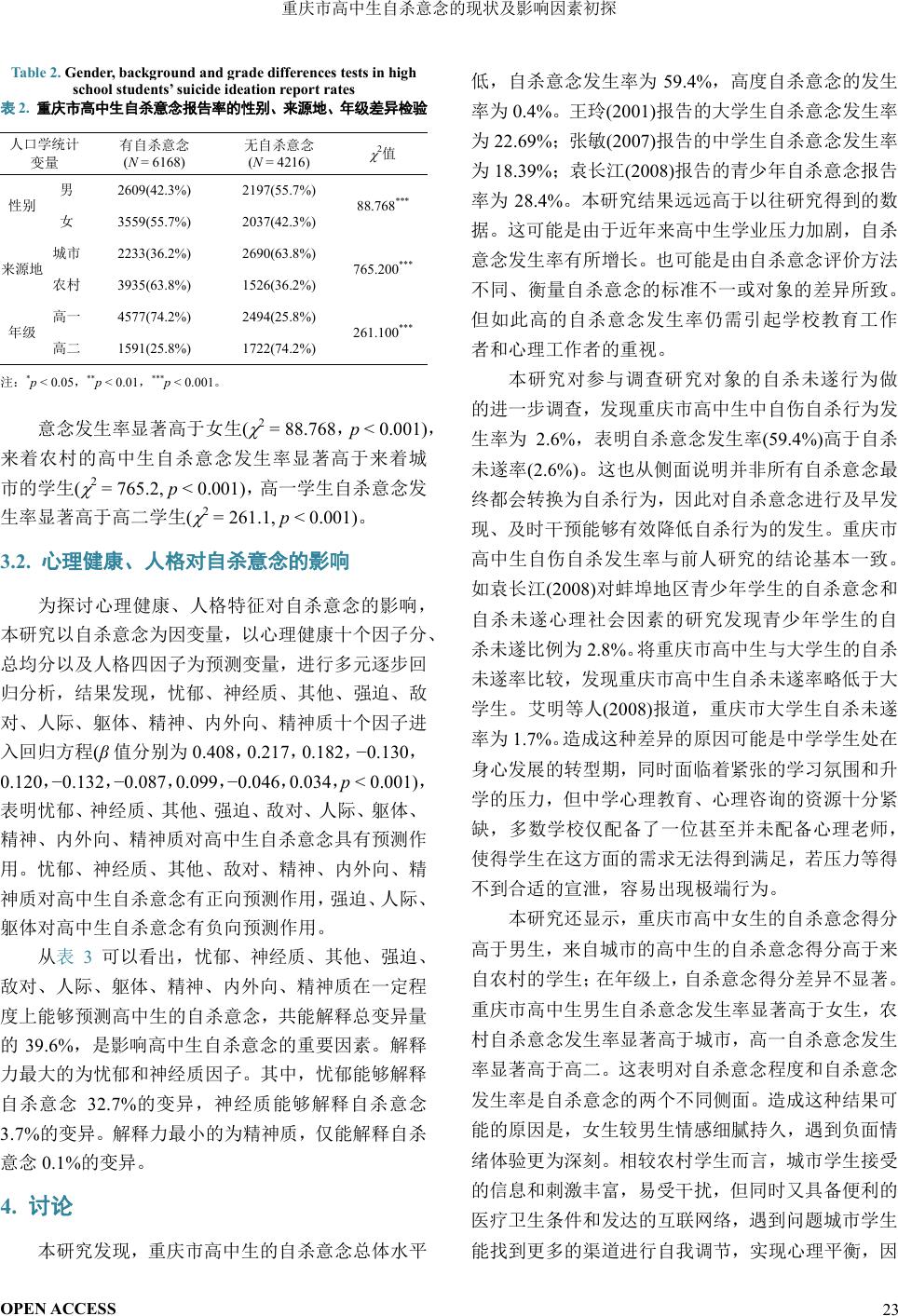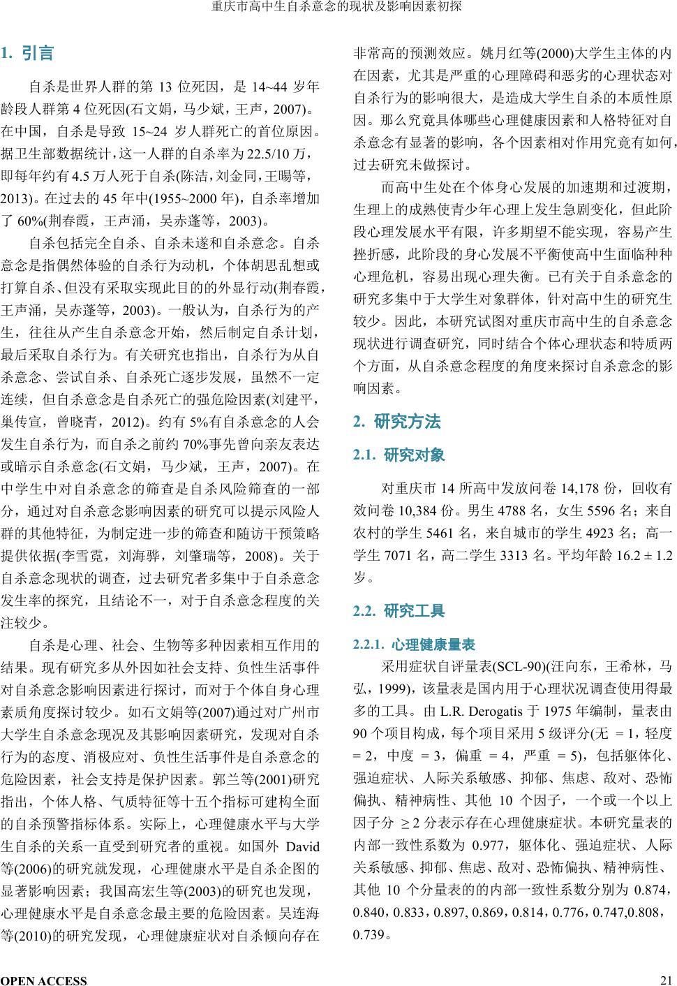 重庆市高中生自杀意念常模建立及其影响因素的研