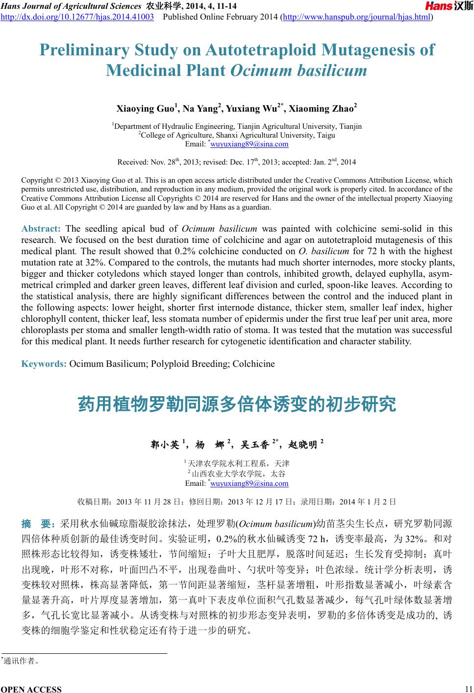http://dx.doi.org/10.12677/hjas.2014.4100