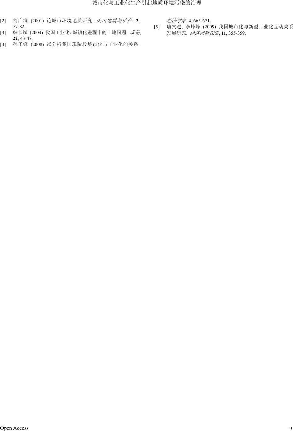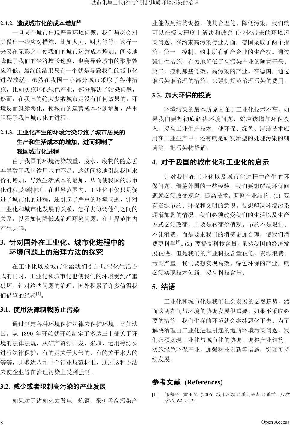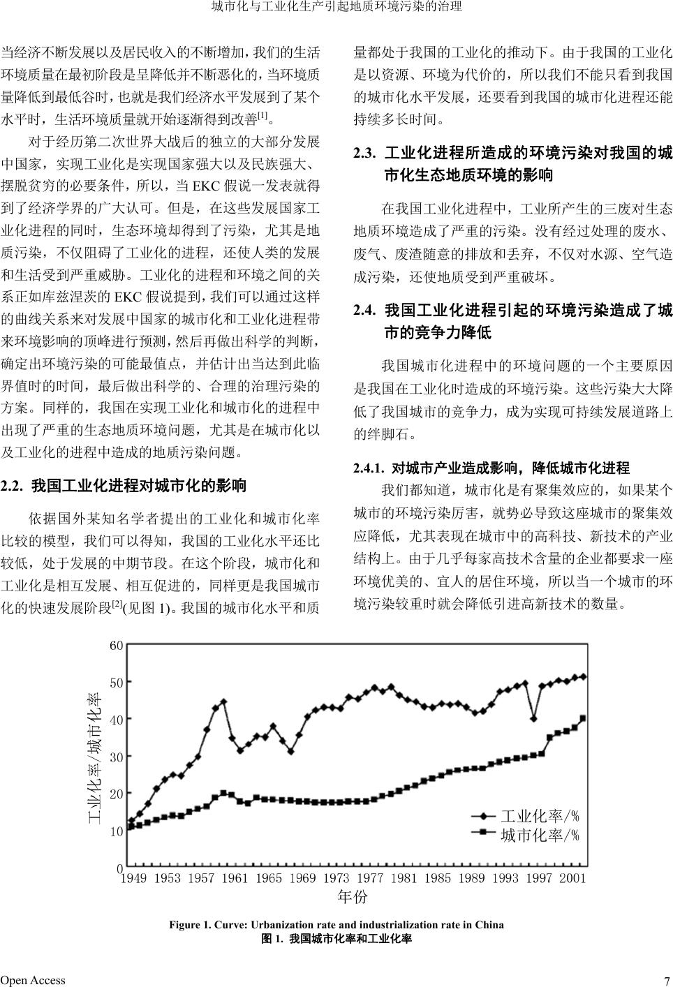 ![]() Open Journal of Soil and Water Conservation水土保持, 2013, 1, 6-9 http://dx.doi.org/10.12677/ojswc.2013.11002 Published Online December 2013 (http://www.hanspub.org/journal/ojswc.html) Open Access 6 The Controlling Measures for Geological Environmental Problem of Urbanization and Industrialization Cen Wang Wuhan Center of China Geological Survey, Wuhan Email: 547986291@qq.com Received: Jul. 24th, 2013; revised: Aug. 13th, 2013; accepted: Aug. 19th, 2013 Copyright © 2013 Cen Wang. This is an open access article distributed under the Creative Commons Attribution License, which permits unrestricted use, distribution, and reproduction in any medium, provided the original work is properly cited. In accordance of the Crea- tive Commons Attribution License all Copyrights © 2013 are reserved for Hans and the owner of the intellectual property Cen Wang. All Copyright © 2013 are guarded by law and by Hans as a guardian. Abstract: To realize the stable, rapid and sustainable development of the national economy, we must guarantee the coordinated development of the urbanization and industrialization. Industrialization and urbanization have made relatively large progress in China, but it was at the expense of ecological envi- ronment, geological pollution and resource consumption. According to these problems, the controlling measures for geological environmental problem of urbanization and industrialization in China are pro- posed in th is paper. Keywords: Urbanization; Industrialization; Geological Environment Pollution; Environmental Control 城市化与工业化生产引起地质环境污染的治理 王 岑 中国地质调查局武汉地质调查中心,武汉 Email: 547986291@qq.com 收稿日期:2013 年7月24 日;修回日期:2013 年8月13 日;录用日期:2013 年8月19 日 摘 要:要实现国民经济的稳定、健康以及可持续的发展,我们必须保证城市化与工业化的协调发展。 我国工业化和城市化取得较大发展,但城市化和工业化是以生态环境、地质污染以及资源消耗为代价 的。基于这些问题,本文提出治理我国城市化以及工业化地质环境问题的一些措施。 关键词:城市化;工业化;地质环境污染;环境治理 1. 引言 自从我国实施改革开放,我国的城市化水平和工 业化都得到了很快的发展,然而在我国城市化和工业 化发展的同时,也呈现了不少环境和地质问题。本文 就以城市化以及工业化带来的地质环境污染问题浅 谈治理方法。 2. 我国在城市化和工业化进程中的 生态地质环境问题 2.1. 我国工业化进程中产生的 生态地质环境问题 举世闻名的“EKC”即环境库兹涅曲线假说提到, ![]() 城市化与工业化生产引起地质环境污染的治理 Open Access 7 当经济不断发展以及居民收入的不断增加,我们的生活 环境质量在最初阶段是呈降低并不断恶化的,当环境质 量降低到最低谷时,也就是我们经济水平发展到了某个 水平时,生活环境质量就开始逐渐得到改善[1]。 对于经历第二次世界大战后的独立的大部分发展 中国家,实现工业化是实现国家强大以及民族强大、 摆脱贫穷的必要条件,所以,当 EKC 假说一发表就得 到了经济学界的广大认可。但是,在这些发展国家工 业化进程的同时,生态环境却得到了污染,尤其是地 质污染,不仅阻碍了工业化的进程,还使人类的发展 和生活受到严重威胁。工业化的进程和环境之间的关 系正如库兹涅茨的 EKC 假说提到,我们可以通过这样 的曲线关系来对发展中国家的城市化和工业化进程带 来环境影响的顶峰进行预测,然后再做出科学的判断, 确定出环境污染的可能最值点,并估计出当达到此临 界值时的时间,最后做出科学的、合理的治理污染的 方案。同样的,我国在实现工业化和城市化的进程中 出现了严重的生态地质环境问题,尤其是在城市化以 及工业化的进程中造成的地质污染问题。 2.2. 我国工业化进程对城市化的影响 依据国外某知名学者提出的工业化和城市化率 比较的模型,我们可以得知,我国的工业化水平还比 较低,处于发展的中期节段。在这个阶段,城市化和 工业化是相互发展、相互促进的,同样更是我国城市 化的快速发展阶段[2](见图 1)。我国的城市化水平和质 量都处于我国的工业化的推动下。由于我国的工业化 是以资源、环境为代价的,所以我们不能只看到我国 的城市化水平发展,还要看到我国的城市化进程还能 持续多长时间。 2.3. 工业化进程所造成的环境污染对我国的城 市化生态地质环境的影响 在我国工业化进程中,工业所产生的三废对生态 地质环境造成了严重的污染。没有经过处理的废水、 废气、废渣随意的排放和丢弃,不仅对水源、空气造 成污染,还使地质受到严重破坏。 2.4. 我国工业化进程引起的环境污染造成了城 市的竞争力降低 我国城市化进程中的环境问题的一个主要原因 是我国在工业化时造成的环境污染。这些污染大大降 低了我国城市的竞争力,成为实现可持续发展道路上 的绊脚石。 2.4.1. 对城市产业造成影响,降低城市化进程 我们都知道,城市化是有聚集效应的,如果某个 城市的环境污染厉害,就势必导致这座城市的聚集效 应降低,尤其表现在城市中的高科技、新技术的产业 结构上。由于几乎每家高技术含量的企业都要求一座 环境优美的、宜人的居住环境,所以当一个城市的环 境污染较重时就会降低引进高新技术的数量。 Figure 1. Curve: Urbanization rate and industrialization rate in China 图1. 我国城市化率和工业化率 ![]() 城市化与工业化生产引起地质环境污染的治理 Open Access 8 2.4.2. 造成城市化
