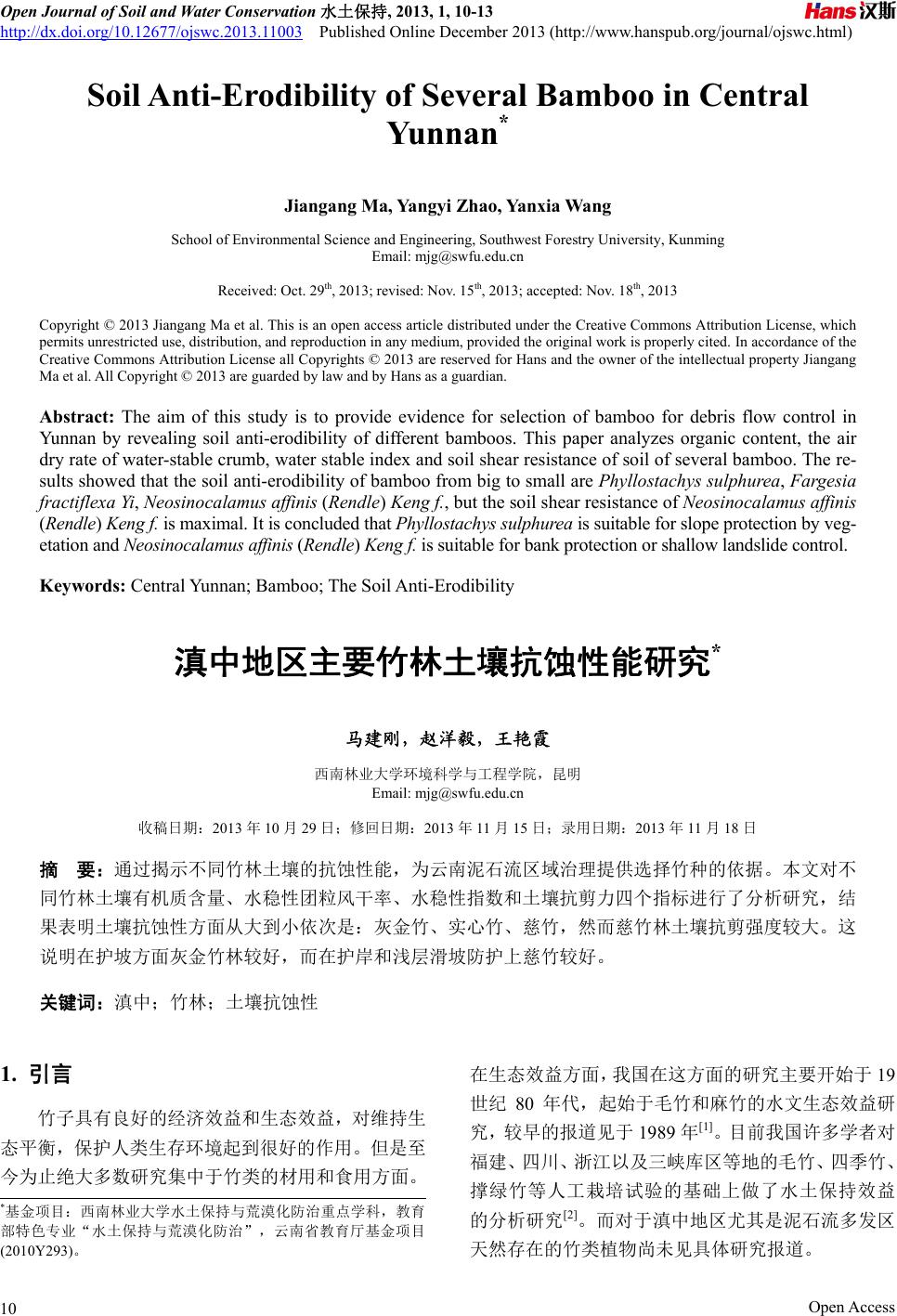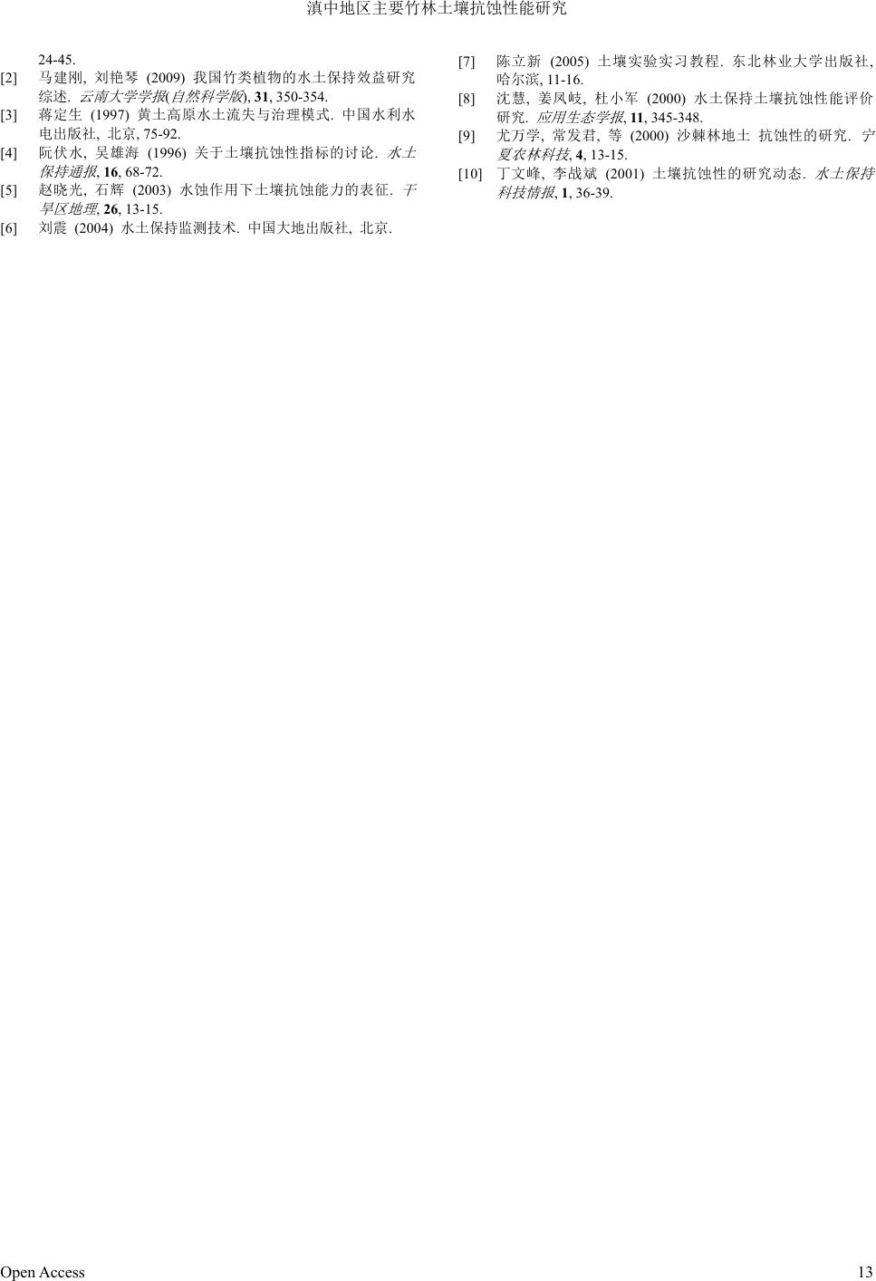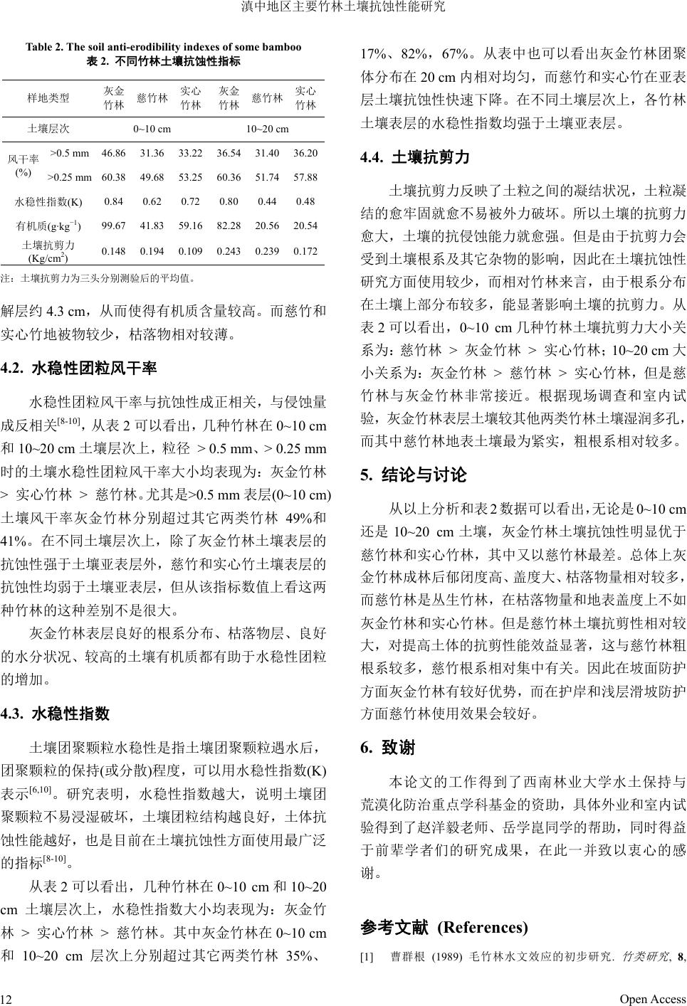 ![]() Open Journal of Soil and Water Conservation水土保持, 2013, 1, 10-13 http://dx.doi.org/10.12677/ojswc.2013.11003 Published Online December 2013 (http://www.hanspub.org/journal/ojswc.html) Open Access 10 Soil Anti-Erodibility of Several Bamboo in Central Yunnan* Jiangan g Ma, Yan gyi Zh ao, Yan xia W ang School of Environmental Science and Engineering, Southwest Forestry University, Kunming Email: mjg@swfu.edu.cn Received: Oct. 29th, 2013; revised: Nov. 15th, 2013; accepted: Nov. 18th, 2013 Copyright © 2013 Jiangang Ma et al. This is an open access article distributed under the Creative Commons Attribution License, which permits unrestricted use, distribution, and reproduction in any medium, provided the original work is properly cited. In accordance of the Creative Commons Attribution License all Copyrights © 2013 are reserved for Hans and the owner of the intellectual property Jiangang Ma et al. All Copyright © 2013 are guarded by law and by Hans as a guardian. Abstract: The aim of this study is to provide evidence for selection of bamboo for debris flow control in Yunnan by revealing soil anti-erodibility of different bamboos. This paper analyzes organic content, the air dry rate of water-stable crumb, water stable index and soil shear resistance of soil of several bamboo. The re- sults showed that the soil anti-erodibility of bamboo from big to small are Phyllostachys sulphurea, Fargesia fractiflexa Yi, Neosin ocalamus aff i ni s (Rendle) Keng f., but the soil shear resistance of Neosinocalamus affinis (Rendle) Keng f. is maximal. It is concluded that Phyllostachys sulphurea is suitable for slope protection by veg- etation and Neosinocal amus affinis (Rendle) Keng f. is suitable for bank protection or shallow landslide control. Keywords: Central Yunnan; Bamboo; The Soil Anti-Erodibility 滇中地区主要竹林土壤抗蚀性能研究* 马建刚,赵洋毅,王艳霞 西南林业大学环境科学与工程学院,昆明 Email: mjg@swfu.edu.cn 收稿日期:2013 年10 月29日;修回日期:2013 年11 月15日;录用日期:2013年11 月18 日 摘 要:通过揭示不同竹林土壤的抗蚀性能,为云南泥石流区域治理提供选择竹种的依据。本文对不 同竹林土壤有机质含量、水稳性团粒风干率、水稳性指数和土壤抗剪力四个指标进行了分析研究,结 果表明土壤抗蚀性方面从大到小依次是:灰金竹、实心竹、慈竹,然而慈竹林土壤抗剪强度较大。这 说明在护坡方面灰金竹林较好,而在护岸和浅层滑坡防护上慈竹较好。 关键词:滇中;竹林;土壤抗蚀性 1. 引言 竹子具有良好的经济效益和生态效益,对维持生 态平衡,保护人类生存环境起到很好的作用。但是至 今为止绝大多数研究集中于竹类的材用和食用方面。 在生态效益方面,我国在这方面的研究主要开始于 19 世纪 80 年代,起始于毛竹和麻竹的水文生态效益研 究,较早的报道见于 1989年[1]。目前我国许多学者对 福建、四川、浙江以及三峡库区等地的毛竹、四季竹、 撑绿竹等人工栽培试验的基础上做了水土保持效益 的分析研究[2]。而对于滇中地区尤其是泥石流多发区 天然存在的竹类植物尚未见具体研究报道。 *基金项目:西南林业大学水土保持与荒漠化防治重点学科,教育 部特色专业“水土保持与荒漠化防治”,云南省教育厅基金项目 (2010Y293)。 ![]() 滇中地区主要竹林土壤抗蚀性能研究 Open Access 11 为了给竹林的水土保持效益研究以及林业生态 工程建设提供依据,笔者对昆明地区泥石流防止工程 中拟采用的主要竹种——灰金竹(Phyllostachys sulph- urea)、慈竹(Neosinocalamus affinis (Rendle) Keng f.)、 实心竹(Fargesia fractiflexa Yi)的竹林土壤抗蚀性进行 了实验研究。 土壤抗蚀性是指土壤对侵蚀营力分散和搬运作 用的抵抗能力[3]。它是控制土壤承受降雨和径流分离 及输移等过程的综合效应[4],同时它还是建立各种土 壤流失方程和坡面侵蚀模型必不可少的重要参数[5]。 评价土壤抗蚀性能的指标有很多[3-6],本研究选取了有 机质含量、水稳性团粒风干率、水稳性指数(K)、土 壤 抗剪力四个指标来反映不同竹林土壤的抗蚀性能。 2. 研究区概况 实心竹林位于昆明市西山,灰金竹林和慈竹林位 于安宁市温泉镇,其中灰金竹林面积约 2500 m2,慈 竹和实心竹林面积约 1000 m2,实验采样地块5年来 无人工经营和其它明显人为扰动现象。各采样点具体 情况见表1。 3. 研究方法 3.1. 土壤采样 根据调查,在林地内选择林分均匀的典型样地, 挖取深 20 cm 的土壤剖面,按上(0~10 cm)、下(10~20 cm)土壤层次取样 500 g 以上,带回实验室准备试验。 3.2. 试验方法 水稳性团粒风干率和水稳性指数采用《水土保持 监测技术》规定方法[6],水稳性团粒风干率利用公式 (1)和公式(2)分别计算 0.5 mm 和0.25 mm 以上团粒风 干率。 % 100% AB G 各粒级水稳性团聚体含量 (1) % 100% B A 某粒级水稳性团粒风干率 (2) 式中:A——某粒级毛管饱和土水稳性团粒含量 B——某粒级风干土水稳性团粒含量 水稳性指数(K)测定方法是:将待测土样风干后筛 分,选取直径0.7~1.0 mm的土粒50颗以上,均匀放 在孔径为0.5 mm的金属网上,然后置于静水中进行 Table 1. Basic status of the soil sampling point 表1. 土壤采样点概况 林分 海拔 (m) 坡度 (˚) 郁闭度 土壤 成林 年限(a) 林分 组成 灰金竹林 192036 0.90玄武岩红壤 30 纯林 慈竹林 190020 0.62玄武岩红壤 21 纯林 昆明实心 竹林 200031 0.70石灰岩红壤 35 纯林 观测。以一分钟时间间隔分别记下分散的土粒数量, 连续观测10 分钟,其分散土粒的总和即为10 分钟内 完全分散的土粒数。同时记下 10分钟内未分散的土 粒的数量,利用公