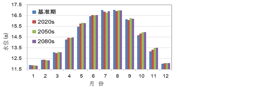 图4. 未来各时期多年平均月水位相对基准期的变化