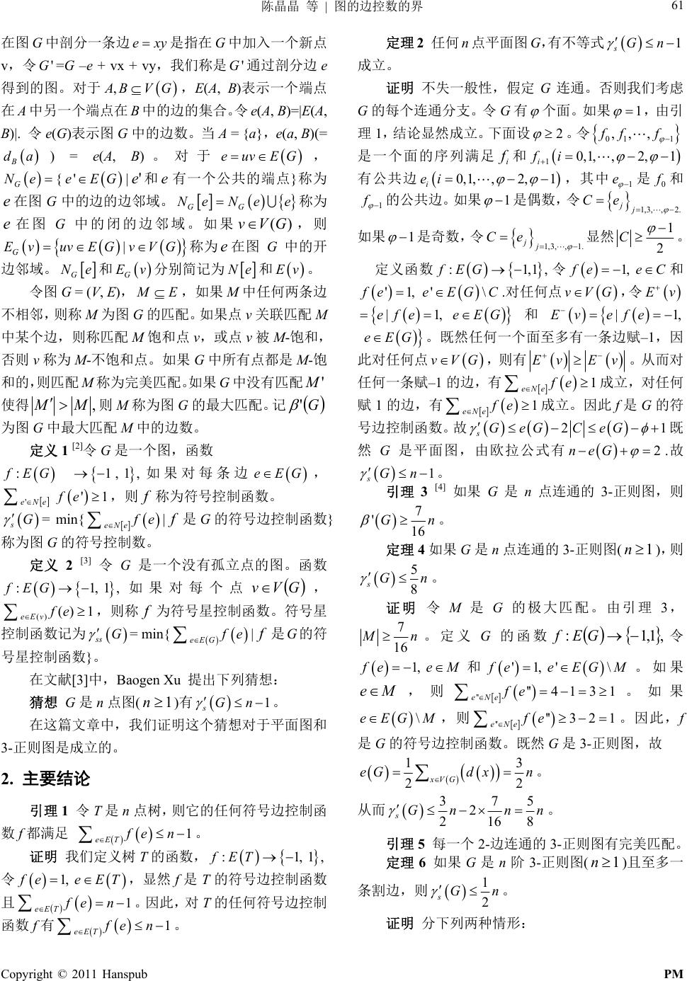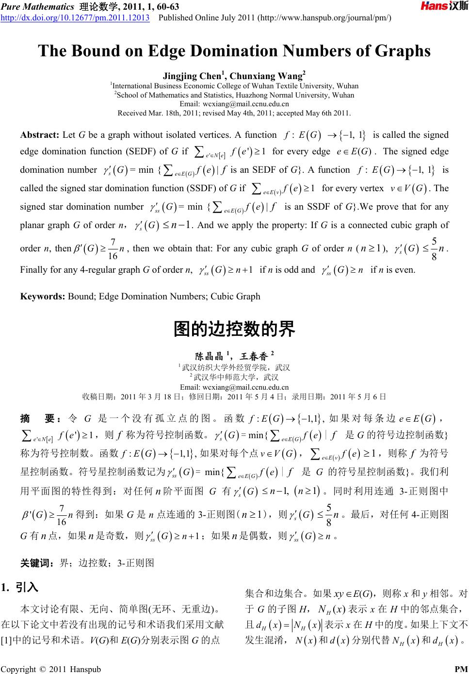 ![]() Pure Mathematics 理论数学, 2011, 1, 60-63 http://dx.doi.org/10.12677/pm.2011.12013 Published Online July 2011 (http://www.hanspub.org/journal/pm/) Copyright © 2011 Hanspub PM The Bound on Edge Domination Numbers of Graphs Jingjing C hen1, Chunxiang Wang2 1International Business Economic College of Wuhan Textile University, Wuhan 2School of Mathematics and Statistics, Huazhong Normal University , Wuhan Email: wcxiang@mail.ccnu.edu.cn Received Mar. 18th, 2011; revised May 4th, 2011; accepted May 6th 2011. Abstract: Let G be a graph without isolated vertices. A function : 1, 1fEG is called the signed edge domination function (SEDF) of G if 'eNe '1fe for every edge ()eEG . The signed edge domination number sG = min { GeE f ef |is an SEDF of G}. A function is called the signed star domination function (SSDF) of G if : 1,1G fE 1 vfe eE for every vertex . The signed star domination number = min { vVG G ss GeE f e | is an SSDF of G}.We prove that for any planar graph G of order n,. And we apply the property: If G is a connected cubic graph of f G s 1 n order n, then 7 16 G n , then we obtain that: For any cubic graph G of order n (), 1n sG n 8 5 . Finally for any 4-regular graph G of order n, 1 ss Gn if n is odd and ss G n if n is even. Keywords: Bound; Edge Domination Numbers; Cubic Graph 图的边控数的界 陈晶晶1,王春香 2 1武汉纺织大学外经贸学院,武汉 2武汉华中师范大学,武汉 Email: wcxiang@mail. ccnu.edu.cn 收稿日期:2011 年3月18 日;修回日期:2011 年5月4日;录用日期:2011 年5月6日 摘 要:令G是一个没有孤立点的图。函数 :fEG1,1, 1 如果对每条边 , ,则 称为符号控制函数。 eEG 'eNe 'fef sG = min{ eEG f e | 是G的符号边控制函数} 称为符号控制数。函数 如果对每个点 f :fEG1,1, ,vVG eEv f e 1,则称 f为符号 星控制函数。符号星控制函数记为 ss G = min { eEG f e |f 是 G 的符号星控制函数}。我们利 用平面图的特性得到:对任何 n阶平面图 G有 s G 1, 1nn 。同时利用连通 3-正则图中 7 'G 16 n得到:如果 G是n点连通的 3-正则图( ),则1n sG n 8 5 。最后,对任何 4-正则图 G有 点,如果 是奇数,则;如果 是偶数,则 n n 1 ss Gn n ss G n 。 关键词:界;边控数;3-正则图 1. 引入 本文讨论有限、无向、简单图(无环、无重 边)。 在以下论文中若没有出现的记号和术语我们采用文献 集合和边集合。如果 [1]中的记号和术语。V(G)和E(G)分别表示图 G的点 xy E(G),则称 x和y相邻。对 于G的子图 H,NH示x在H中的邻点集合, 且 )(x表 HH dx Nx在H中的度。如果上下文不表示 x 发生混淆, Nx和 dx分别代替 H Nx 和 H dx 。 ![]() 陈晶晶 等图的边控数的界61 | G中剖分一条 –e + vx + v通过剖分边 在图 边exy是指在 G中加入一个新点 v,令 'G=G,我们称是 e 得到的图。对于 , y 'G A B,E(A, B)表示一个端点 在A中另一个端点在 B中的边的集合。 e(A, B)=|E(A, B)|. 令e(G)表示图 。当 A = {a},e(a, B)(= B da) = e(A, B)。对于 V 中的边 G G数 令 euv EG , G Ne{ 'eEG|'e和e有一个公共的端点}称为 G中的边的边邻域。 e在图 G e e称 G中 G Ne为 G域。如果 )(GVv,则 | GvuvEGvVG 的开 邻域。 N e在图 e E 边 在图 中的闭的边邻 称为 G Ne和 G Ev分别简记为 Ne和 。 Ev 令图 G = (V, E), M E G的 饱和 ,如果 M中任何两条边 不相邻,则 为匹配。如果 关联 M称M图点 v匹配 中某个边,则称匹配 M点v,或点v被M-饱和, 否则 v称为M-不饱和点。如果G中所有点都是M-饱 和的,则匹配 M称为完美匹配。如果G中没有匹配' M 使得 ,MM 则M称为图 G的最大匹配。记 G' 为图 G中最大匹配 M中的边数。 定义 G是一个图,函数 : 1 [2]令 f EG 1 , 1, 如果对每条边 eEG 数。 , eN '1fe,则 f称为符号控 m e' sG = 制函 in{ eeN f e|f是G的符号 数} 制数。 义2 [3 没有孤立点的图。函数 :1, 1,fEG 如果 控 令个 对 的符号 ] 边控制函 称为图 G 定G是一 每个点 GVv, () () 1 Evfe ,则称 f为符号星控制函数。符号星 = min{ eEG e 控制函数记为 ss G f e |f是G的 提出下列猜想 1。 图 符号边控制函 符 在文献[3] ogen Xu: 猜想 G是n点图 号星控制 3-正 2. 主 引理 函数} 1 令 。 中,B ) T是 则 eET a (1n n点树, 有s 它的任何 1 Gn 在这篇文章中,我们证明这个猜想对于平面和 则图是成立的。 要结论 数f都满足 f en 。 证明 我们定义树 T的函数, :1, 1,fET 令 1, f eeT的EfT,显然是符号边控制函数 且 1 eET f en 。因此,对 T 函数 1 f有 的任何符号边控制 TeE f en。 面图 G,有不等式定理 2 任何n点平 1 sGn 成立。 证明 不失一般性,假定G连通。否 G的每个 则我们考虑 连通分支。令 G有 个面。如果 1 ,由 引 理1,结论显然成立。下面设 2 。令 01 1 ,,,fff 是一个面的序列满足 i f和 10,1,,,1i 有公共边 2 i f 1 0,1, ,2, i ei ,其中 1 e 是0 f 和 1 f 的公共边。如果 1 是偶数,令 1,3, ,2. jj Ce 如果 1 是奇数,令 1,3, ,1. jj Ce显然 1 2 C 。 定义函数 :1fEG,1,令 1, f eeC和 ' \'1, f eeEG C .对任何点 vVG,令 E v ,e EG和|1efe v efe|1,E eEG 此对任何点 。既然任何一个面至多 赋–1有一条边 ,因 vVG,则 有 E –1 的边,有 1 eNefe v Ev 。从 而对 任何一条赋 成立,对任何 赋1的边,有 fe1 eNe 成立。因此 f是G的符 号边控制函数。故 sG eG 21 eG C 式 既 然G是平面图,由 有 2neG .故欧拉公 1 sGn 。 引理 3 [4] 如果 G是n点连通则的 3-正则图, 7 '16 如果 n图 Gn 定理 4G是点连通的 3-正则 ,则 。 (1n) 5 8 是G sGn 。 证明 令M的极大匹配。由引理3, 7 16 n。定义 G的函数 ,1,1: GEf M 令 1, f eeM和 , '\'1 f eeEGM 。如果 Me ,则 '' '' eNe fe 4 131 。如果 \eEGM,则 ''eNe fe ''3 21 。因此,f 符号边控 ,故 是G的制函数。既然 G是3-正则图 13 xVG eGx n 。 从而 22 d 375 2 2168 sGn n 引理 5 每一个2-边连通的 3-正则图有