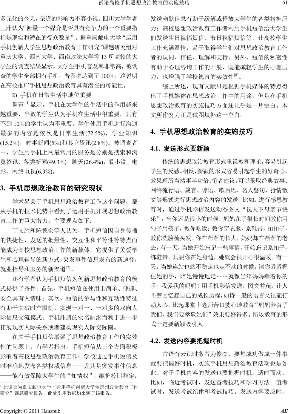 上,从现有相关研究文献研究的空白入手来探讨手机思想政治教育的实施技巧,有益于推动手机媒体