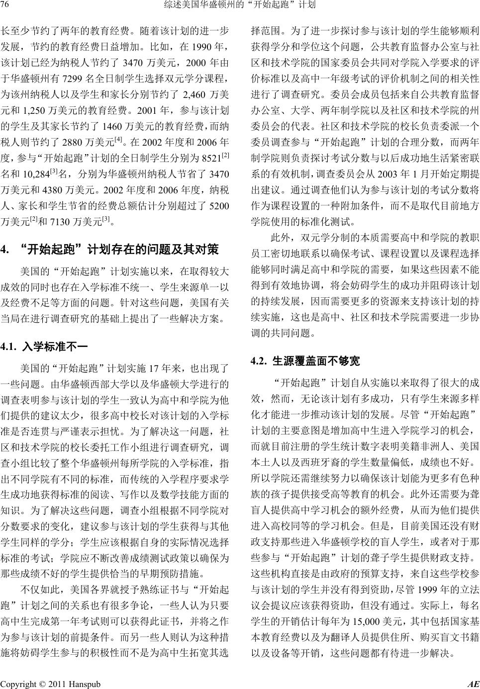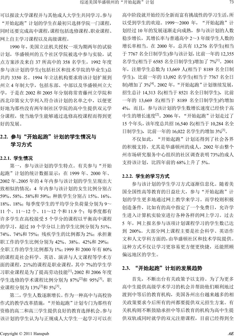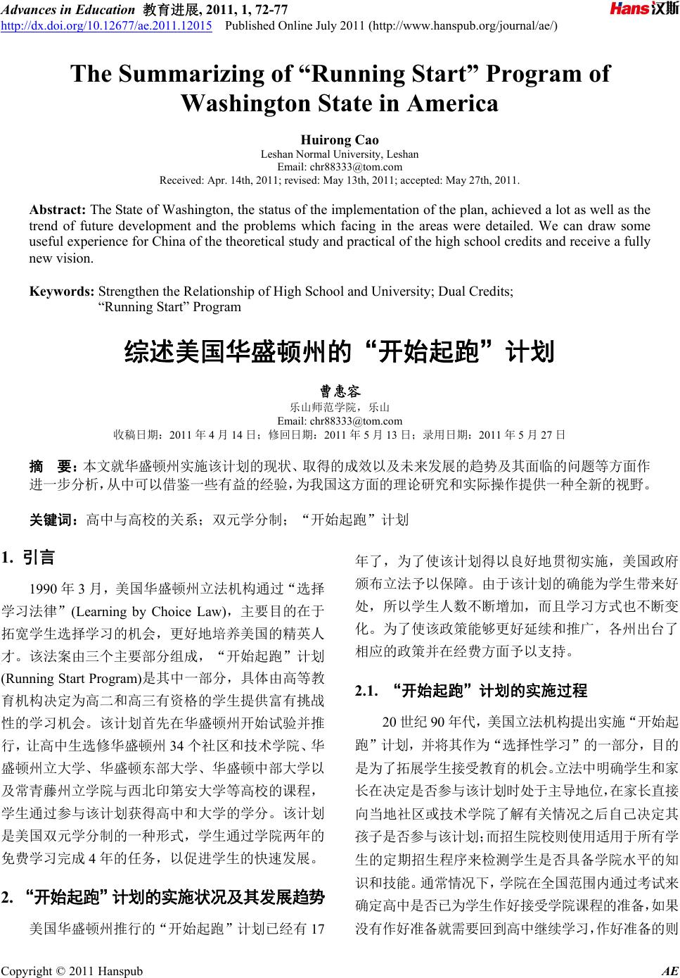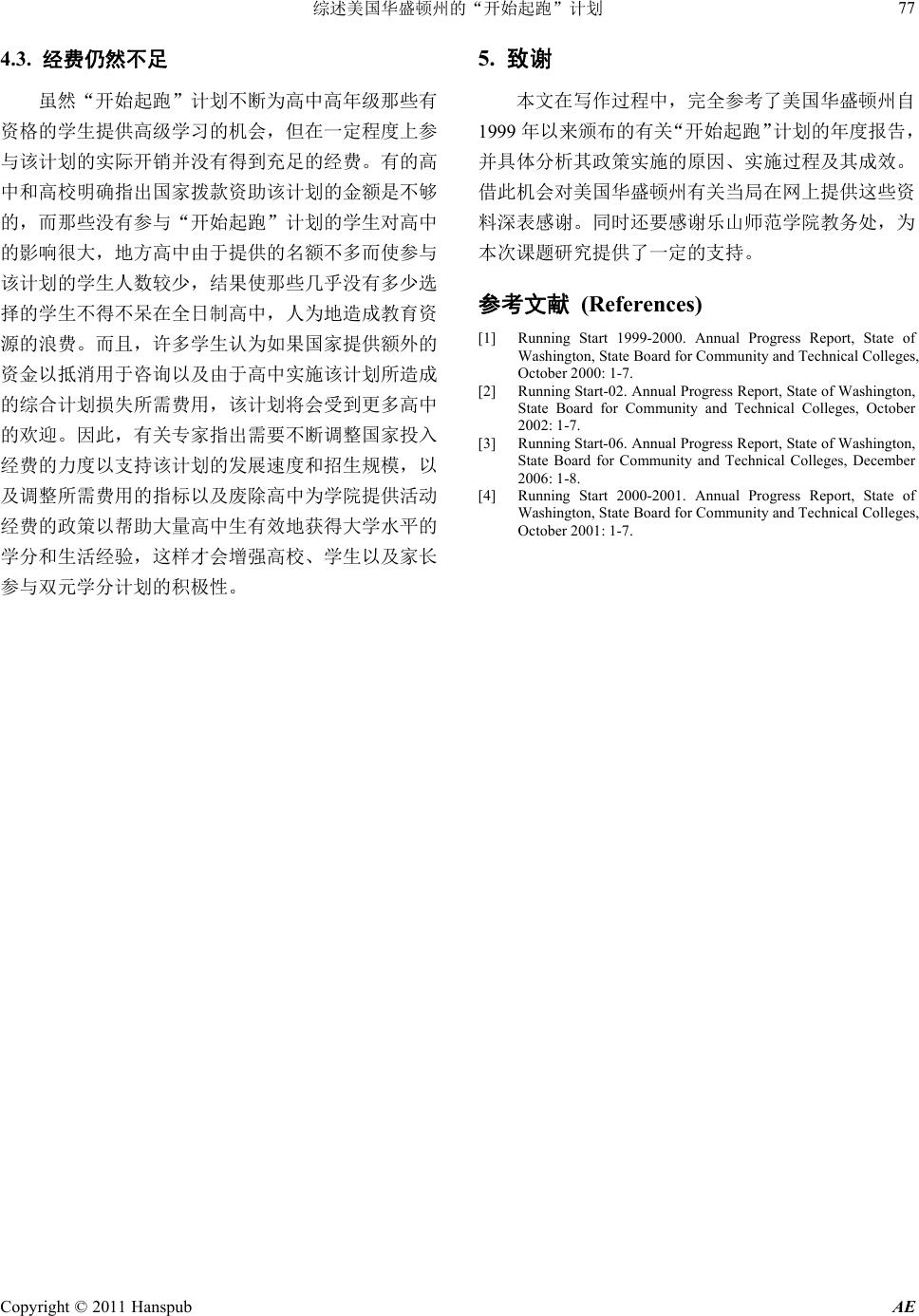 ![]() Advances in Education 教育进展, 2011, 1, 72- 77 http://dx.doi.org/10.12677/ae.2011.12015 Published Online July 2011 (http://www.hanspub.org/journal/ae/) Copyright © 2011 Hanspub AE The Summarizing of “Running Start” Program of Washington State in America Huirong Cao Leshan Normal University, Leshan Email: chr88333@tom.com Received: Apr. 14th, 2011; revised: May 13th, 2011; accepted: May 27th, 2011. Abstract: The State of Washington, the status of the implementation of the plan, achieved a lot as well as the trend of future development and the problems which facing in the areas were detailed. We can draw some useful experience for China of the theoretical study and practical of the high school credits and receive a fully new vision. Keywords: Strengthen the Relationship of High School and University; Dual Cred its; “Running Start” Pro gram 综述美国华盛顿州的“开始起跑”计划 曹惠容 乐山师范学院,乐山 Email: chr88333@tom.com 收稿日期:2011 年4月14 日;修回日期:2011 年5月13 日;录用日期:2011 年5月27 日 摘 要:本文就华盛顿州实施该计划的现状、取得的成效以及未来发展的趋势及其面临的问题等方面作 进一步分析,从中可以借鉴一些有益的经验,为我国这方面的理论研究和实际操作提供一种全新的视野。 关键词:高中与高校的关系;双元学分制;“开始起跑”计划 1. 引言 1990 年3月,美国华盛顿州立法机构通过“选择 学习法律”(Learning by Choice Law),主要目的在于 拓宽学生选择学习的机会,更好地培养美国的精英人 才。该法案由三个主要部分组成,“开始起跑”计划 (Running Start Program)是其中一部分,具体由高等教 育机构决定为高二和高三有资格的学生提供富有挑战 性的学习机会。该计划首先在华盛顿州开始试验并推 行,让高中生选修华盛顿州 34 个社区和技术学院、华 盛顿州立大学、华盛顿东部大学、华盛顿中部大学以 及常青藤州立学院与西北印第安大学等高校的课程, 学生通过参与该计划获得高中和大学的学分。该计划 是美国双元学分制的一种形式,学生通过学院两年的 免费学习完成 4年的任务,以促进学生的快速发展。 2. “开始起跑”计划的实施状况及其发展趋势 美国华盛顿州推行的“开始起跑”计划已经有 17 年了,为了使该计划得以良好地贯彻实施,美国政府 颁布立法予以保障。由于该计划的确能为学生带来好 处,所以学生人数不断增加,而且学习方式也不断变 化。为了使该政策能够更好延续和推广,各州出台了 相应的政策并在经费方面予以支持。 2.1. “开始起跑”计划的实施过程 20 世纪 90 年代,美国立法机构提出实施“开始起 跑”计划,并将其作为“选择性学习”的一部分,目的 是为了拓展学生接受教育的机会。立法中明确学生和家 长在决定是否参与该计划时处于主导地位,在家长直接 向当地社区或技术学院了解有关情况之后自己决定其 孩子是否参与该计划;而招生院校则使用适用于所有学 生的定期招生程序来检测学生是否具备学院水平的知 识和技能。通常情况下,学院在全国范围内通过考试来 确定高中是否已为学生作好接受学院课程的准备,如果 没有作好准备就需要回到高中继续学习,作好准备的则 ![]() 综述美国华盛顿州的“开始起跑”计划 73 可以报读大学课程并与其他成人大学生共同学习。参与 “开始起跑”计划的学生在最初只选择学院一门课程, 同时还要完成高中课程,课程包括选修课程、职业课程、 网上自主学习课程以及高级课程。 1990 年,美国立法机关授权一项为期两年的试验 计划,华盛顿州的五个社区学院被选中参与实验,试 点方案涉及来自 37 所高中的 358 名学生,1992 年度 参与该计划的学生(包括社区 和技术学院的 毕业生)总 共约 3350 名。1994 年立法机构要求将该计划扩展到 州立 4年制大学,包括东部、中部以及华盛顿州立大 学,于是在 2002 和2005 年分别将常青藤州立学院和 西北印第安大学列入符合该计划的名单之中,以便更 好地为那些没有两年制社区学院的高中生提供双元学 分课程,使当地学生能够通过选修高校课程而得到更 好的发展。 2.2. 参与“开始起跑”计划的学生情况与 学习方式 2.2.1. 学生情况 第一,参与该计划的学生特点。有关参与“开始 起跑”计划的统计数据显示:在 1999 年、2000 年、 2002 年、2005 年的 4年内参与该计划的学生呈现出大 致相似的情况:4年内参与该计划的女生比例分别占 59%、58%、58%和59%;种族学生分别占 15%、16%、 18%、18%;每季度学生的平均学分负荷量分别为 9~ 11 个、11~12 个、11~12 个和 11.9 个;每季度都有 许多学生在高校接受 5个学分的课程以平衡高中课程 的学习,超过 10 个学分以上的学生比例分别为 51%、 74%、74%和75%;残疾学生的比例都为 2%;承担兼 职工作的学生比例分别为 42%、38%、42%和29%; 全职工作的学生比例都为1%;1999 和2000 年有 80% 的课程是社会科学、英语、演讲与人文课程等学术方 面的课程,21%的课程是职业课程,其中 7%的学生学 习职业课程是为了提高劳动技能[1];2002 和2006 年度 学生选修的学术课程比例分别为 87%[2]和95%[3],职 业课程分别为 13%[2]和5%[3]。 第二,学生人数逐渐增长。作为一种高中与高校协 作式的教学改革措施,“开始起跑”计划专门为那些有 资格的高二和高三学生提供良好的教育选择机会。参与 该计划的学生认为与正规成人大学生一起学习可以在 高中阶段就开始经历全新而富有挑战性的学习生活,所 以受到学生的欢迎