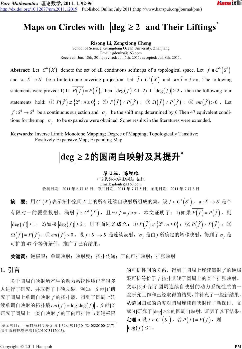 ![]() Pure Mathematics 理论数学, 2011, 1, 92-96 http://dx.doi.org/10.12677/pm.2011.12019 Published Online July 2011 (http://www.hanspub.org/journal/pm/) Copyright © 2011 Hanspub PM Maps on Circles with deg 2 and Their Liftings* Risong Li, Zengxiong Cheng School of Science, Guangdong Ocean University, Zhanjiang Email: gdoulrs@163.com Received: Jun. 18th, 2011; revised: Jul. 5th, 2011; accepted: Jul. 8th, 2011. Abstract: Let denote the set of all continuous selfmaps of a topological space. Let 0 CX 01 f CS and 1 π: X S be a finite-to-one covering projection. Let 0 f CX and ππ f f . The following statements were proved: 1) If Pf Pf , then deg 1f . 2) If deg 2f,then the following four statements hold: ① 2: 0 n Pf n ; ② Pf Pf ; ③ f Pf ent ; ④. Let 0f 11 : f SS be a continuous surjection and f be the shift map determined by f. Then 47 equivalent condi- tions for the map f to be expansive were obtained. Some results in the literatures were extended. Keywords: Inverse Limit; Monotone Mapping; Degree of Mapping; Topologically Tansitive; Positively Expansive Map; Expanding Map deg 2的圆周自映射及其提升* 黎日松,陈增雄 广东海洋大学理学院,湛江 Email: gdoulrs@163.com 收稿日期:2011 年6月18 日;修回日期:2011 年7月5日;录用日期:2011 年7月8日 摘 要:用表示拓扑空间 X上的所有连续自映射所组成的集。设 0 CX 01 f CS,1 π: X S 是个 有限对一的覆叠投射,满射 0 f CX ,且 ππ f f 。本文证明了:1)如果 Pf Pf ,则 deg 1f。2)如果 degf2,则下面四条成立:① 0n2: n Pf ;② Pf Pf ;③ ;④ 。设 fP f 0ent f 1 :1 f SS是连续满射, f 是由 f所确定的转移映射,得到了 f 是 可扩的 47 个等价条件,推广了已有结果。 关键词:逆极限;单调映射;映射度;拓扑传递;正向可扩映射;扩张映射 1. 引言 关于圆周自映射所产生的动力系统性质已有很多 人进行了研究,并取得了丰硕成果。例如:文献[1]研 究了圆周上单调自映射 f的拓扑熵,得到了圆周上连 续单调自映射的拓扑熵 log degent ff。文 献 [2] 研究了圆周上一类自映射 f的正向可扩性与其逆极限 的可扩性间的关系,得到了圆周上连续满射 f的逆极 限可扩等价于 f拓扑共轭于圆周上的某个扩张映射。 文献[3]介绍了圆周连续自映射的动力系统性质的一 些研究工作和已经取得的结果,并补充了一些新结果, 从链回归点的角度对圆周连续自映射作了新探讨。文 献[4]研究了 deg 2的圆周自映射,证明了以下结果: 定理 A设 01 fCS,若 Pf Pf,则 deg 1 *基金项目:广东自然科学基金博士启动项目(10452408801004217), 湛江市科技攻关项目(2010C3112005)。 f 。 ![]() 黎日松 等 | deg 2的圆周自映射及其提升 Copyright © 2011 Hanspub PM 93 定理 B设,若 01 fCSdeg 2,则下面四条成立: ① 20 n Pf n;② Pf Pf; ③ f Pf;④ 。 0ent f 由于任一映射 及其逆极限空间上的转 移自映射 :fX X f 都是映射f本身的提升,故映射f的提升 所具有的动力系统性质实际上就是 f本身的所具有的 动力系统性质的推广。众所周知,单调性、可扩性和 拓扑传递属性都是圆周自映射的动力系统中的重要性 质。 本文在文献[1-4]的基础上,利用映射的单调性、 可扩性和拓扑传递属性来进一步研究deg 2的圆周 自映射及其提升的动力学性质。因此研究圆周连续自 映射 f的提升所具有的性质是一件有意义的工作。 2. 预备知识 本文中分别表示实数集和整数集,用 表示 复平面上的单位圆周,其中 ,RZ 1 S 2 ex 122 π ,1,, ix Sxyxy xyRRR (见文献[2,3,5])。用表示 X上所有连续自映射 的集合。 0 CX 设 , X d 0 是度量空间, 是一个同胚映 射(连续满射),称 f是可扩的(正向可扩的),若存在常 数,使得对任意 :fX X ,,e x yXxy y e ,存在整数(非负 整数)n,使得 df 。 , nn x f 1 映射 定义为 :ER S 1 2π e, ix zEx , x Rz S : ,称此映射 E为从直线R到单位圆周 的覆叠投射。设 ,若存在连续映射 1 S 01 SfC F RR,使,则称 F是f的一个提升。 而称 EF f 1 E F xFx 为f的映射度( x R),记为 deg f 。 定义 1[6] 设, X X 是两个拓扑空间,π: X X 是 一个连续映射。开子集U称为被平均覆盖,如 果 是 Xπ 1U X π 的一些开子集的无交并,且这些开子集 中的每一个在的作用下均同胚于 U。 定义 2[6] 一个连续映射 π: X X 称为一个覆叠 投射,如果对于 X中的每一点 x,均有 x的一个被 平 均覆盖的开邻域。此时,称 π X 为这个覆叠投射的覆叠 空间,并称 X为这个覆叠投射的底空间。 定义 3 设: f XX为连续映射, : f XX 为 连续满射, π: X X 为一个覆叠投射,且 ππ f f 则称动力系统 , X f 是动力系统 , X f的一个提升 系统,且称f是f的一个提升。 定义 4 覆叠投射 π: X X 称为有限对一的,如 果对每个 x X , 1 π x 均为有限集。 本文所涉及的其它概念和记号可参考文献 [2,3,5,7-12]。 从文献[10]的定义2.20 及注记 2.34 的证明,可知 有限对一的覆叠投射是大量存在的。 3. 结果及其证明 引理 1设 0 f CX,π: X X 是个有限对一 的覆叠投射,满射 0 f CX ,且 ππ f f 。则 x X 为f的n 周期点当且仅当对每个 1 πyx , y 为 f 的周期点且其周期必为 n的倍数. 证明 设 x X 为f的 周期点,n 1 πyx 。由 ππ f f ,得 ,于是ππ nn ff πn f y π n f yx 。故 1 π n f y x 。由于 1 π x 是有 限集且 1 11 :ππ n x f x x 为双射。由离散数学 的有关知识知 1 π x 的每一点均为 n f 的周期点。从而 1 π x 的每一点均为 f 的周期点。设有某个 yx 1 π , y 为 f 的周期点k kn 。故 ππ kk f yf yx ,从而 k f xx。这与 x X 为f的n 周期点相矛盾。由此也可知 y 的周期必为 n 的倍数。 定理 1设 01 f CS,1 π: X S 是个有限对一 的覆叠投射, 0 f CX ,且 ππ f f 。如果 Pf Pf ,则 deg 1f。 证