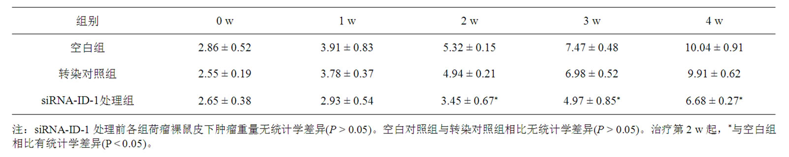 分别于第0,1,2,3,4 w末,称量并记录荷瘤裸鼠的体重变化。结果显示,从siRNA-ID-1处理第2周起,处理组荷瘤裸鼠体重增长速度减缓,与对照组相比肿瘤体重差别有统计学意义(P < 0.05)。见表1。