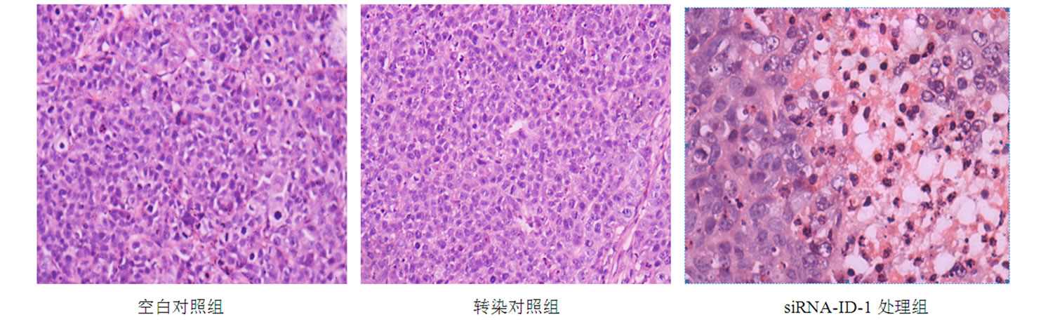见图2。空白对照及转染对照组见肿瘤细胞呈多角形,聚集成团,核大深染,核分裂象较多。siRNA-ID- 1处理组见片状变性坏死,多数胞核完全溶解,细胞结构消失,可见多量凋亡细胞,胞质浓缩,胞核深染固缩,染色体成团块状。周围肿瘤细胞与对照组相比残留较少,可见间质炎性反应增多、淋巴细胞浸润明显。