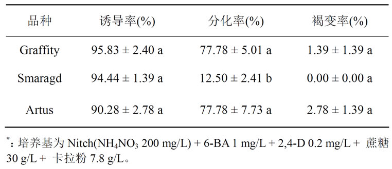 由表3可知,“Graffity”、“Smaragd”和“Artus”的无菌苗叶片的愈伤组织诱导率(F = 1.63,P > 0.05)和褐变率(F = 1.50,P > 0.05)差异不显著。在三个品种的愈伤