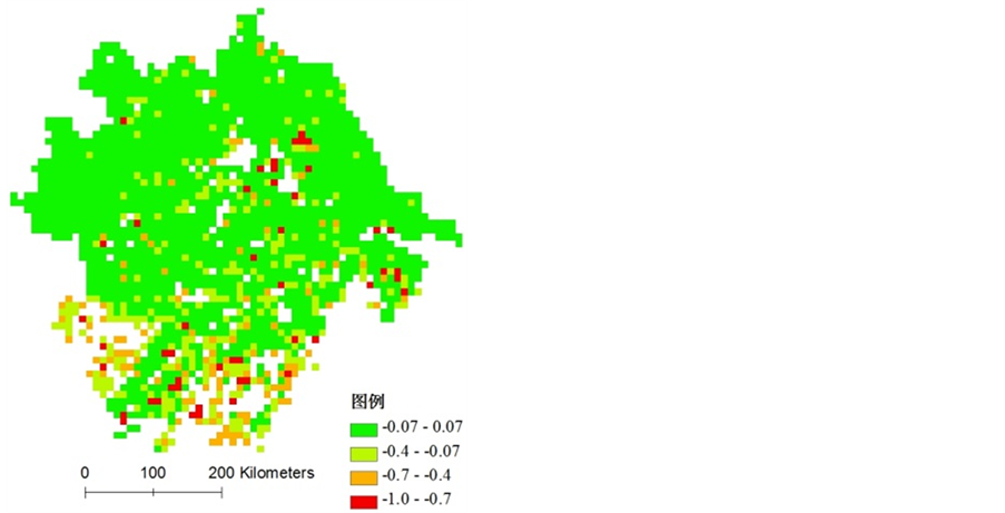 将1980s的耕地数据按照模型1进行分配,并按照(模型数据–遥感数据)/遥感数据的方法分别计算两者的相对误差,得到结果如图2。结果显示:模型1的结果误差较小,相对误差主要集中在−0.07~0.07范围内,只有零星的几个网格误差值较大。