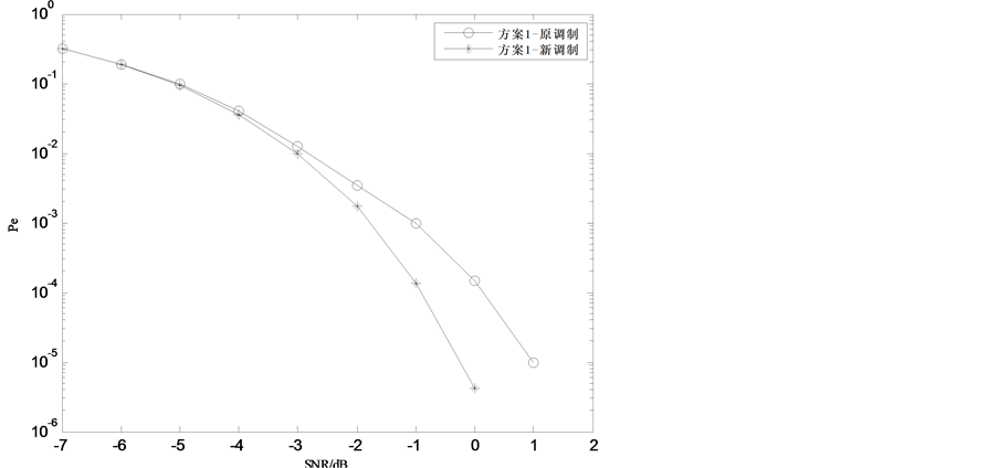 结果如图1所示:从横向比较,3种方案对改进MPPSK调制信号的解调性能均要好于原调制方式,同一误码率量级下的信噪比提升量都在2dB以上,方案3更是在误码率为10−3量级时就已比原调制方式有了7 dB的显著改善;而均以最优方案为例,改进MPPSK调制在误码率为10−3量级时较原调制方式性能提升了5 dB。为保证结论的全面性,图2又给出了仅噪声污染时两种调制方式的性能对比,很显然仍以改进MPPSK调制信号更占优势,在误码率为10−5量级时有超过1 dB的提升。