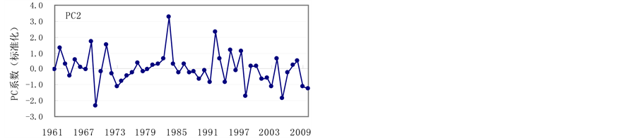 PC1的变化和区域平均值一致,代表南方降水的整体演变。从年代变化分析,自1961年以来,中国南方冬季降水经历了两个波动阶段:1960s~1970s中期降水增加,以偏多为主,1970s后期降水减少,以偏少为主;1980s~1990s后期增加,1990s后期以来处在减少阶段,这一阶段降水以偏多为主。降水的这种演变趋势在区域分布上有一定差异,在后面的分区中将进一步讨论。