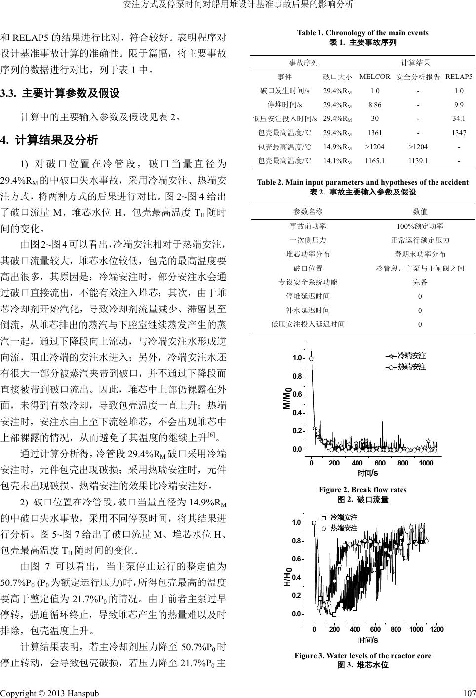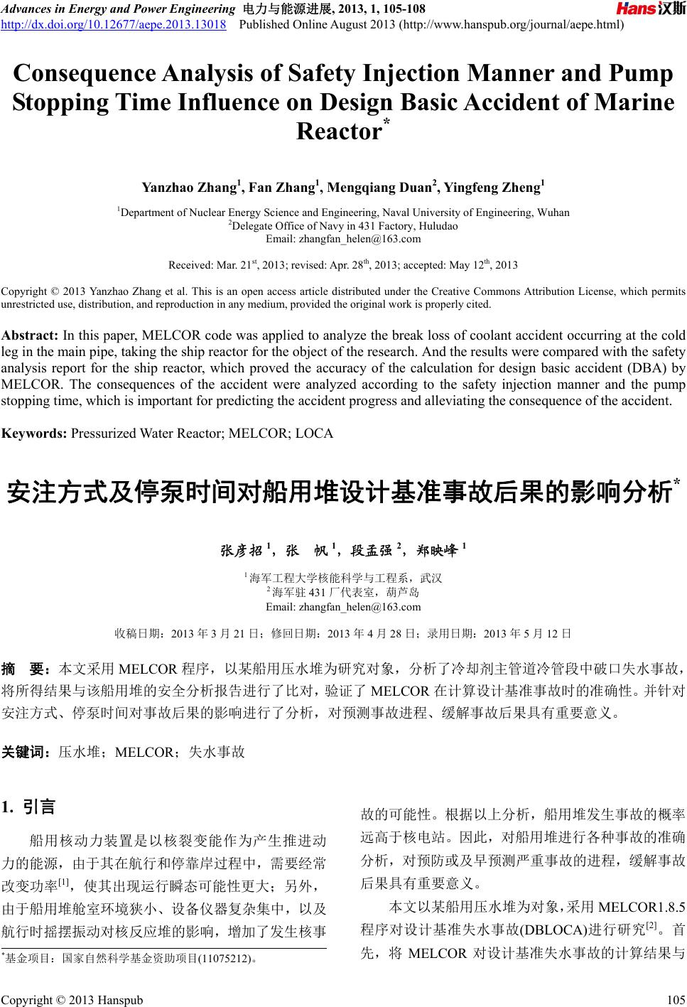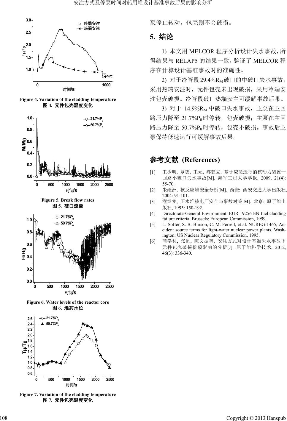 ![]() Advances in Energy and Power Engineering 电力与能源进展, 2013, 1, 105-108 http://dx.doi.org/10.12677/aepe.2013.13018 Published Online August 2013 (http://www.hanspub.org/journal/aepe.html) Consequence Analysis of Safety Injection Manner and Pump Stopping Time Influence on Design Basic Accident of Marine Reactor* Yanzhao Zhang1, Fan Zhang1, Mengqiang Dua n2, Y ingfeng Zheng1 1Department of Nuclear Energy Science and Engineering, Naval University of Engineering, Wuhan 2Delegate Office of Navy in 431 Factory, Huludao Email: zhangfan_helen@163.com Received: Mar. 21st, 2013; revised: Apr. 28th, 2013; accepted: May 12th, 2013 Copyright © 2013 Yanzhao Zhang et al. This is an open access article distributed under the Creative Commons Attribution License, which permits unrestricted use, distribution, and reproduction in any medium, provided the original work is properly cited. Abstract: In this paper, MELCOR code was applied to analyze the break loss of coolant accident occurring at the cold leg in the main pipe, taking the ship reactor for the object of the research. And the results were compared with the safety analysis report for the ship reactor, which proved the accuracy of the calculation for design basic accident (DBA) by MELCOR. The consequences of the accident were analyzed according to the safety injection manner and the pump stopping time, which is important for predicting the accident progress and alleviating the consequence of the accident. Keywords: Pressurized Water Reactor; MELCOR; LOCA 安注方式及停泵时间对船用堆设计基准事故后果的影响分析* 张彦招 1,张 帆1,段孟强 2,郑映峰 1 1海军工程大学核能科学与工程系,武汉 2海军驻 431 厂代表室,葫芦岛 Email: zhangfan_helen@163.com 收稿日期:2013 年3月21 日;修回日期:2013 年4月28 日;录用日期:2013 年5月12 日 摘 要:本文采用 MELCOR 程序,以某船用压水堆为研究对象,分析了冷却剂主管道冷管段中破口失水事故, 将所得结果与该船用堆的安全分析报告进行了比对,验证了 MELCOR 在计算设计基准事故时的准确性。并针对 安注方式、停泵时间对事故后果的影响进行了分析,对预测事故进程、缓解事故后果具有重要意义。 关键词:压水堆;MELCOR;失水事故 1. 引言 船用核动力装置是以核裂变能作为产生推进动 力的能源,由于其在航行和停靠岸过程中,需要经常 改变功率[1],使其出现运行瞬态可能性更大;另外, 由于船用堆舱室环境狭小、设备仪器复杂集中,以及 航行时摇摆振动对核反应堆的影响,增加了发生核事 故的可能性。根据以上分析,船用堆发生事故的概率 远高于核电站。因此,对船用堆进行各种事故的准确 分析,对预防或及早预测严重事故的进程,缓解事故 后果具有重要意义。 本文以某船用压水堆为对象,采用 MELCOR1.8.5 程序对设计基准失水事故(DBLOCA)进行研究[2]。首 先,将 MELCOR 对设计基准失水事故的计算结果与 *基金项目:国家自然科学基金资助项目(11075212)。 Copyright © 2013 Hanspub 105 ![]() 安注方式及停泵时间对船用堆设计基准事故后果的影响分析 该船用堆的安全分析报告进行比对,验证此程序对设 计基准事故计算的准确性。然后,应用 MELCOR 程 序对船用堆典型事故——中破口失水事故进行分析计 算,主要分两个方面进行研究:1) 破口位置在冷管段, 位置在主闸阀和主泵之间,破口当量直径为 29.4%RM (主管道内径),分别采用冷端安注与热端安注方式, 分析计算不同的事故后果。2) 破口位置在冷管段,破 口当量直径为 14.9%RM,分析主泵停转时间不同对事 故后果的影响。 2. 程序简介与系统模拟 2.1. 程序简介 MELCOR 程序是由桑地亚国家实验室(SNL)为美 国核管会开发的严重事故分析程序,能模拟轻水反应 堆严重事故进程的主要现象,计算放射性核素的释放 及其后果。MELCOR 程序是模拟严重事故全过程的一 体化程序包,经过许多试验数据的验证和严重事故分 析程序的相互验证,对事故进程的模拟具有很高的可 信度,也是 IAEA 向世界推荐使用的严重事故分析程 序之一,在国际上有数十个国家和地区的用户在使用 这个程序。 MELCOR 程序不仅能计算严重事故,也能进行设 计基准事故的分析。为验证本程序对船用堆计算结果 的准确性,首先我们进行了稳态运行计算,并与实际 运行参数进行了比对,验证了稳态计算的准确性;然 后针对设计基准事故,将相同事故序列下的 MELCOR 的计算结果与该船用堆的安全分析报告进行了比对, 进一步验证本程序的对设计基准事故计算的准确性。 在此基础上所进行的严重事故分析,才能确保合理、 可信。 2.2. 系统模拟与节点划分 反应堆冷却剂系统由主冷却剂管道、主泵、蒸汽 发生器一次侧、稳压器、安注箱、安注泵和堆芯等部 件组成[3]。根据船用堆特点,将系统划分为多个控制 体,控制体之间以流道连接。 MELCOR 采用 COR程序包计算堆芯、下腔室内 部结构的热工、水力响应,为了将堆芯的传热分布细 化,以便于研究轴向和径向的热量产生及传递,将堆 芯活性区及下腔室进行区域节点划分,堆芯及下腔室 节点的划分如图 1所示,为准确描述设计基准事故后 果,将船用堆堆芯径向划分为 7个同心圆环,轴向划 分为 14层,其中堆芯活性区部分分为 12段,下腔室 分为 2段,包括下管板和下腔室。 3. 分析方法和模型验证 3.1. 分析方法 DBLOCA 事故发生时,安注水若不能及时弥补泄 漏的水量,将会导致堆芯裸露,包壳温度迅速上升, 锆合金包壳与过热水蒸汽发生显著的锆–水反应,如 果化学反应过度,会导致包壳脆化破裂。失水事故分 析时,包