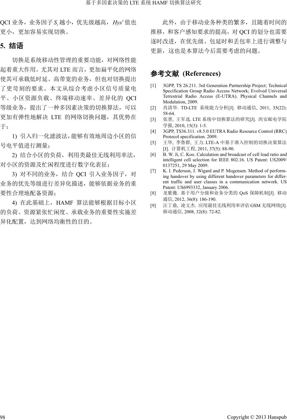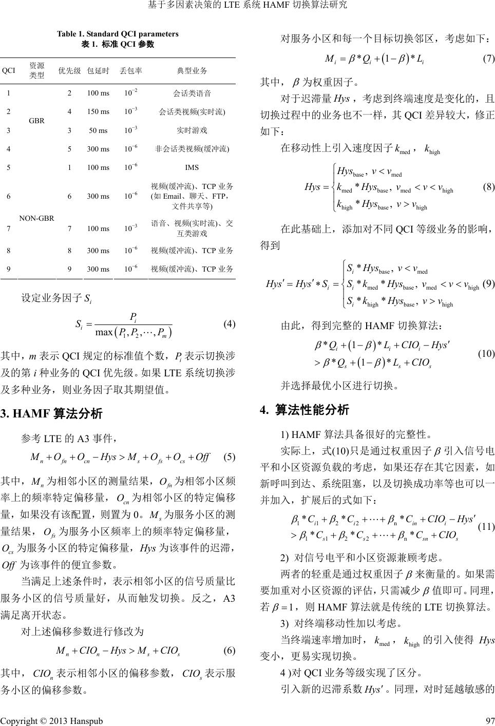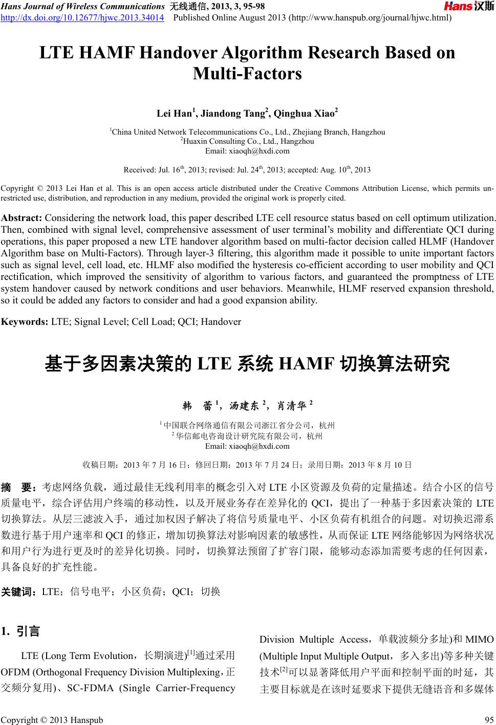 ![]() Hans Journal of Wireless Communications 无线通信, 2013, 3, 95-98 http://dx.doi.org/10.12677/hjwc.2013.34014 Published Online August 2013 (http://www.hanspub.org/journal/hjwc.html) LTE HAMF Handover Algorithm Research Based on Multi-Factors Lei Han1, Jiandong Tang2, Qinghua Xiao2 1China United Network Telecommunications Co., Ltd., Zhejiang Branch, Hangzhou 2Huaxin Consulting Co., Ltd., Hangzhou Email: xiaoqh@hxdi.com Received: Jul. 16th, 2013; revised: Jul. 24th, 2013; accepted: Aug. 10th, 2013 Copyright © 2013 Lei Han et al. This is an open access article distributed under the Creative Commons Attribution License, which permits un- restricted use, distribution, and reproduction in any medium, provided the original work is properly cited. Abstract: Considering the network load, this paper described LTE cell resource status based on cell optimum utilization. Then, combined with signal level, comprehensive assessment of user terminal’s mobility and differentiate QCI during operations, this paper proposed a new LTE handover algorithm based on multi-factor decision called HLMF (Handover Algorithm base on Multi-Factors). Through layer-3 filtering, this algorithm made it possible to unite important factors such as signal level, cell load, etc. HLMF also modified the hysteresis co-efficient according to user mobility and QCI rectification, which improved the sensitivity of algorithm to various factors, and guaranteed the promptness of LTE system handover caused by network conditions and user behaviors. Meanwhile, HLMF reserved expansion threshold, so it could be added any factors to consider and had a good expansion ability. Keywords: LTE; Signal Level; Cell Load; QCI; Handover 基于多因素决策的 LTE系统 HAMF 切换算法研究 韩 蕾1,汤建东 2,肖清华 2 1中国联合网络通信有限公司浙江省分公司,杭州 2华信邮电咨询设计研究院有限公司,杭州 Email: xiaoqh@hxdi.com 收稿日期:2013 年7月16 日;修回日期:2013年7月24日;录用日期:2013 年8月10 日 摘 要:考虑网络负载,通过最佳无线利用率的概念引入对 LTE 小区资源及负荷的定量描述。结合小区的信号 质量电平,综合评估用户终端的移动性,以及开展业务存在差异化的 QCI,提出了一种基于多因素决策的 LTE 切换算法。从层三滤波入手,通过加权因子解决了将信号质量电平、小区负荷有机组合的问题。对切换迟滞系 数进行基于用户速率和QCI 的修正,增加切换算法对影响因素的敏感性,从而保证 LTE 网络能够因为网络状况 和用户行为进行更及时的差异化切换。同时,切换算法预留了扩容门限,能够动态添加需要考虑的任何因素, 具备良好的扩充性能。 关键词:LTE;信号电平;小区负荷;QCI;切换 1. 引言 LTE (Long Term Evolution,长期演进)[1]通过采用 OFDM (Orthogonal Frequency Division Multiplexing,正 交频分复用)、SC-FDMA (Single Carrier-Frequency Division Multiple Access,单载波频分多址)和MIMO (Multiple Input Multiple Output,多入多出)等多种关键 技术[2]可以显著降低用户平面和控制平面的时延,其 主要目标就是在该时延要求下提供无缝语音和多媒体 Copyright © 2013 Hanspub 95 ![]() 基于多因素决策的 LTE 系统 HAMF 切换算法研究 接入服务。这个目标的实现需要从服务小区到目标小 区的切换支持。由于 eNB 之间不存在宏分集,LTE 中 仅存在硬切换,同时又必须保证用户感知不会受到切 换机制的影响,从而对切换算法提出了更高的要求。 同3G系统类似,LTE 的切换过程也包括四方面: 链路的监视和测量、目标小区的确定、切换的触发和 切换的执行。其中以切换的触发最为重要,涉及到信 号功率、门限信号功率、滞后量的信号功率等标准。 所不同的是,LTE 在对信号进行测量后,需要借助层 一和层三的滤波[3],从而提高测量结果的稳定性。LTE 协议[4]定义了切换测量报告触发机制,包括A1、A2、 A3、A4、A5、B1 和B2事件,其中 B1 和B2 事件主 要用于异 RAT (Radio Access Technology,无线接入技 术)间的切换测量,LTE 系统内切换主要使用 A1、A2 和A3事件。考虑到 A1和A2 分别用于结束和启动异 频测量,条件简单,本文不作过多研究。A3 事件最经 常用于触发切换,反映了相邻/目标小区的信号质量, 关于这方面的研究也日益增多。张普等[3]根据无线信 道状况,动态调整切换参数,提出一种自适应切换算 法,王华等[5]提出了一种基于准入控制的切换算法, Baowei Ji等[6]提出了一种基于网络负载率的小区选择 算法,甚至 Klaus Ingemann Pederson[7]等将用户分成 金、银、铜等级,综合考虑这些因素,不同优先级的 业务配置不同的切换参数集合。以上这些切换算法均 考虑到影响切换的因素很多,单纯考虑信号质量已经 不能满足网络和用户需求。遗憾的是,这些算法均比 较片面地突出分析某类因素的影响,而不是综合考虑, 在设定参数时采取不同的配置从而导致增加对系统的 负担。同时,对具备不同 QCI (QoS Class Identifier, QoS 等级指示)的业务,如何实施差异化的切换也未研究。 为此,本文从小区信号质量、小区资源负载、用户业 务等级等因素出发,全面评估切换过程的影响因素, 提出一种基于多因素决策的 HAMF 切换算法(Hand- over Algorithm based on Multi-Factors)。 2. 多因素分析 切换决策时需要考虑的因素主要包含两大类:网 络信息和用户信息。网络信息包括信号电平值、网络 负载资源等。而用户侧更关注业务的连续性,不同的 业务等级要求不同,在此可以参考 QCI,包括业务类 型、优先级、延时和丢包率等 4项指标[8]。 为表述方便,本文假定 表示不同小区的变量 参数,X代表信号电平值 Q、小区负载资源L,