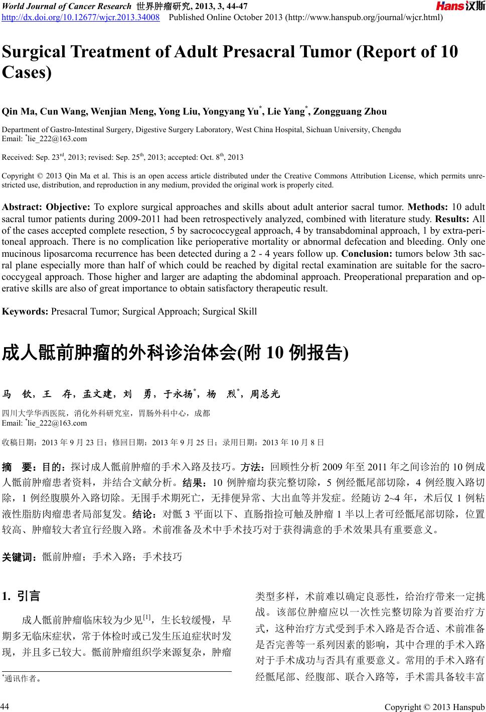 ![]() World Journal of Cancer Research 世界肿瘤研究, 2013, 3, 44-47 http://dx.doi.org/10.12677/wjcr.2013.34008 Published Online October 2013 (http://www.hanspub.org/journal/wjcr.html) Surgical Treatment of Adult Presacral Tumor (Report of 10 Cases) Qin Ma, Cun Wang, Wenjian Meng, Yong Liu, Yongyang Yu*, Lie Yang*, Zongguang Zho u Department of Gastro-Intestinal Surgery, Digestive Surgery Laboratory, West China Hospital, Sichuan University, Chengdu Email: *lie_222@163.com Received: Sep. 23rd, 2013; revised: Sep . 25th, 2013; accepted: Oct. 8th, 2013 Copyright © 2013 Qin Ma et al. This is an open access article distributed under the Creative Commons Attribution License, which permits unre- stricted use, distribution, and reproduction in an y medium, provided the original work is properl y cite d. Abstract: Objective: To explore surgical approaches and skills about adult anterior sacral tumor. Methods: 10 adult sacral tumor patients during 2009-2011 had been retrospectively analyzed, combined with literature study. Results: All of the cases accepted complete resection, 5 by sacrococcygeal approach, 4 by transabdominal ap proach , 1 by extr a-peri- toneal approach. There is no complication like perioperative mortality or abnormal defecation and bleeding. Only one mucinous liposarcoma recurrence has been detected during a 2 - 4 years follow up. Conclusion: tumors below 3th sac- ral plane especially more than half of which could be reached by digital rectal examination are suitable for the sacro- coccygeal approach. Those higher and larger are adapting the abdominal approach. Preoperational preparation and op- erative skills are also of great importance to obtain satisfactory therapeutic result. Keywords: Presacral Tumor; Surgical Approach; Surgical Skill 成人骶前肿瘤的外科诊治体会(附10 例报告) 马 钦,王 存,孟文建,刘 勇,于永扬*,杨 烈*,周总光 四川大学华西医院,消化外科研究室,胃肠外科中心,成都 Email: *lie_222@163.com 收稿日期:2013 年9月23 日;修回日期:2013 年9月25 日;录用日期:2013 年10 月8日 摘 要:目的:探讨成人骶前肿瘤的手术入路及技巧。方法:回顾性分析 2009 年至 2011 年之间诊治的10 例成 人骶前肿瘤患者资料,并结合文献分析。结果:10 例肿瘤均获完整切除,5例经骶尾部切除,4例经腹入路切 除,1例经腹膜外入路切除。无围手术期死亡,无排便异常、大出血等并发症。经随访 2~4 年,术后仅1例粘 液性脂肪肉瘤患者局部复发。结论:对骶 3平面以下、直肠指捡可触及肿瘤 1半以上者可经骶尾部切除,位置 较高、肿瘤较大者宜行经腹入路。术前准备及术中手术技巧对于获得满意的手术效果具有重要意义。 关键词:骶前肿瘤;手术入路;手术技巧 1. 引言 成人骶前肿瘤临床较为少见[1],生长较缓慢,早 期多无临床症状,常于体检时或已发生压迫症状时发 现,并且多已较大。骶前肿瘤组织学来源复杂,肿瘤 类型多样,术前难以确定良恶性,给治疗带来一定挑 战。该部位肿瘤应以一次性完整切除为首要治疗方 式,这种治疗方式受到手术入路是否合适、术前准备 是否完善等一系列因素的影响,其中合理的手术入路 对于手术成功与否具有重要意义。常用的手术入路有 经骶尾部、经腹部、联合入路等,手术需具备较丰富 *通讯作者。 Copyright © 2013 Hanspub 44 ![]() 成人骶前肿瘤的外科诊治体会(附10 例报告) 的经验和技巧。现就我院 2009 年至 2011 年经外科诊 治的成人骶前肿瘤病例进行分析,回顾文献,对手术 入路及手术技巧进行探讨。 2. 临床资料 2.1. 一般资料 本组病患男性 3例,女性 7例。年龄 23~44 岁, 平均年龄 33.2 岁。发病时间 5天~10 年。其中,5例 患者无明显临床症状,1例排尿困难,2例排便困难, 2例肛周疼痛。查体 1例腹部扪及包块,1例肛周触 及包块,8例经直肠指检扪及包块。10 例患者均行结 肠镜和彩超检查,未发现肠道新生物,彩超检查均发 现盆腔包块。其中 9例患者行术前 CT 检查,1例行 MRI 检查。包块最小5.6 cm × 6.0 cm × 6.9 cm,最大 12 cm × 10 cm × 8 cm。影像学检查均提示肿瘤与骶骨 无明细粘连、浸润。术前血清 CEA、CA-199、CA125、 CA72-4 检查,1例患者 CA72-4 升高,1例CA199 升 高,其余患者各肿瘤标志物均正常。肿瘤的病理类型 包括:1例粘液性脂肪肉瘤,1例高分化脂肪肉瘤,3 例成熟性畸胎瘤,3例上皮样囊肿,1例孤立性纤维 瘤,1例神经鞘瘤。 2.2. 手术入路选择 根据术前 CT、MRI 彩超定位肿瘤部位、大小及 与骶骨及周围重要组织的关系,分别采用经骶尾部、 经腹部及经腹膜外入路进行手术。对于肿瘤位于第 3 骶骨以下、与周围重要脏器无粘连,且直肠指诊可触 及瘤体一半以上者,经骶尾部切除(图1)。位置较高、 肿瘤较大者经腹部或腹膜外入路进行手术(图2)。 Figure 1. This low sacoma which is emphasized by a red circle and arrow was removed by sacrococcygeal approach 图1. 低位肉瘤患者经骶尾部入路切除,红色箭头所指及框内所示 即为肿瘤 Figure 2. The higher and larger tumor which is emphasized by red circle and arrow adapted anterior abdominal approach 图2. 高位且体积较大肿瘤经腹前入路切除,红色箭头所指及框内 所示即为肿瘤 2.3. 手术方法 经腹前入路:患者取截石位,采用下腹正中切口, 向上绕脐。沿乙状结肠系膜根部向下切开腹膜反折 部,显露盆底组织,游离直肠后将其牵拉向健侧,于 直视下沿肿瘤包膜(或假包膜边缘)锐性分离,确切保 护盆腔植物神经、输尿管,避免损伤直肠、阴道及骶 前静脉丛,完整剥除肿瘤。 经骶尾部入路:患者取俯卧折刀位,根据肿瘤部 位。切口选择经左或右侧骶骨旁开 1~2 cm,切口自尾 骨
