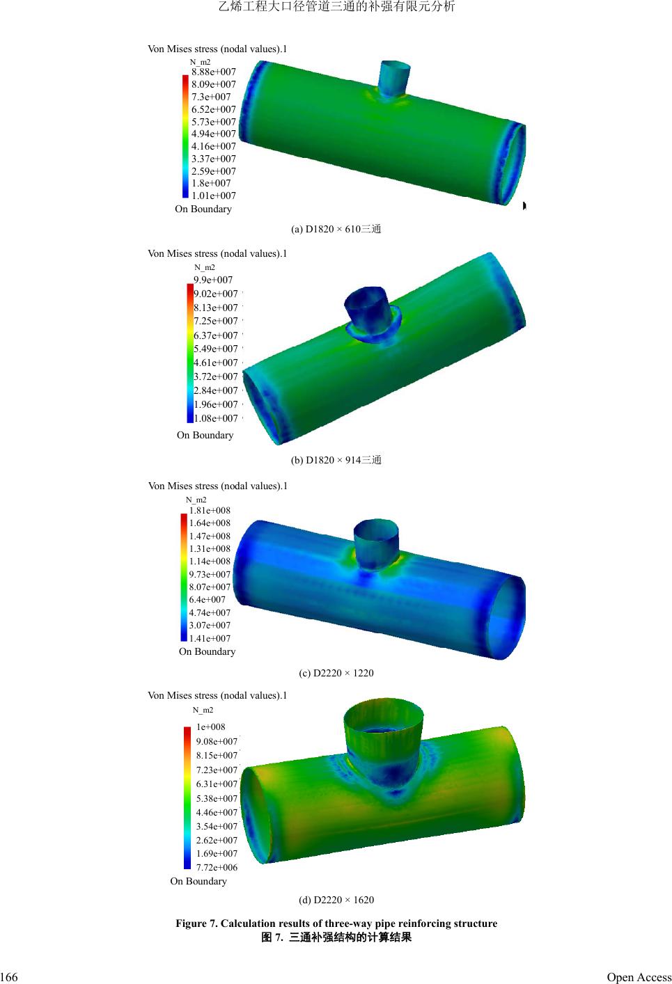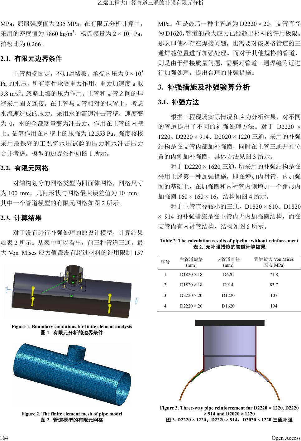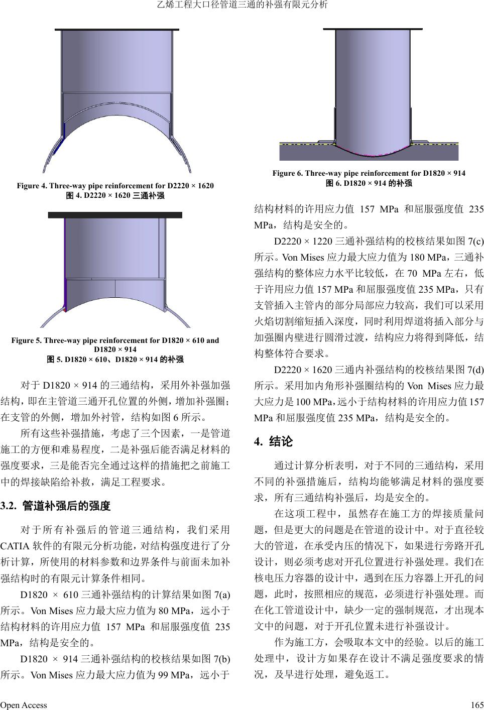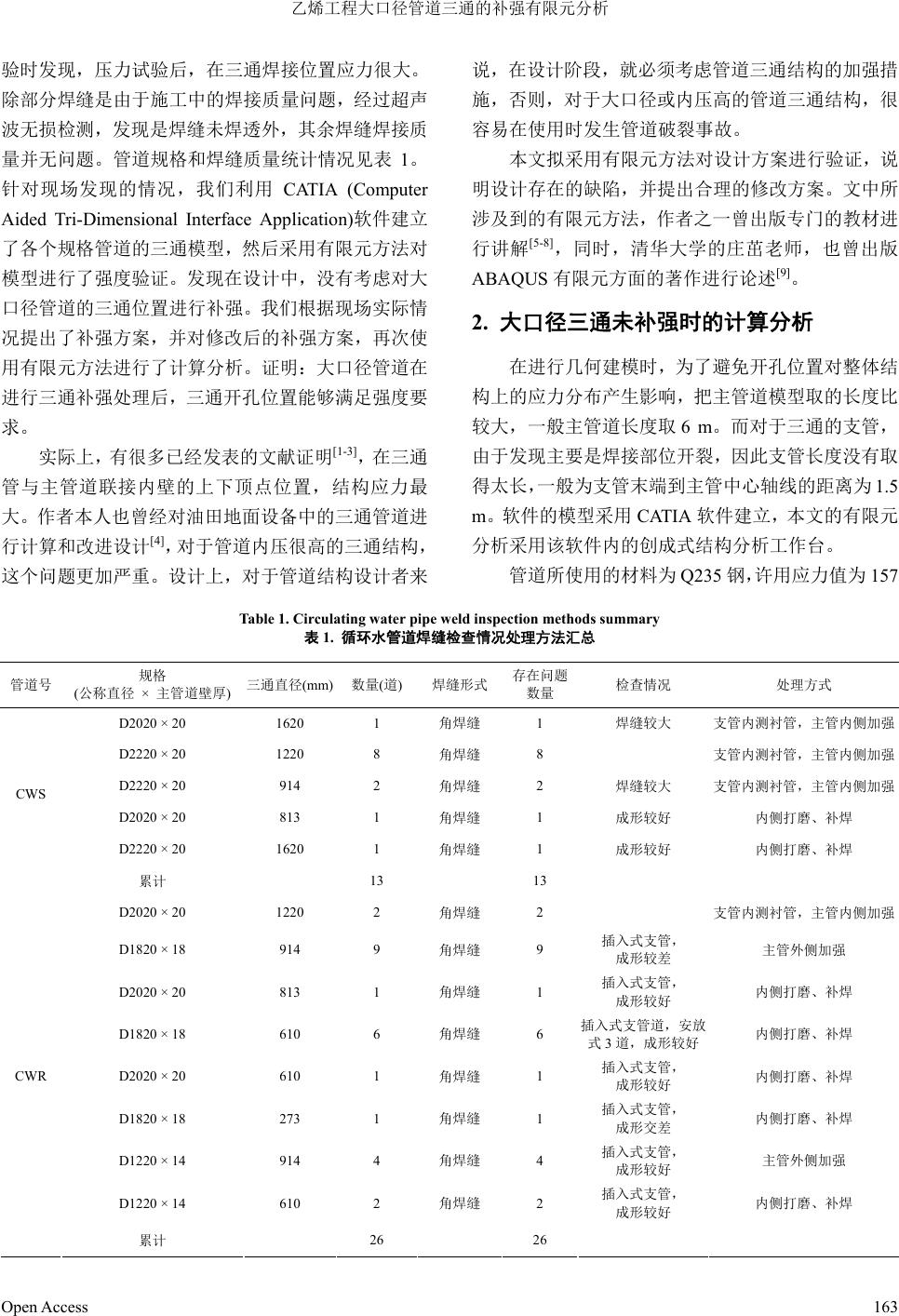 ![]() Mechanical Engineering and Technology 机械工程与技术, 2013, 2, 162-167 http://dx.doi.org/10.12677/met.2013.24031 Published Online December 2013 (http://www.hanspub.org/journal/met.html) Finite Element Analysis on Large-Diameter Pipe Tee Reinforcing in Ethylene Project Yongchao Bai1, Daojing Qu1, Xuanyu Sheng2, Yi tong Shang3 1Daqing Oilfield Construction Group, Daqing 2Institute of Nuclear and New Energy Technology, Tsinghua University, Beijing 3School of Automation, Qingdao Technological University, Huangdao Campus, Qingdao Email: shxyzjh@126.com Receiv ed: Aug . 10th, 2013; revised: Sep. 8th, 2013; accepted: Sep. 17th, 2013 Copyright © 2013 Yongchao Bai et al. This is an open access article distributed under the Creative Commons Attribution License, which permits unrestricted use, distribution, and reproduction in any medium, provided the original work is properly cited. In accordance of the Creative Commons Attribution License all Copyrights © 2013 are reserved for Hans and the owner of the intellectual property Yongchao Bai et al. All Copyright © 2013 are guarded by law and by Hans as a guardian. Abstract: For major pipeline system in large-scale ethylene project, through finite elemen t analysis check ing, we prove that pipe tee structure needs to be strengthened. Under the condition that actual construction had already been com- pleted in the field, we proposed online enhancement method for the large-scale pipeline tee combined with finite ele- ment analysis. According to the difficulty of construction and personnel reachability, we selected the inside additional reinforcement ring, additional liner pipe, as well as the enhancement circle and liner p ipe together with the angular en- hancement circle again. Through the enhanced processing, finite element analysis proved that pipe tee enhancement can meet the material allowable strength requirement. Keywords: Pipe Tee; Strength Analysis; Reinforcement Method 乙烯工程大口径管道三通的补强有限元分析 白永超 1,曲道晶 1,盛选禹 2,尚奕彤 3 1大庆油田建设集团,大庆市 2清华大学核能与新能源技术研究院,北京 3青岛理工大学黄岛校区自动化学院,青岛市 Email: shxyzjh@126.com 收稿日期:2013 年8月10 日;修回日期:2013 年9月8日;录用日期:2013 年9月17 日 摘 要:对大型乙烯工程中的大型管道系统,通过有限元分析验算,证明管道三通结构位置需要进行加强处理。 在实际施工已经完成的情况下,结合有限元分析,提出了大型管道三通的在线加强方法,根据施工的难易程度 和人员可达程度,分别选取了内侧加补强圈、增加内衬管,以及在加强圈和内衬管的基础上,再增加角形加强 圈。通过这样的加强处理后,有限元分析证明,管道三通位置能够满足材料的许用强度要求。 关键词:三通管道;强度分析;补强方法 1. 引言 三通结构常用于工业设计中。本文研究的三通结 构是应用于大型乙烯工程中的地下循环水系统,其结 构和普通工业使用三通基本相同,区别在于本文中所 研究的管道口径大,地下工作条件恶劣。 在对大型乙烯工程地下循环水管道进行打压试 Open Access 162 ![]() 乙烯工程大口径管道三通的补强有限元分析 验时发现,压力试验后,在三通焊接位置应力很大。 除部分焊缝是由于施工中的焊接质量问题,经过超声 波无损检测,发现是焊缝未焊透外,其余焊缝焊接质 量并无问题。管道规格和焊缝质量统计情况见表 1。 针对现场发现的情况,我们利用 CATIA (Computer Aided Tri-Dimensional Interface Application)软件建立 了各个规格管道的三通模型,然后采用有限元方法对 模型进行了强度验证。发现在设计中,没有考虑对大 口径管道的三通位置进行补强。我们根据现场实际情 况提出了补强方案,并对修改后的补强方案,再次使 用有限元方法进行了计算分析。证明:大口径管道在 进行三通补强处理后,三通开孔位置能够满足强度要 求。 实际上,有很多已经发表的文献证明[1-3],在三通 管与主管道联接内壁的上下顶点位置,结构应力最 大。作者本人也曾经对油田地面设备中的三通管道进 行计算和改进设计[4],对于管道内压很高的三通结构, 这个问题更加严重。设计上,对于管道结构设计者来 说,在设计阶段,就必须考虑管道三通结构的加强措 施,否则,对于大口径或内压高的管道三通结构,很 容易在使用时发生管道破裂事故。 本文拟采用有限元方法对设计方案进行验证,说 明设计存在的缺陷,并提出合理的修改方案。文中所 涉及到的有限元方法,作者之一曾出版专门的教材进 行讲解[5-8],同时,清华大学的庄茁老师,也曾出版 ABAQUS 有限元方面的著作进行论述[9]。 2. 大口径三通未补强时的计算分析 在进行几何建模时,为了避免开孔位置对整体结 构上的应力分布产生影响,把主管道模型取的长度比 较大,一般主管道长度取 6 m。而对于三通的支管, 由于发现主要是焊接部位开裂,因此支管长度没有取 得太长,一般为支管末端到主管中心轴线的距离为 1.5 m。软件的模型采用CATIA软件建立,本文的有限元 分析采用该软件内的创成式结构分析工作台。 管道所使用的材料为Q235 钢,许用应力值为157 Table 1. Circulating water pipe weld inspection methods summary 表1. 循环水管道焊缝检查情况处理方法汇总 管道号 规格 (公称直径 × 主管道壁厚)三通直径(mm) 数量(道) 焊缝形式 存在问题 数量 检查情况 处理方式 D2020 × 20 1620 1 角焊缝 1 焊缝较大 支管内测衬管,主管内侧加强 D2220 × 20 1220 8 角焊缝 8 支管内测衬管,主管内侧加强 D2220 × 20 914 2 角焊缝 2 焊缝较大 支管内测衬管,主管内侧加强 D2020 