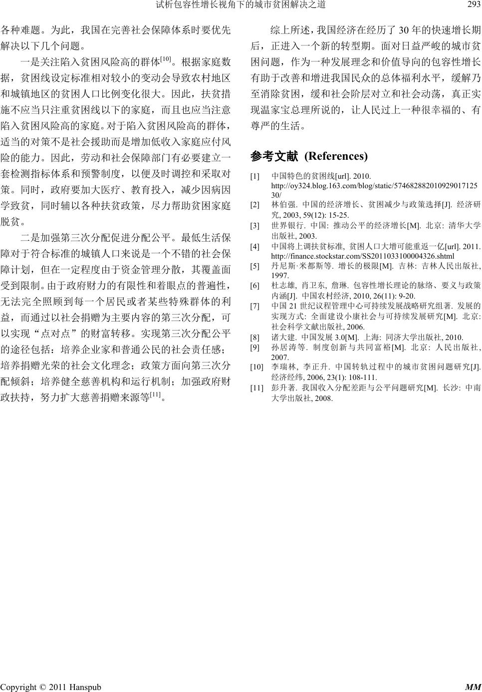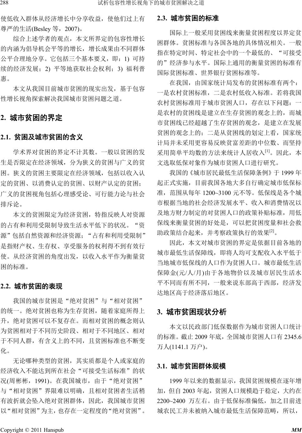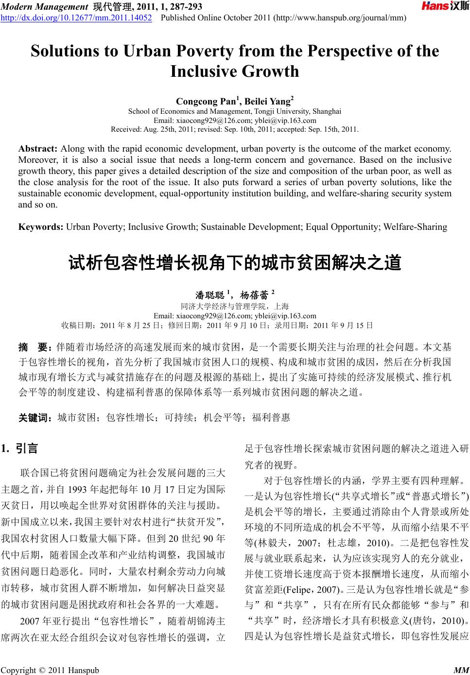 ![]() Modern Management 现代管理, 2011, 1, 287-293 http://dx.doi.org/10.12677/mm.2011.14052 Published Online October 2011 (http://www.hanspub.org/journal/mm) Copyright © 2011 Hanspub MM Solutions to Urban Poverty from the Perspective of the Inclusive Growth Congcong Pan1, Beilei Yang2 School of Economics and Management, Tongji University, Shanghai Email: xiaocong929@126. com; yblei@vip.163.com Received: Aug. 25th, 2011; revised: Sep. 10th, 2011; accepted: Sep. 15th, 2011. Abstract: Along with the rapid economic development, urban poverty is the outcome of the market economy. Moreover, it is also a social issue that needs a long-term concern and governance. Based on the inclusive growth theory, th is paper gives a detailed description of the size and composition of the urban poor, as well as the close analysis for the root of the issue. It also puts forward a series of urban poverty solutions, like the sustainable economic development, equal-opportunity institution building, and welfare-sharing security system and so on. Keywords: Urban Poverty; Inclusive Growth; Sustainable Development; Equal Opportunity; Welfare-Sharing 试析包容性增长视角下的城市贫困解决之道 潘聪聪 1,杨蓓蕾 2 同济大学经济与管理学院,上海 Email: xiaocong929@126. com; yblei@vip.163.com 收稿日期:2011 年8月25日;修回日期:2011 年9月10 日;录用日期:2011 年9月15 日 摘 要:伴随着市场经济的高速发展而来的城市贫困,是一个需要长期关注与治理的社会问题。本文基 于包容性增长的视角,首先分析了我国城市贫困人口的规模、构成和城市贫困的成因,然后在分析我国 城市现有增长方式与减贫措施存在的问题及根源的基础上,提出了实施可持续的经济发展模式、推行机 会平等的制度建设、构建福利普惠的保障体系等一系列城市贫困问题的解决之道。 关键词:城市贫困;包容性增长;可持续;机会平等;福利普惠 1. 引言 联合国已将贫困问题确定为社会发展问题的三大 主题之首,并自 1993 年起把每年 10 月17 日定为国际 灭贫日,用以唤起全世界对贫困群体的关注与援助。 新中国成立以来,我国主要针对农村进行“扶贫开发”, 我国农村贫困人口数量大幅下降。但到 20 世纪 90年 代中后期,随着国企改革和产业结构调整,我国城市 贫困问题日趋恶化。同时,大量农村剩余劳动力向城 市转移,城市贫困人群不断增加,如何解决日益突显 的城市贫困问题是困扰政府和社会各界的一大难题。 2007 年亚行提出“包容性增长”,随着胡锦涛主 席两次在亚太经合组织会议对包容性增长的强调,立 足于包容性增长探索城市贫困问题的解决之道进入研 究者的视野。 对于包容性增长的内涵,学界主要有四种理解。 一是认为包容性增长(“共享式增长”或“普惠式增长”) 是机会平等的增长,主要通过消除由个人背景或所处 环境的不同所造成的机会不平等,从而缩小结果不平 等(林毅夫,2007;杜志雄,2010)。二是把包容性发 展与就业联系起来,认为应该实现穷人的充分就业, 并使工资增长速度高于资本报酬增长速度,从而缩小 贫富差距(Felipe,2007)。三是认为包容性增长就是“参 与”和“共享”,只有在所有民众都能够“参与”和 “共享”时,经济增长才具有积极意义(唐钧,2010)。 四是认为包容性增长是益贫式增长,即包容性发展应 ![]() 试析包容性增长视角下的城市贫困解决之道 288 使低收入群体从经济增长中分享收益,使他们过上有 尊严的生活(Besley等,2007)。 综合上述学者的观点,本文所界定的包容性增长 的内涵为倡导机会平等的增长,增长成果由不同群体 公平合理地分享。它包括三个基本要义,即:1) 可持 续的经济发展;2) 平等地获 取社会权利; 3) 福利普 惠。 本文从我国目前城市贫困的现实出发,基于包容 性增长视角探索解决我国城市贫困问题之道。 2. 城市贫困的界定 2.1. 贫困及城市贫困的含义 学术界对贫困的界定不计其数。一般以贫困的发 生是否限定在经济领域,分为狭义的贫困与广义的贫 困。狭义的贫困主要限定在经济领域,包括以收入认 定的贫困、以消费认定的贫困、以财产认定的贫困; 广义的贫困视角包括心理感受论、可行能力论与社会 排斥论。 本文的贫困限定为经济贫困,特指反映人对资源 的占有和利用受限制导致生活水平低下的状况。“资 源”包括自然资源和经济资源;“占有和利用受限制” 是指财产权、生存权、享受服务的权利得不到有效行 使。从经济贫困的角度出发,以收入水平作为衡量贫 困的标准。 2.2. 城市贫困的表现 我国的城市贫困是“绝对贫困”与“相对贫困” 的统一。绝对贫困也称为生存贫困,随着家庭所得上 升,绝对贫困可以不复存在。而相对贫困的概念则认 为贫困相对于不同历史阶段、相对于不同地区、相对 于不同人群,有含义上的不同,且贫困标准也不断变 化。 无论哪种类型的贫困,其实质都是个人或家庭的 经济收入不能达到所在社会“可接受生活标准”的状 况(周彬彬,1991)。在我国城市,由于“绝对贫困” 与“相对贫困”界限难以明确,且相对贫困者生活稍 有波折就会坠入绝对贫困群体,因此,我国城市贫困 以“相对贫困”为主,也存在一定程度的“绝对贫困”。 2.3. 城市贫困的标准 国际上一般采用贫困线来衡量贫困程度以界定贫 困群体。贫困标准与各国各地的具体情况相关。一般 指在特定时间、特定社会中的一个最低的、“可接受 的”经济参与水平。国际上通用的衡量贫困的标准有 国际贫困标准、世界银行