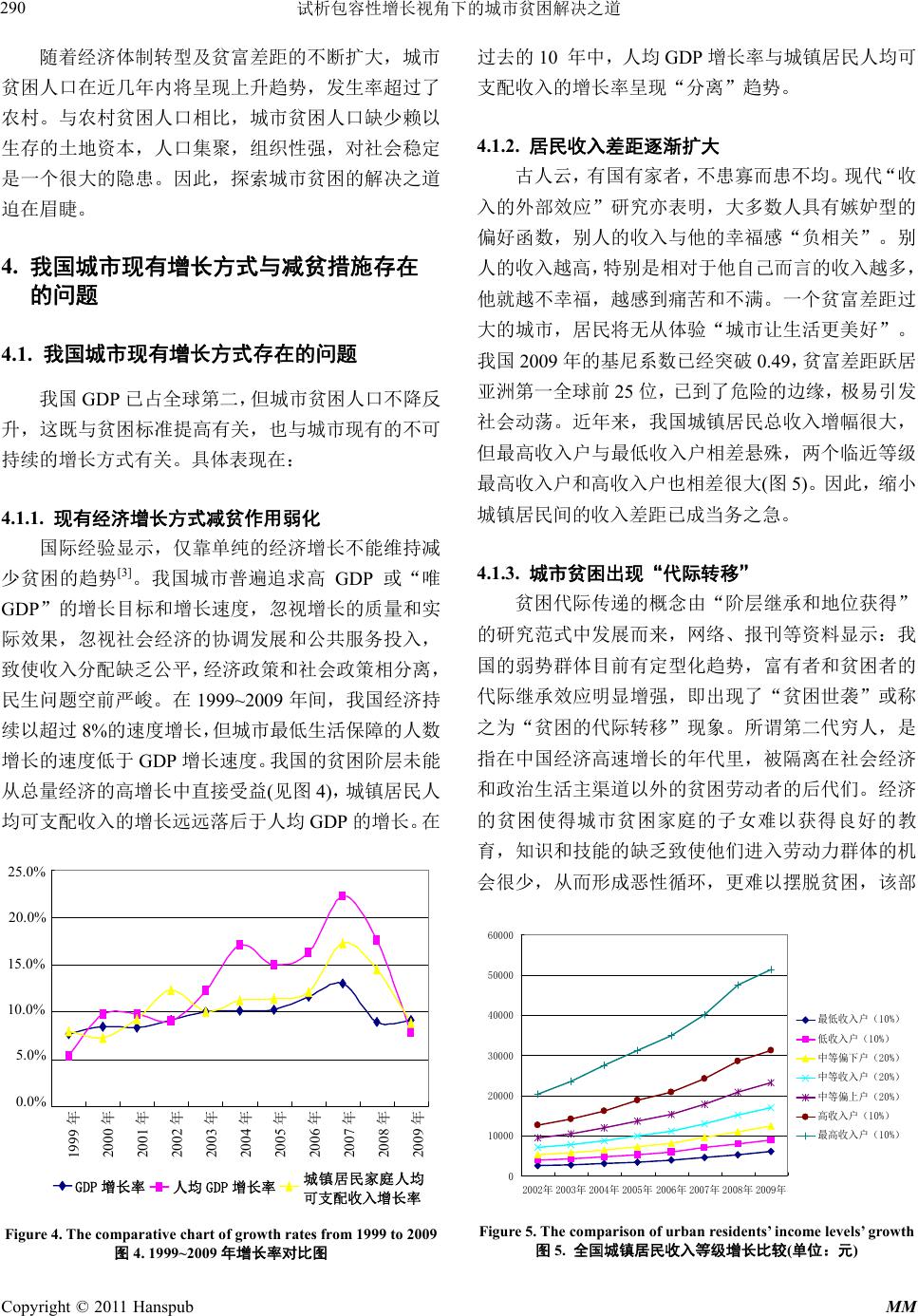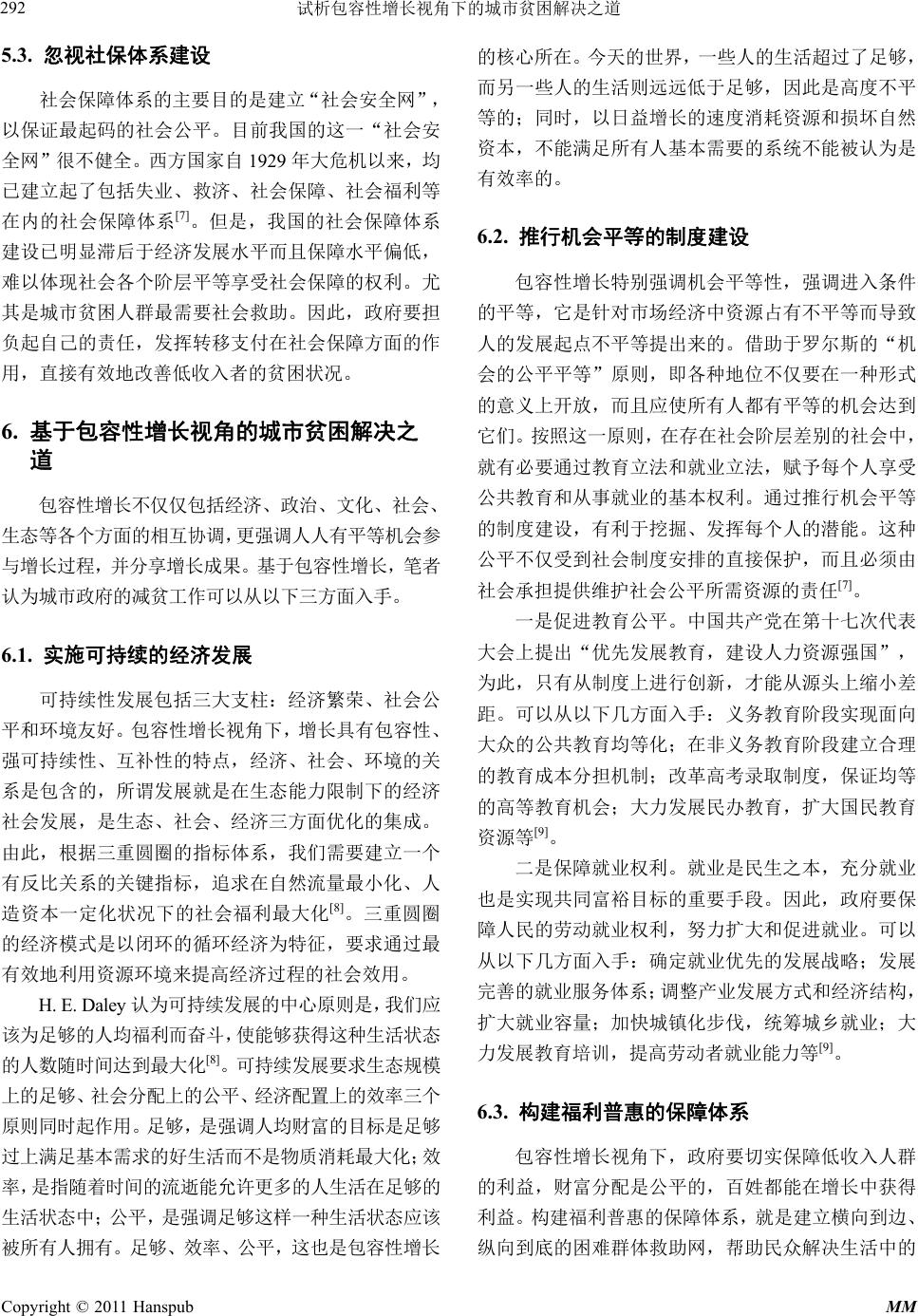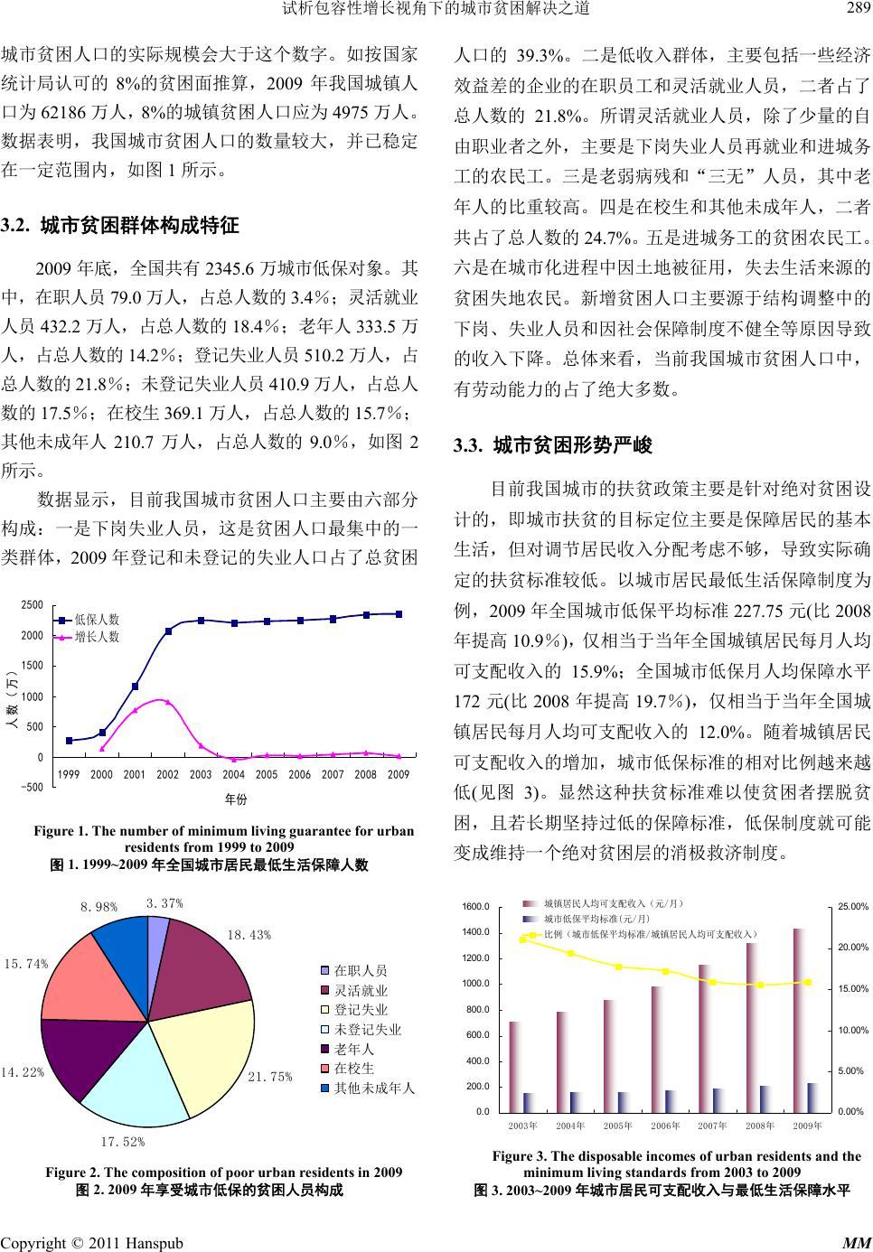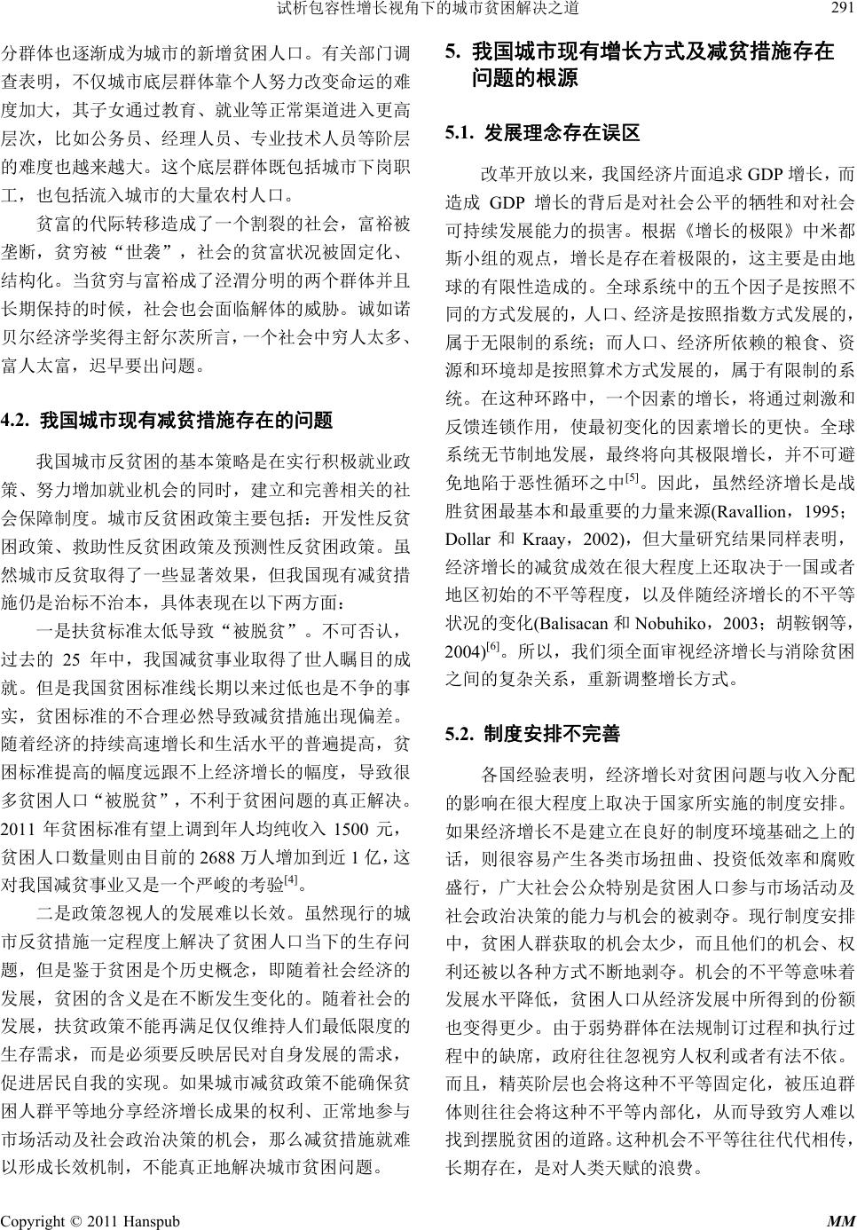 ![]() Modern Management 现代管理, 2011, 1, 287-293 http://dx.doi.org/10.12677/mm.2011.14052 Published Online October 2011 (http://www.hanspub.org/journal/mm) Copyright © 2011 Hanspub MM Solutions to Urban Poverty from the Perspective of the Inclusive Growth Congcong Pan1, Beilei Yang2 School of Economics and Management, Tongji University, Shanghai Email: xiaocong929@126. com; yblei@vip.163.com Received: Aug. 25th, 2011; revised: Sep. 10th, 2011; accepted: Sep. 15th, 2011. Abstract: Along with the rapid economic development, urban poverty is the outcome of the market economy. Moreover, it is also a social issue that needs a long-term concern and governance. Based on the inclusive growth theory, th is paper gives a detailed description of the size and composition of the urban poor, as well as the close analysis for the root of the issue. It also puts forward a series of urban poverty solutions, like the sustainable economic development, equal-opportunity institution building, and welfare-sharing security system and so on. Keywords: Urban Poverty; Inclusive Growth; Sustainable Development; Equal Opportunity; Welfare-Sharing 试析包容性增长视角下的城市贫困解决之道 潘聪聪 1,杨蓓蕾 2 同济大学经济与管理学院,上海 Email: xiaocong929@126. com; yblei@vip.163.com 收稿日期:2011 年8月25日;修回日期:2011 年9月10 日;录用日期:2011 年9月15 日 摘 要:伴随着市场经济的高速发展而来的城市贫困,是一个需要长期关注与治理的社会问题。本文基 于包容性增长的视角,首先分析了我国城市贫困人口的规模、构成和城市贫困的成因,然后在分析我国 城市现有增长方式与减贫措施存在的问题及根源的基础上,提出了实施可持续的经济发展模式、推行机 会平等的制度建设、构建福利普惠的保障体系等一系列城市贫困问题的解决之道。 关键词:城市贫困;包容性增长;可持续;机会平等;福利普惠 1. 引言 联合国已将贫困问题确定为社会发展问题的三大 主题之首,并自 1993 年起把每年 10 月17 日定为国际 灭贫日,用以唤起全世界对贫困群体的关注与援助。 新中国成立以来,我国主要针对农村进行“扶贫开发”, 我国农村贫困人口数量大幅下降。但到 20 世纪 90年 代中后期,随着国企改革和产业结构调整,我国城市 贫困问题日趋恶化。同时,大量农村剩余劳动力向城 市转移,城市贫困人群不断增加,如何解决日益突显 的城市贫困问题是困扰政府和社会各界的一大难题。 2007 年亚行提出“包容性增长”,随着胡锦涛主 席两次在亚太经合组织会议对包容性增长的强调,立 足于包容性增长探索城市贫困问题的解决之道进入研 究者的视野。 对于包容性增长的内涵,学界主要有四种理解。 一是认为包容性增长(“共享式增长”或“普惠式增长”) 是机会平等的增长,主要通过消除由个人背景或所处 环境的不同所造成的机会不平等,从而缩小结果不平 等(林毅夫,2007;杜志雄,2010)。二是把包容性发 展与就业联系起来,认为应该实现穷人的充分就业, 并使工资增长速度高于资本报酬增长速度,从而缩小 贫富差距(Felipe,2007)。三是认为包容性增长就是“参 与”和“共享”,只有在所有民众都能够“参与”和 “共享”时,经济增长才具有积极意义(唐钧,2010)。 四是认为包容性增长是益贫式增长,即包容性发展应 ![]() 试析包容性增长视角下的城市贫困解决之道 288 使低收入群体从经济增长中分享收益,使他们过上有 尊严的生活(Besley等,2007)。 综合上述学者的观点,本文所界定的包容性增长 的内涵为倡导机会平等的增长,增长成果由不同群体 公平合理地分享。它包括三个基本要义,即:1) 可持 续的经济发展;2) 平等地获 取社会权利; 3) 福利普 惠。 本文从我国目前城市贫困的现实出发,基于包容 性增长视角探索解决我国城市贫困问题之道。 2. 城市贫困的界定 2.1. 贫困及城市贫困的含义 学术界对贫困的界定不计其数。一般以贫困的发 生是否限定在经济领域,分为狭义的贫困与广义的贫 困。狭义的贫困主要限定在经济领域,包括以收入认 定的贫困、以消费认定的贫困、以财产认定的贫困; 广义的贫困视角包括心理感受论、可行能力论与社会 排斥论。 本文的贫困限定为经济贫困,特指反映人对资源 的占有和利用受限制导致生活水平低下的状况。“资 源”包括自然资源和经济资源;“占有和利用受限制” 是指财产权、生存权、享受服务的权利得不到有效行 使。从经济贫困的角度出发,以收入水平作为衡量贫 困的标准。 2.2. 城市贫困的表现 我国的城市贫困是“绝对贫困”与“相对贫困” 的统一。绝对贫困也称为生存贫困,随着家庭所得上 升,绝对贫困可以不复存在。而相对贫困的概念则认 为贫困相对于不同历史阶段、相对于不同地区、相对 于不同人群,有含义上的不同,且贫困标准也不断变 化。 无论哪种类型的贫困,其实质都是个人或家庭的 经济收入不能达到所在社会“可接受生活标准”的状 况(周彬彬,1991)。在我国城市,由于“绝对贫困” 与“相对贫困”界限难以明确,且相对贫困者生活稍 有波折就会坠入绝对贫困群体,因此,我国城市贫困 以“相对贫困”为主,也存在一定程度的“绝对贫困”。 2.3. 城市贫困的标准 国际上一般采用贫困线来衡量贫困程度以界定贫 困群体。贫困标准与各国各地的具体情况相关。一般 指在特定时间、特定社会中的一个最低的、“可接受 的”经济参与水平。国际上通用的衡量贫困的标准有 国际贫困标准、世界银行
