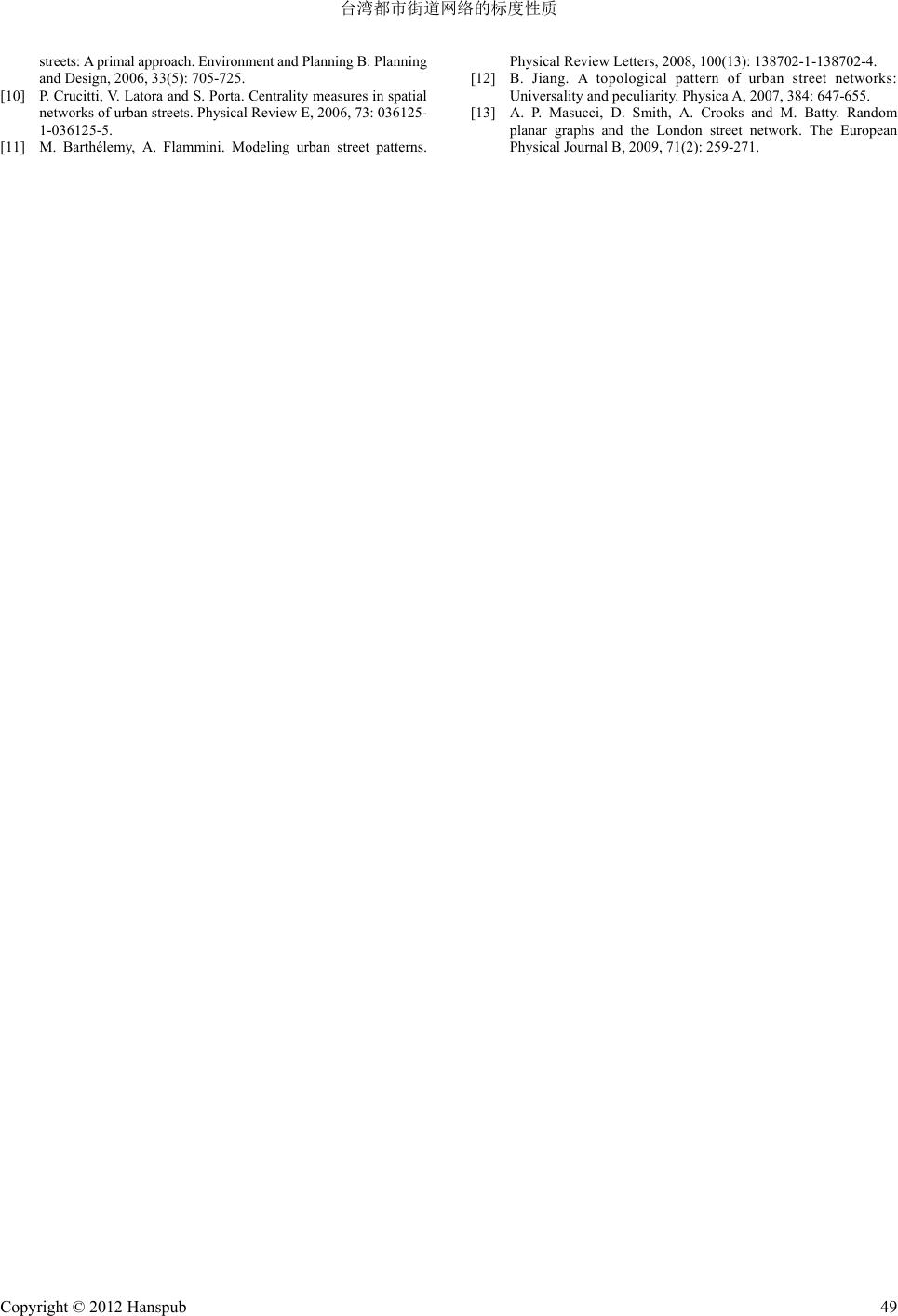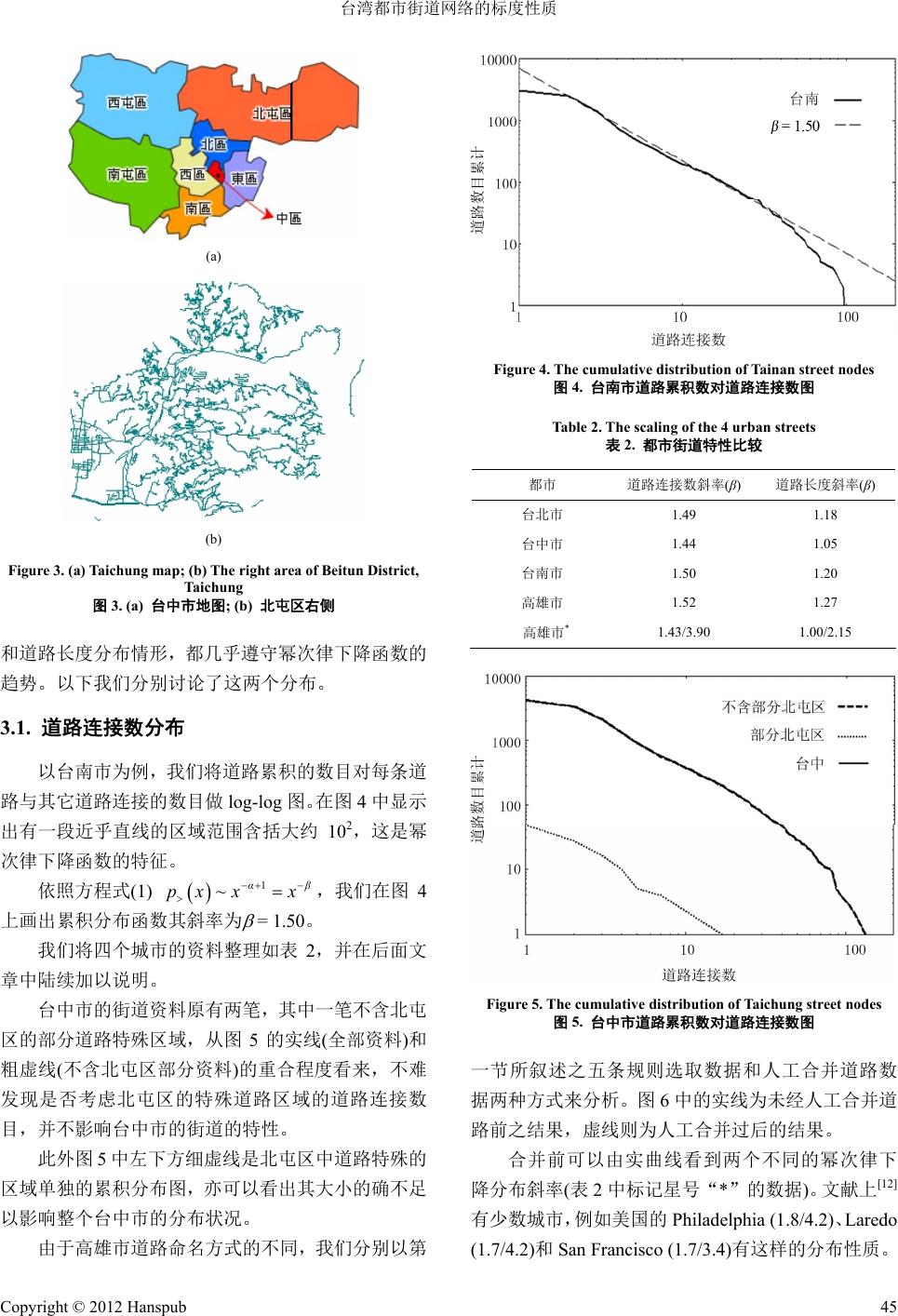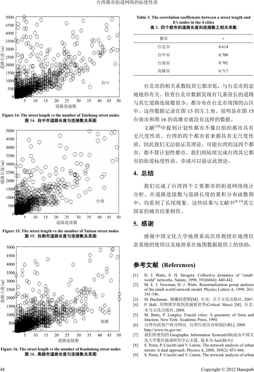 ![]() Applied Physics 应用物理, 2012, 2, 41-49 http://dx.doi.org/10.12677/app.2012.22007 Published Online April 2012 (http://www.hanspub.org/journal/app) Scaling Behaviors of the Urban Street Networks in Taiwan Yu-Ling Chiang*, Chung-I Chou, Yu-Xiang Chen Department of Physics, Chinese Culture University, Taipei Email: *yuling@faculty.pccu.edu.tw Received: Jan. 9th, 2012; revised: Jan. 23rd, 2012; accepted: Feb. 1st, 2012 Abstract: We studied the scaling behaviors of the urban street networks in Taiwan. We established the primal and dual graphs of networks from several sample cities (Taipei, Taichung, Tainan, Kaohsiung), and analyzed their statistical properties such as degree distributions and street length distributions. The results show, the cumulative distribution functions (CDF) of connectivity and length of road are both following the approximate power law. Keywords: Street Networks; Small World; Scaling; Taiwan 台湾都市街道网络的标度性质 蒋幼龄*,邹忠毅,陈钰翔 中国文化大学物理系,台北 Email: *yuling@faculty.pccu.edu.tw 收稿日期:2012 年1月9日;修回日期:2012 年1月23 日;录用日期:2012 年2月1日 摘 要:我们研究了台湾都市街道网络的标度性质。建立了数个都市(台北市、台中市、台南市和高雄市)的基本 与二重网络图;分析它们的各种统计性质(例如度分布、度关联性、特征长度、整体与局部特征等等)。结果显示, 各城市道路长度和连接数的累积分布函数都大致遵守幂次律下降的函数形式。 关键词:街道网络;小世界;标度性质;台湾 1. 引言 本文由社会物理学的方法入手,透过种种形式的 网络,系统中的小单元得以和其它单元作用,产生整 体性质来研究台湾都市街道网络的标度性质。在最近 十几年,科学家们发现了与人类生活密切相关的一种 网络型态,它们被称为小世界网络(small world network)。小世界网络主要有几个特色[1,2]:1) 两点间 的最小连接次数少;2) 具有集散(hub)点结构。在某 些情况下,如果分析小世界网络的各结点上的连结 度,常符合幂次律分布(power-law distribution)关系, 而此网络的性质往往与尺度无关,于是这种网络被称 为无尺度网络(scale-free network)。小世界网络与无尺 度网络可以在许多现象中发现,例如意见传播、特殊 事件(地震、森林火灾、战争等等)的发生频率、交通 网络、因特网等等。 社会物理学(sociophysics)指的是利用物理学的研 究方法以进行社会科学问题的研究[3,4]。研究者们延续 了第谷(Tycho Brahe)、克普勒(Johannes Kepler)、牛顿 (Isaac Newton)以来,由经过观察现象、搜集数据、寻 找规律、建立理论、解释及预测现象等过程的一套研 究传统,对社会经济问题做了一些工作。这些研究者 面对的是复杂的社会现象,使用统计物理方法与计算 机仿真工具,由简单的模型与交互作用出发,却往往 得到与真实现象相符的结果。 一般说来,社会物理学的研究大约分为三个阶 段。一是数据收集,二是分析数据并找出规律,最后 *通讯作者。 Copyright © 2012 Hanspub 41 ![]() 台湾都市街道网络的标度性质 是由基本模型推演出规律。分述如下: 数据来源可分为几方面,一是来自现有的数据 库:例如政府的统计资料,人口、选举、国富统计等。 又如经济活动纪录,股票、期货等交易讯息。另外还 有其它数据库,如消费者网站、民意或问卷调查。二 是基于现有技术的实际测量量:如自行设计交通流量 的实际观测、自行举行的调查与问卷。三是跨领域合 作,利用新技术及新想法,设计新的实验与测量:例 如与医学工程、社会心理学的研究人员合作。 在分析数据时通常采用的方向,一是利用传统统 计学方法,找出分布情况、各种统计量值、及进行关 联性分析。二是近年来越来越受重视的关联网络分 析,找出关联网络的特征、连接性质与关联性。在分 析结果中,有两个特征特别受到重视,即统计性质中 的长尾现象(特别是幂次律下降分布)与无尺度网络的 出现。这两个特征往往伴随着相变现象,此时系统常 常处于某种有序与无序的临界点上,只要某些控制因 子变化,系统即可能发生巨变。 最后是由基本模型推演出规律。这是物理学者的 强项,也是社会物理研究的重点。由建立简化的微观 基本模型,推导出宏观的整体现象,透过比对理论与 实际的结果,推论现象发生的原因。在此阶段研究者 常常将社会群体分为大量的基本单元,藉由研究单元 之间的交互作用形式及网络,配合数学计算与计算机 仿真,往往可以得到与真实世界相符的整体性质。 本文中我们利用统计物理方法研究了台湾的四 个都市街道网络的标度性质,包括台北市及改制 1前 的台中市、台南市和高雄市(由北至南见图 1)。目 前 尚 无台湾都市在此方面的相关研究,而选择此四个都市 是因为它们的人口密度较高。 文献中[5]在不同型态城市的街道展现了小世界网 络与无尺度网络的型态。台湾这四个都市的面积大 小、人口密度[6](见表1)、规划和演进不尽相同,我们 希望能在统计分析的帮助下,看出不同都市的街道特 征。此研究除了可充实社会物理学现有的领域和基础 外,更可藉由数据的分析掌握城市发展与地理和人文 社会之间的关联。 Figure 1. Map of Taiwan, the marks are the cities from north to south: Taipei, Taichung, Ta inan, and Kaohsiung 图1. 台湾地图,特别标示之都市由北至南为台北市、台中市、台 南市和高雄市 Table 1. The areas and population densities of the 4 cities 表1. 都市面积与人口密度 都市 面积(km2) 人口密度(人/km2) 台