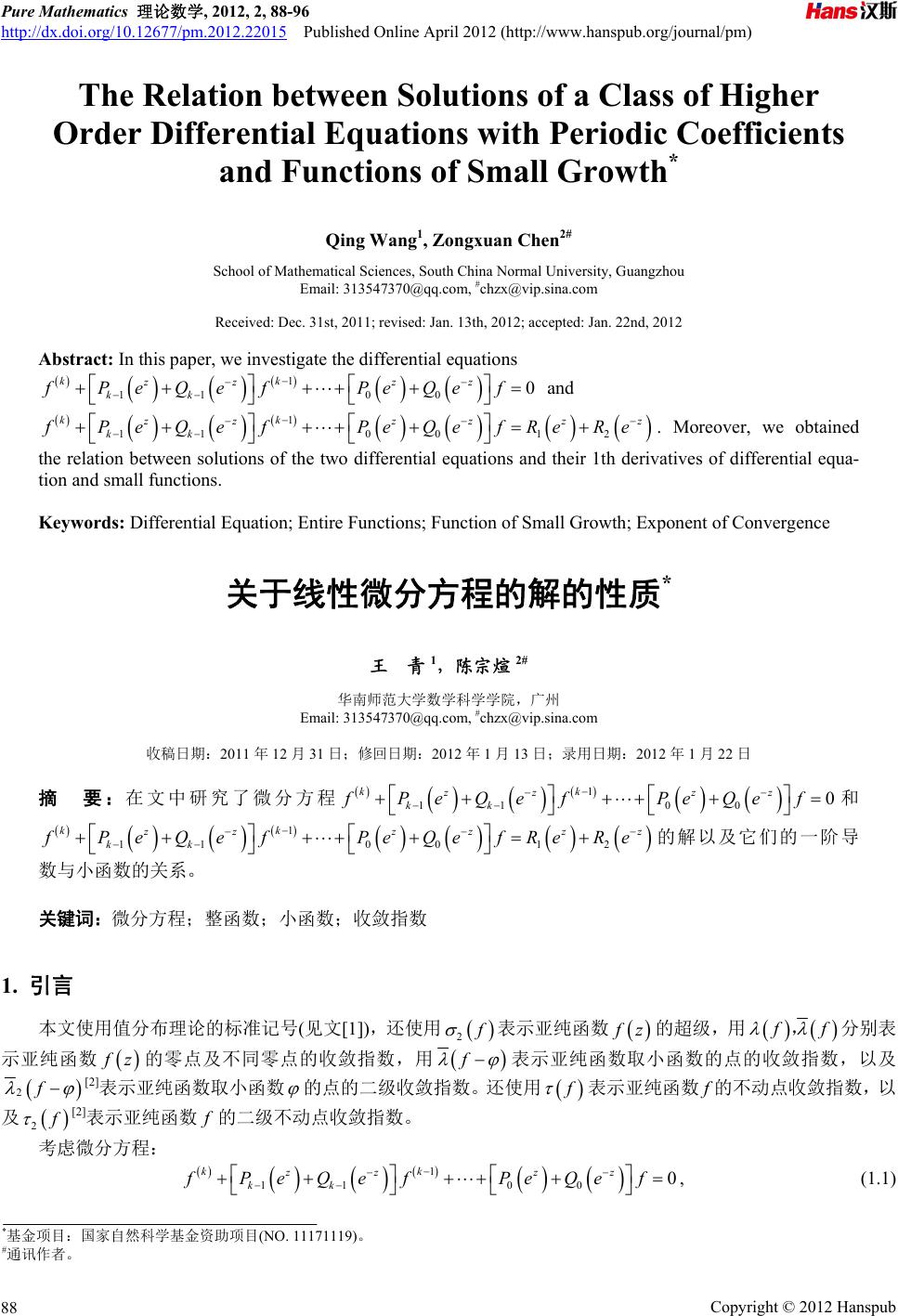 Pure Mathematics 理论数学, 2012, 2, 88-96