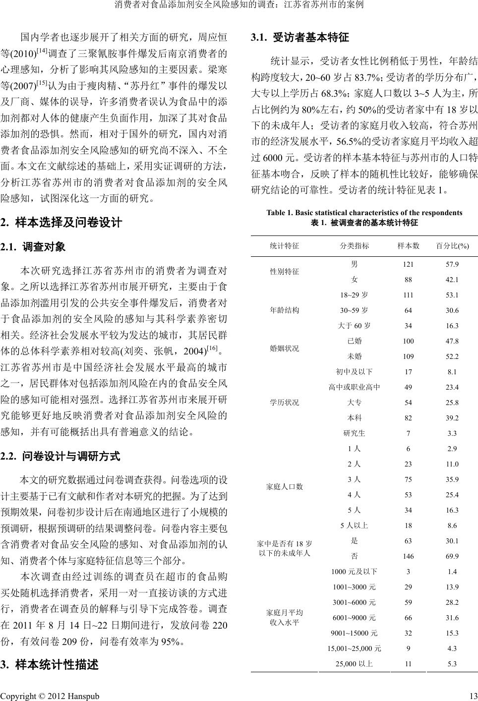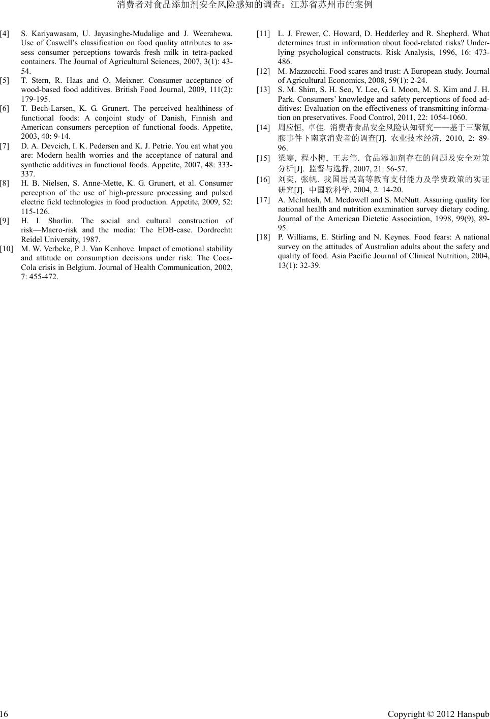 ![]() Hans Journal of Food and Nutrition Science 食品与营养科学, 2012, 1, 11-16 http://dx.doi.org/10.12677/hjfns.2012.13003 Published Online August 2012 (http://www.hanspub.org/journal/hjfns.html) The Survey on Consumer’s Risk Perception of Food Additive: The Case of Suzhou City, Jiangsu Province* Yingqi Zhong1, Lijie Shan1,2, Linhai Wu 1,2 1School of Business, Jiangnan University, Wuxi 2Jiangsu Province Research Base of Food Safety, Jiangnan University, Wuxi Email: zhongyingqi2011@163.com, wlh6799@vip.163.com Received: Aug. 2nd, 2012; revised: Aug. 17th, 2012; accepted: Aug. 23rd, 2012 Abstract: This paper researches consumers’ risk perception of food additive based on 209 data collected fro m Suzhou, Jiangsu Province. The conclusion indicates that media reports, the views of relatives and friends, corporate brand repu- tation as well as the governments’ policies on additives are the main factors affect consumers’ purchase intention of food containing additives. Therefore, the core for the government to formulate and implement the food safety risk management policy is to establish a risk communication mechanism effectively, release government regulatory infor- mation timely, reduce media misinformation vigorously and promote public science literacy fruitfully. All of these will help to improve consu mer perception of food ad ditive safety risk and enhance consu mer ’s confidence in the foo d mar- ket. Keywords: Consumer; Food Addictive; Security Risk Perception; Suzhou City, Jiangsu Province 消费者对食品添加剂安全风险感知的调查: 江苏省苏州市的案例* 钟颖琦 1,山丽杰 1,2,吴林海 1,2 1江南大学商学院,无锡 2江南大学江苏省食品安全研究基地,无锡 Email: zhongyingqi2011@163.com, wlh6799@vip.163.com 收稿日期:2012 年8月3日;修回日期:2012 年8月17 日;录用日期:2012 年8月23 日 摘 要:本文以江苏省苏州市 209 名消费者为对象,调查消费者对食品添加剂安全风险感知。研究结论显示, 媒体报道、亲戚朋友的看法、企业的品牌信誉以及政府关于添加剂的相关政策是影响消费者对含有添加剂食品 购买意愿的主要因素;建立有效的食品安全风险的交流机制,科学地传播信息,最大程度地遏制媒体对消费者 的误导;及时发布政府监管的信息以及政府所展开的相关努力;强化科普教育,提升公众的科学素养等,都有 助于改善消费者对食品添加剂安全风险的感知,提升消费者对食品市场的信心。 关键词:消费者;食品添加剂;安全风险感知;江苏省苏州市 1. 引言 食品添加剂是指为改善食品品质和色、香、味, 以及为防腐和加工工艺的需要而加入食品中的化学 合成或者天然物质,食品添加剂的使用繁荣了食品市 场,满足了人们对食品的新需求,因而被誉为“现代 食品工业的灵魂”。但是食品添加剂多属于化学合成 物质,具有一定的毒性,如果使用不当或者过量使用 *基金项目:国家自然科学基金项目(批准号:71073069)、教育部人 文社会科学一般项目(11YJC630172)、江苏省高校社科重大项目 (2011ZDAXM018)。 Copyright © 2012 Hanspub 11 ![]() 消费者对食品添加剂安全风险感知的调查:江苏省苏州市的案例 可能引发食品安全风险(Stern et al.,2009)[1]。现阶段 由于非常复杂的原因,在我国人为滥用食品添加剂(滥 用食品添加剂是指超限量、超范围使用食品添加剂以 及使用伪劣、过期的食品添加剂)引发的食品安全事件 持续不断,已成为食品安全事件的主体和消费者最担 心的食品安全风险。三鹿事件、双汇瘦肉精事件、染 色馒头事件等,就是近年来发生的典型食品安全事 件,不仅对我国食品工业造成了极大的损失,使食品 生产行业遭遇巨大的信任危机,更严重影响了消费者 对我国食品安全的信心。因此,以对江苏省苏州市的 消费者的调查为案例,分析消费者对食品添加剂安全 风险的感知,探讨消费者在添加剂食品安全事件爆发 后的行为,对构建食品安全风险交流机制,化解食品 安全的社会风险具有重要的作用。 食品添加剂的使用是工业现代化的需要,其在食 品的加工、贮存、保鲜、保质等方面有很大的贡献, 然而由于消费者对食品添加剂的信息知之甚少,滥用 添加剂的食品安全事件爆发后,消费者对食品质量与 安全的信心急剧下降,甚至可能造成不必要的恐慌。 正由于此,食品添加剂的安全风险与消费者感知成为 近10 年来国际上普遍研究的新热点。例如,Williams et al.(2004)[2]澳大利亚消费者的调查发现,添加剂和化 学物质被认为是影响食品安全最常见的潜在危害。国 外学者的研究主要集中于以下几个方面: 消费者个体特征的差异性影响其对食品添加剂 安全风险的感知。人们对食品安全风险的感知存在着 明显的个体差异性。Thesis(2003)[3]研究消费者对鲜切 水果蔬菜使用可食用的保护膜(一种储藏类添加剂)的 态度时发现,年轻的消费者对鲜切水果蔬菜可食用保 护膜的风险感知敏感,并且女性消费者更倾向于使用 可食用的保护膜。Kariyawasam(2007)[4]在调查消费者 对具有不同安全信息属性的鲜牛奶的接受程度时也 发现,年轻、高收入和受教育程度高的女性消费者更 倾向于购买添加剂含量低的牛奶。可见个体特征的差 异性影响其对食品添加剂安全风险的感知,进而改变 消费者的行为。 消费者的态度与食品添加剂安全风险的感知。消 费者对食品添加剂安全状况的认知与评价与其掌握 的食品添加剂的知识有关,Tobias Stern et al.(2009)[5] 对澳大利亚 263 位消费者进行了木头中提取的添加剂 的调查,结果表明,对木头源食品添加剂的知识和