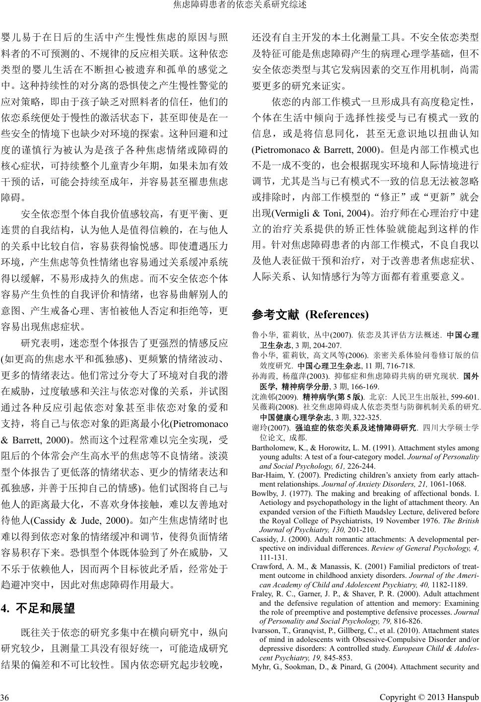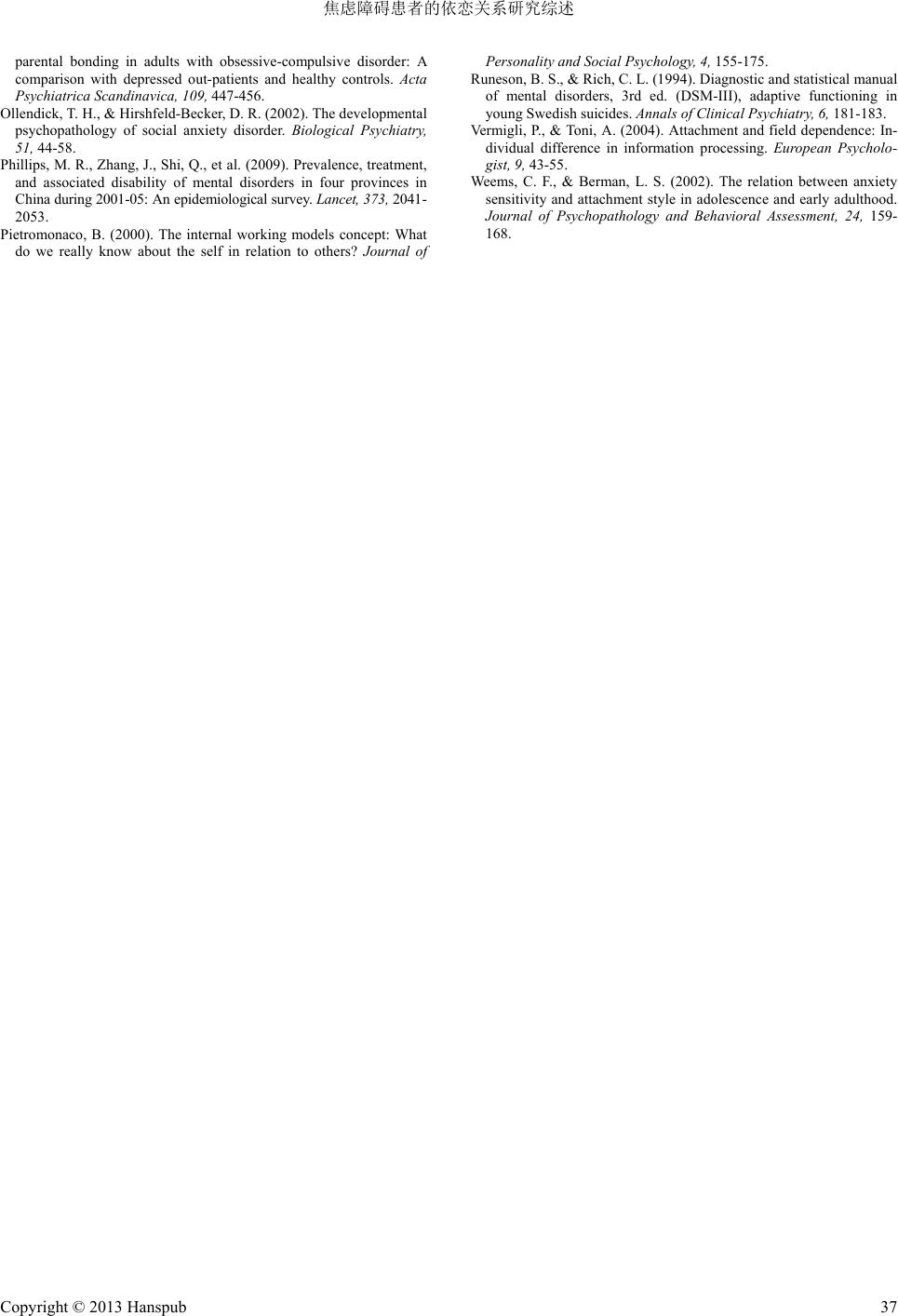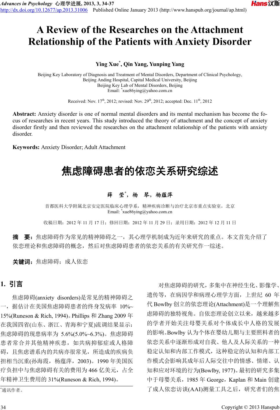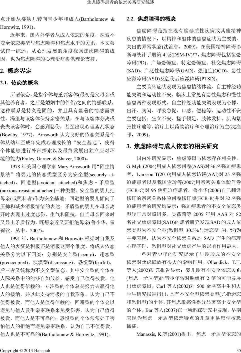 ![]() Advances in Psychology 心理学进展, 2013, 3, 34-37 http://dx.doi.org/10.12677/ap.2013.31006 Published Online January 2013 (http://www.hanspub.org/journal/ap.html) A Review of the Researches on the Attachment Relationship of the Patients with Anxiety Disorder Ying Xue*, Qin Ya ng, Yu nping Ya ng Beijing Key Laboratory of Diagnosis and Treatment of Mental Disorders, Departme nt of Clinical Psychology, Beijing Anding Hospital, Capital Medical Univer si ty, B eijing Beijing Key Lab of Mental Disorders, Beijing Email: *xue86ying@yahoo.com.cn Received: Nov. 17th, 2012; revised: Nov. 29th, 2012; accepted: Dec. 11th, 2012 Abstract: A nxiety disorder is one of normal mental disorders and its mental mechanism has become the fo- cus of researches in recent years. This study introduced the theory of attachment and the concept of anxiety disorder firstly and then reviewed the researches on the attachment relationship of the patients with anxiety disorder. Keywords: Anxiety Disorder; Adult Attachment 焦虑障碍患者的依恋关系研究综述 薛 莹*,杨 琴,杨蕴萍 首都医科大学附属北京安定医院临床心理学系,精神疾病诊断与治疗北京市重点实验室,北京 Email: *xue86ying@yahoo.com.cn 收稿日期:2012 年11 月17 日;修回日期:2012 年11 月29 日;录用日期:2012 年12 月11 日 摘 要:焦虑障碍作为常见的精神障碍之一,其心理学机制成为近年来研究的重点。本文首先介绍了 依恋理论和焦虑障碍的概念,然后对焦虑障碍患者的依恋关系的有关研究作一综述。 关键词:焦虑障碍;成人依恋 1. 引言 焦虑障碍(anxiety disorders)是常见的精神障碍之 一,据估计在美国焦虑障碍患者的终身发病率 10%~ 15%(Runeson & Rich, 1994)。Phillips 和Zhang 2009年 在我国四省(山东、浙江、青海和宁夏)流调结果显示: 焦虑障碍的现患病率为 5.6%(5.0%~6.3%)。焦虑障碍 患者常合并其他精神疾患,如共病抑郁症或人格障 碍,且焦虑谱系内的共病亦很常见,所造成的疾病负 担相当沉重(孙海霞,杨蕴萍,2003)。1990 年美国医 疗负担中与焦虑障碍有关的费用为 466亿美元,占全 年精神卫生费用的 31%(Runeson & Rich, 1994)。 对焦虑障碍的研究,多集中在神经生化、影像学、 遗传等,在病因学和病理心理学方面,上世纪 60 年 代Bowlby 创立的依恋理论(Attachment)是一个理解焦 虑障碍的独特视角。自依恋理论创立以来,越来越多 的学者开始关注母婴关系对个体成长中人格的发展 的影响。Bowlby 认为个体在婴幼儿期与主要照料者的 依恋关系中逐渐形成对自我、他人及人际关系的一种 稳定认知和内部工作模式,这种稳定的认知和内部工 作模式会影响其成年后人际交往中的情感、情绪、认 知和应对环境的行为(Bowlby, 1977)。最初的研究多集 中于母婴关系,1985 年George,Kaplan 和Main 创建 了成人依恋访谈(AAI)测量工具之后,研究者们的焦 *通讯作者。 Copyright © 2013 Hanspub 34 ![]() 焦虑障碍患者的依恋关系研究综述 点开始从婴幼儿转向青少年和成人(Bartholomew & Horowitz, 1991)。 近年来,国内外学者从成人依恋的角度,探索不 安全依恋类型与焦虑障碍和焦虑水平的关系,本文尝 试作一综述,从心理发展的角度探索焦虑障碍的成 因,也为焦虑障碍的心理治疗提供理论支持。 2. 概念界定 2.1. 依恋的概念 所谓依恋,是指个体与重要客体(最初是父母亲或 其他养育者,之后是婚姻中的伴侣)之间的情感联系, 这种联系是持久稳固的,并且具有显著的情感需求 性,渴望与该客体保持亲密关系,在与该客体分离或 丧失该客体时,会感到悲伤,甚至出现心理紊乱状态 (Bowlby, 1977)。Ainsworth认为良好的依恋关系是个 体从幼年至成年完成心理成长的“安全基地”,使得 个体能够进行外部探索以及最终发展出独立应对环 境的能力(Fraley, Ga rner, & Shaver, 2000)。 1978 年美国心理学家 Mary Ainsworth用“陌生情 景法”将婴儿的依恋类型区分为安全型(securely at- tached)、回避型(avoidant attached)和焦虑–矛盾型 (anxious-resistant attached)三种类型。安全型的婴儿把 母亲(或照料者)作为安全基地;回避型的婴儿倾向于 压抑和减少消极情绪的表达;矛盾型的婴儿在母亲离 开时表现出过度悲伤、生气和阻抗,但当母亲回来时 又显出矛盾行为,既想亲近又要拒绝母亲(鲁小华,霍 莉钦,丛中,2007)。 1991 年,Bartholomew 和Horowitz 根据对自我及 他人的表征是积极还是消极这两个维度,将成人依恋 关系分为以下四类:分别是安全型(secure)、迷恋型 (preoccupied)、淡漠型(dismissing)、恐惧型(fearful), 后三者又统称为不安全型依恋。其中安全型的个体在 人际关系中的能够自如放松,感受自己值得被爱,他 人也是值得信赖的;专注型的个体总是努力去赢得他 人的接纳,并以此支持消极的自我形象,认为自己不 值得被爱,而他人是值得信赖的;回避型的个体会以 避免与他人发生亲密联系来免受伤害,认为自己值得 被爱,而他人是不可靠的;恐惧型的个体常常处于害 怕他人的拒绝而避免亲密联系,认为自己不值得爱, 他人也是不可靠的(Bartholomew & Horowitz, 1991)。 2.2. 焦虑障碍的概念 焦虑障碍是指在没有脑器质性疾病或其他精神 疾患的情况下,以精神和躯体的焦虑症状为主要的、 突出的异常状态(沈渔邨,2009)。在美国精神障碍诊 断与统计手册第 4版(DSM-IV)中,焦虑障碍包括惊恐 障碍(PD)、广场恐怖症、特定恐怖症、社交焦虑障碍 (SAD)、广泛性焦虑障碍(GAD)、强 迫 症 (OCD)、急 性 应激障碍(ASD)及创伤后应激障碍(PTSD)。 主要临床症状表现为焦虑情绪体验、自主神经功 能失调和运动性