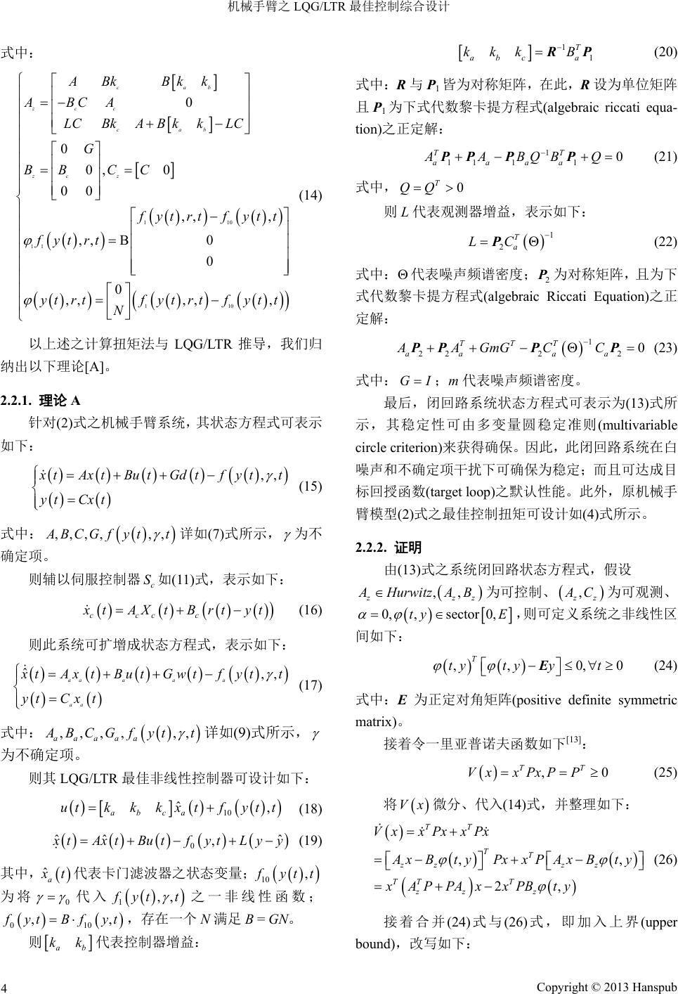 ![]() Dynamical Systems and Control 动力系统与控制, 2013, 2, 1-10 http://dx.doi.org/10.12677/dsc.2013.21001 Published Online January 2013 (http://www.hanspub.org/journal/dsc.html) The LQG/LTR Design Procedure for Nonlinear Robot Manipulators Chijui Chung, Chengneng Hwang Department of Systems and Naval Mechatronic Engineering, National Cheng Kung University, Tainan Email: rayinncku@hotmail.com Received: Nov. 7th, 2012; revised: Dec. 2nd, 2012; accepted: Dec. 10th, 2012 Abstract: In this thesis, the multivariable robust control of nonlinear manipulator systems is based on the compute torque method and the LQG/LTR design procedure was proposed. This controller is able to handle the system that have modeling errors and external disturbances while it keeps the close-loop system robustness and satisfied the prescribed performance. In this research, the computed toque method is applied to design the proposed control law to form the main control structure by using the benefit of its feedback linearization strategy. The error dynamics of the plant is then formulated to the standard H2/H∞ control problem, which is easy to be applied by the LQG/LTR design procedure to find the optimal control gain and observer gains in the process of matching the target loop. With regard to the non-can- celing nonlinear terms, the closed-loop system is formulated to the Lu’re-type problem form with sector-bounded uncer- tainties, which is then analyzed by the Multivariable Circle Criterion to discuss the stability and robustness. To verify the feasibility of proposed controller, one example with various external disturbances and parameter uncertainties is made and its computer simulation result shows the efficiency and feasibility of the proposed design methodology. Keywords: Compute Torque Method; LQG/LTR Theory; Multivariable Circle Criterion 机械手臂之 LQG/LTR 最佳控制综合设计 钟启瑞,黄正能 国立成功大学系统及船舶机电工程学系,台南 Email: rayinncku@hotmail.com 收稿日期:2012 年11月7日;修回日期:2012 年12 月2日;录用日期:2012年12月10日 摘 要:本研究综合计算扭矩法与 LQG/LTR 对非线性机械手臂系统进行多变量强健控制设计,解决存在于系统 内部的不确定性与受到随机干扰情况下的非线性机械手臂系统之控制设计问题,使得非线性机械手臂控制系统 具有良好的强健性与满足性能要求。文中首先使用计算扭矩法对非机械手臂系统中各项的估计值进行控制律的 设计与回授线性化,并使用变异渐进法对回授系统进行适当的加权扩增;接着使用 LQG/LTR设计,使得输出回 授控制器(output feedback controller)能够趋近于预先设计的目标回授回路(target feedback loop)。至于非线性机械 手臂闭回路系统在形成 Lu’re-type 问题后,可讨论非线性项之稳定性容许在一定的上界与下界,根据多变量圆 稳定准则理论(multivariable circle criterion)探索此控制器之强健性能。文末则以非线性机械手臂系统为范例,进 行计算机仿真,验证控制器的有效性与可行性。 关键词:计算扭矩法;LQG/LTR 理论;多变量圆稳定准则 1. 引言 迄今,控制理论发展至少经历了四个阶段。第一 阶段,1932 年Nyquist 运用复变函数理论建立了根据 频率响应判断单输入–单输出回授系统稳定性的准 Copyright © 2013 Hanspub 1 ![]() 机械手臂之 LQG/LTR 最佳控制综合设计 则[1],而在30 年代末期 Bode与Nichols 进一步将频 域响应法加以推广[2],使之更臻成熟。1948年Evans 提出名为根轨迹(root locus)的分析法[3],研究系统参数 对回授系统稳定性和动态特性的影响,系统极/零点的 重要性亦因之具体呈现。前述方法形成了古典控制理 论的核心,其中增益(gain)与相位(phase)界限被广泛的 用来度量稳定强健性,藉其反映控制设计之良窳。虽 然这些方法并未明显的将模型不确定等因素纳入问 题内,但我们却可由稳定准则中,估计出系统所能容 许的整体开回路增益与相位变动范围,这也算是间接 的反映了系统的强健稳定性。至于早期 Wiener 利用频 域响应法探讨最佳控制与滤波理论所得到的结果并 未具备强健性[4]。该法的重点是使信号变异量极小化, 而非使某些决定强健性(稳定性或性能)之性能准则 (performance measure)极小化。应用该理论并无法确定 闭回路系统稳定性,亦即,控制器和受控系统间可能 出现极、零点对消(pole-zero cancellation),导致闭回 路不稳定。 第二阶段,1960 年Kalman 等人引入状态空间法 (state-space method)探讨最佳控制与滤波理论[5],但 在 本阶段受控系统模式皆假设已知。至于最佳状态回授 之线性二次调节器(linear quadratic regulator, LQR)本 身即具有优异的既存强健性[6]。亦即,至少 60 度的相 位界限与正无穷大的增益界限,1977年才由Safonov 与Athans 发现。但对于采输出回授之控制系统则无法 获致类似的理论。 大约 1970 年开始的第三阶段,控制理论发展又 转回频域设计法,但学者们将其推广至多变量系统的 控制器设计。这段时期,理论发展系由 Rosenbrock 与 MacFarlane 等人主导。虽然Rosenbrock 曾提倡高度整 合性设计,以便克服回路增益变化对稳定性的影响[7], 但这些方法并未对系统含有不确定项,该如何改进强 健性正式的提出对策。 简而言之,前三阶段,控制理论发展并未正式的 将系统既存扰动因素纳入问题中,并且特别针对这些 问题提出答案。至于某些设计所能提供的强健特性, 也只是后人偶然发觉这些方法亦可提供一些附加效 益罢了。虽然早在 1945 年,Bode 在其著作中就曾提 及负回授可降低参数变动灵敏度,1964 年Cruz 与 Perkins 亦曾提出适用于多变量系统的灵敏度函数 (sensitivi