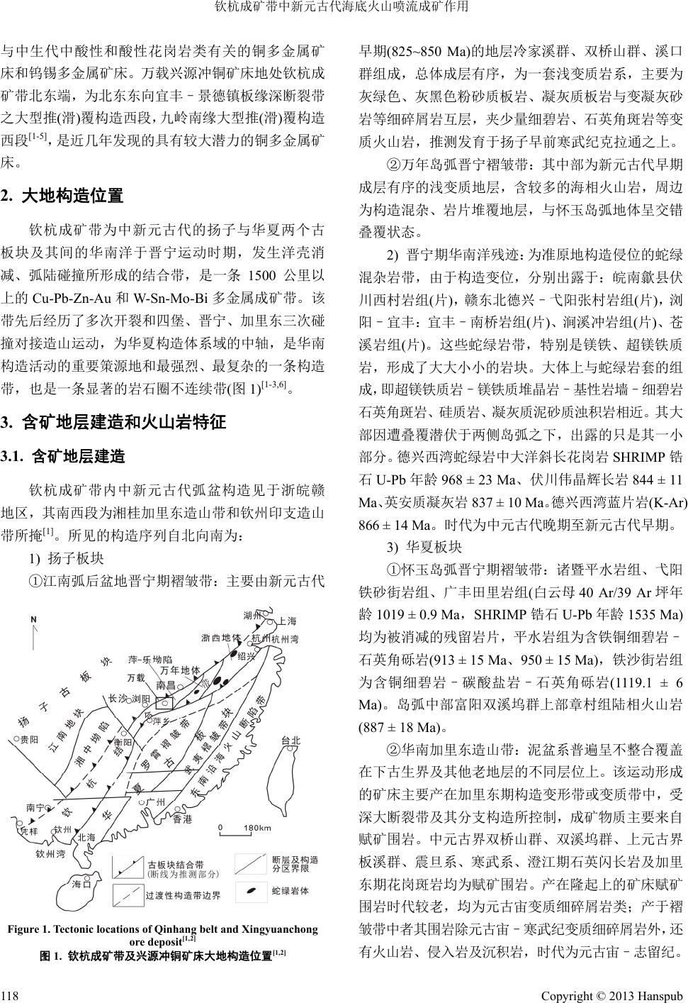 ![]() Advances in Geosciences 地球科学前沿, 2013, 3, 117-121 http://dx.doi.org/10.12677/ag.2013.32017 Published Online April 2013 (http://www.hanspub.org/journal/ag.html) Meso-Proterozoic Marine Exhalative Mineralization in Qinhang Belt —An Example from Xingyuanchong Copper Deposit in Wanzai, Jiangxi Ting Liu, Chengdong Liu*, Zhaobin Yan, Yiping Chen State Key Laboratory Breeding Base of Nuclear Resources and Environment, East China Institute of Technology, Nanchang Email: verating77@163.com, *chdliu@ecit.cn Received: Jan. 21st, 2013; revised: Feb. 13th, 2013; accepted: Mar. 2nd, 2013 Copyright © 2013 Ting Liu et al. This is an open access article distributed under the Creative Commons Attribution License, which permits unre- stricted use, distribution, and reproduction in any medium, provided the original work is properly cited. Abstract: The Qinhang belt is located along the Qinhang Neoproterozoic suture in South China, which separates the Yangtze craton and Cathaysian Blocks. Deposits along the belt can be divided into two episodes, i.e. Neoproterozoic marine exhalative Cu-Zn deposits, and Yanshanian granitoids related W-Sn-Cu-Pb-Zn deposits. Xingyuanchong copper deposit in its northeast belongs to the former series, is a Mesoproterozoic marine exhalative meta-sedimentary copper deposit, closely related with metamorphic spilite and quartz porphyry in Yifengyan Formation in Jixianian, controlled by late ductile shear zones, and superimposed mineralized after metamorphosed hydrothermal fluids processes. Keywords: Qinhang Belt; Meso-Proterozoic; Marine Exhalative Sedimentary Mineralization; Xingyuanchong 钦杭成矿带中新元古代海底火山喷流成矿作用 —以江西万载兴源冲铜矿床为例 刘 婷,刘成东*,严兆彬,陈益平 东华理工大学省部共建核资源与环境国家重点实验室培育基地,南昌 Email: verating77@163.com, *chdliu@ecit.cn 收稿日期:2013 年1月21 日;修回日期:2013年2月13日;录用日期:2013年3月2日 摘 要:钦杭成矿带位于华南板内,属扬子与华夏两个古陆块在晚元古代碰撞拼接带。该带及旁侧矿床按成矿 系列可归纳为新元古代海底喷流沉积型铜锌矿床成矿系列和燕山期与花岗岩有关的钨锡铜铅锌多金属矿床成矿 系列。该带北东端的兴源冲铜矿床为中元古代海底喷流沉积变质叠改型铜矿床,其矿化与中元古界蓟县系宜丰 岩组变细碧岩、变角斑岩有密切关系,受后期韧性剪切带控制,经变质热液作用,属多次叠加成矿。 关键词:钦杭成矿带;中新元古代;海底喷流沉积成矿;兴源冲 1. 引言 钦州–杭州成矿带(简称钦杭带),位于华南地区, 大地构造上属于扬子与华夏两个古陆块在晚元古代 碰撞拼接带。该成矿带大致自西南端的广西钦州湾、 经湘东和赣中延伸到东北端浙江杭州湾,整体呈北东 向反 S状弧形展布,全长近 2000 公里。该带及其旁 侧是华南地区最为重要的 Cu-Au-Pb-Zn-Ag 多金属成 矿带,分布着一大批特大型铜金铅锌钽铀矿床[1],也 有大批钨锡多金属矿床,不仅有与元古代细碧角斑岩 火山岩系密切相关的海底喷流型铜锌矿床,而且还有 *通讯作者。 Copyright © 2013 Hanspub 117 ![]() 钦杭成矿带中新元古代海底火山喷流成矿作用 与中生代中酸性和酸性花岗岩类有关的铜多金属矿 床和钨锡多金属矿床。万载兴源冲铜矿床地处钦杭成 矿带北东端,为北东东向宜丰–景德镇板缘深断裂带 之大型推(滑)覆构造西段,九岭南缘大型推(滑)覆构造 西段[1-5],是近几年发现的具有较大潜力的铜多金属矿 床。 2. 大地构造位置 钦杭成矿带为中新元古代的扬子与华夏两个古 板块及其间的华南洋于晋宁运动时期,发生洋壳消 减、弧陆碰撞所形成的结合带,是一条 1500 公里以 上的 Cu-Pb-Zn-Au 和W-Sn-Mo-Bi多金属成矿带。该 带先后经历了多次开裂和四堡、晋宁、加里东三次碰 撞对接造山运动,为华夏构造体系域的中轴,是华南 构造活动的重要策源地和最强烈、最复杂的一条构造 带,也是一条显著的岩石圈不连续带(图1)[1-3,6]。 3. 含矿地层建造和火山岩特征 3.1. 含矿地层建造 钦杭成矿带内中新元古代弧盆构造见于浙皖赣 地区,其南西段为湘桂加里东造山带和钦州印支造山 带所掩[1]。所见的构造序列自北向南为: 1) 扬子板块 ①江南弧后盆地晋宁期褶皱带:主要由新元古代 Figure 1. Tectonic locations of Qinhang belt and Xingyuanchong ore deposit[1,2] 图1. 钦杭成矿带及兴源冲铜矿床大地构造位置[1,2] 早期(825~850 Ma)的地层冷家溪群、双桥山群、溪口 群组成,总体成层有序,为一套浅变质岩系,主要为 灰绿色、灰黑色粉砂质板岩、凝灰质板岩与变凝灰砂 岩等细碎屑岩互层,夹少量细碧岩、石英角斑岩等变 质火山岩,推测发育于扬子早前寒武纪克拉通之上。 ②万年岛弧晋宁褶皱带:其中部为新元古代早期 成层有序的浅变质地层,含较多的海相火山岩,周边 为构造混杂、岩片堆覆地层,与怀玉岛弧地体呈交错 叠覆状态。 2) 晋宁期华南洋残迹:为准原地构造侵位的蛇绿 混杂岩带,由于构造变位,分别出露于:皖南歙县伏 川西村岩组(片),赣东北德兴–弋阳张村岩组(片),浏 阳–宜丰:宜丰–南桥岩组(片)、涧溪冲岩组(片)、苍 溪岩组(片)。这些蛇绿岩带,特别是镁铁、超镁铁质 岩,形成了大大小小的岩块。大体上与蛇绿岩套的组 成,即超镁铁质岩–镁铁质堆晶岩–基性岩墙–细碧岩 石英角斑岩、硅质岩、凝灰质泥砂质浊积岩相近。其 大 部因遭叠覆潜伏于两侧岛弧之下,出露的只是其一小 部分。德兴西湾蛇绿岩中大洋斜长花岗岩SHRIMP 锆 石U-Pb 年龄968 ± 23 Ma、伏川伟晶辉长岩 844 ± 11 M