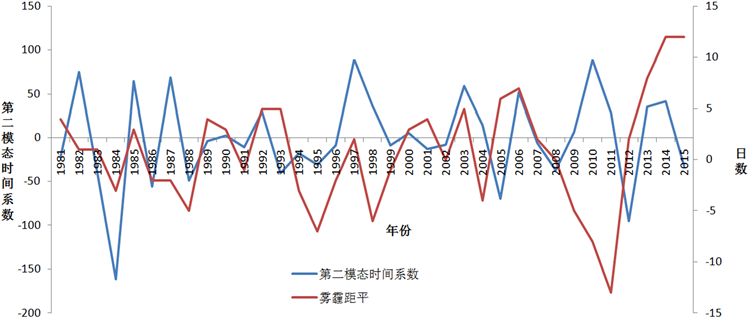 图4. 第二模态时间系数和1月雾霾距平时间序列分布图