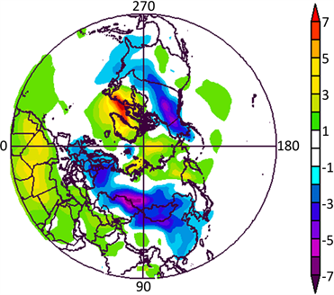 中,位于戴维斯海峡地区的负相关区与1月份北半球较强极涡活跃区位置吻合,在遥相关作用下,西半球极涡会影响京津冀区域雾霾天气过程。华北正相关区、北美正相关区分别位于东亚大槽和北美大槽的上游区域,西西伯利亚负相关区位于欧亚大陆脊的上游区域,表明中纬度环流异常对京津冀区域雾霾有直接影响。由此可知,京津冀区域雾霾主要与极涡及中高纬度环流有关。
