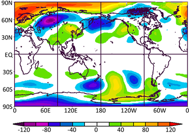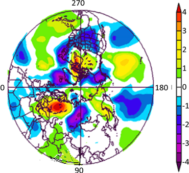 在气候预测应用中,应重点关注500 hPa高度场西西伯利亚区域与蒙古区域的距平场配置,亚洲中纬度与高纬度的距平配置及其位置,亚洲中纬度西风环流的强弱。