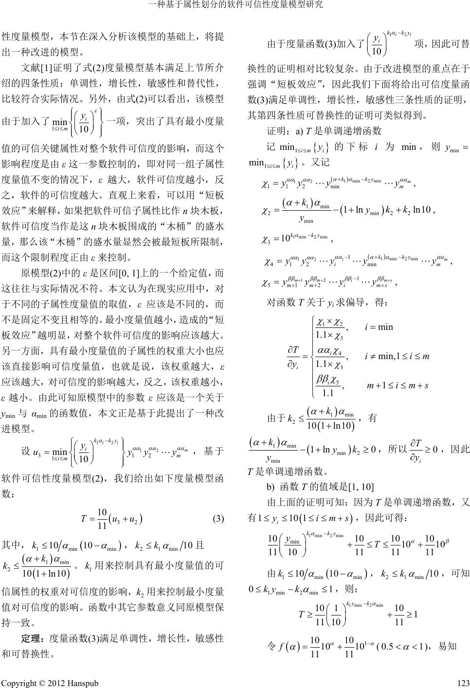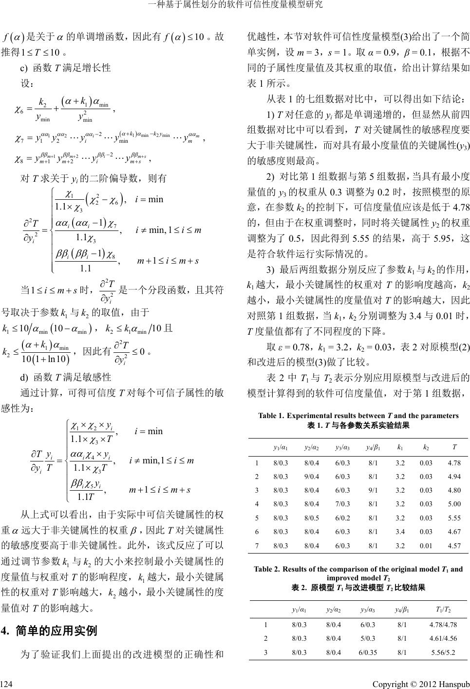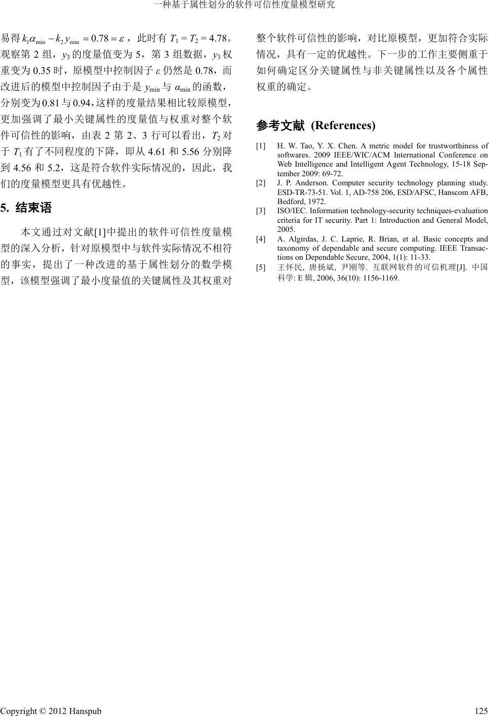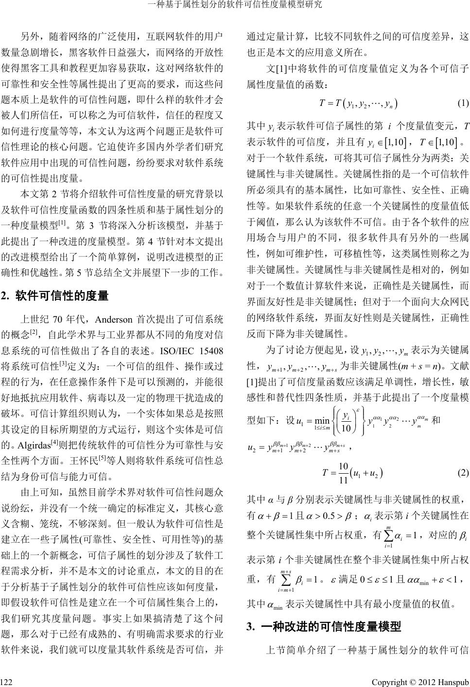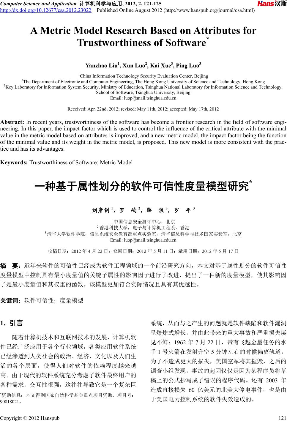![]() Computer Science and Application 计算机科学与应用, 2012, 2, 121-125 http://dx.doi.org/10.12677/csa.2012.23022 Published Online August 2012 (http://www.hanspub.org/journal/csa.html) A Metric Model Research Based on Attributes for Trustworthiness of Software* Yanzhao Liu1, Xun Luo2, Kai Xue3, Ping Luo3 1China Information Technology Security Evaluation Center, Beijing 2The Department of Electronic and Computer Engineering, The Hong Kong University of Science and Technology, Hong Kong 3Key Laboratory for Information System Security, Ministry of Education, Tsinghua National Laboratory for Information Science and Technology, School of Software, Tsinghua University, Beijing Email: luop@mail.tsinghua.edu.cn Received: Apr. 22nd, 2012; revised: May 11th, 2012; accepted: May 17th, 2012 Abstract: In recent years, trustworthiness of the software has become a frontier research in the field of software engi- neering. In this paper, the impact factor which is used to control th e influence of the critical attribute with the minimal value in the metric mode l based on attributes is improved, and a new metric model, the impact factor being the function of the minimal value an d its weight in the metric model, is proposed. This new model is more consistent with the prac- tice and has its advantages. Keywords: Trustworthiness of Software; Metric Model 一种基于属性划分的软件可信性度量模型研究* 刘彦钊 1,罗 峋2,薛 凯3,罗 平3 1中国信息安全测评中心,北京 2香港科技大学,电子与计算机工程系,香港 3清华大学软件学院,信息系统安全教育部重点实验室,清华信息科学与技术国家实验室,北京 Email: luop@mail.tsinghua.edu.cn 收稿日期:2012 年4月22 日;修回日期:2012 年5月11 日;录用日期:2012 年5月17 日 摘 要:近年来软件的可信性已经成为软件工程领域的一个前沿研究方向,本文对基于属性划分的软件可信性 度量模型中控制具有最小度量值的关键子属性的影响因子进行了改进,提出了一种新的度量模型,使其影响因 子是最小度量值和其权重的函数。该模型更加符合实际情况且具有其优越性。 关键词:软件可信性;度量模型 1. 引言 随着计算机技术和互联网技术的发展,计算机软 件已经广泛应用于各个行业领域,各类应用软件系统 已经渗透到人类社会的政治、经济、文化以及人们生 活的各个层面,使得人们对软件的依赖程度越来越 高。由于现代的软件系统充分考虑了软件最终用户的 各种需求,交互性很强,这往往导致它是一个复杂巨 系统,从而与之产生的问题就是软件缺陷和软件漏洞 呈爆炸式增长,并由此带来的重大事故和严重损失屡 见不鲜:1962 年7月22 日,带有飞越金星任务的水 手1号火箭在发射升空 5分钟左右的时候偏离轨道, 为了不造成更大的损失,美国空军将其摧毁,之后的 调查小组发现,事故的起因仅仅是因为某程序员将草 稿上的公式抄写成了错误的程序代码。还有 2003 年 造成直接损失 60 亿美元的北美大停电事件,也是由 于美国电力控制系统的软件失效造成的。 *资助信息:本文得到国家自然科学基金重点项目资助,项目号: 90818021。 Copyright © 2012 Hanspub 121 ![]() 一种基于属性划分的软件可信性度量模型研究 另外,随着网络的广泛使用,互联网软件的用户 数量急剧增长,黑客软件日益强大,而网络的开放性 使得黑客工具和教程更加容易获取,这对网络软件的 可靠性和安全性等属性提出了更高的要求,而这些问 题本质上是软件的可信性问题,即什么样的软件才会 被人们所信任,可以称之为可信软件,信任的程度又 如何进行度量等等,本文认为这两个问题正是软件可 信性理论的核心问题。它迫使许多国内外学者们研究 软件应用中出现的可信性问题,纷纷要求对软件系统 的可信性提出度量。 本文第 2节将介绍软件可信性度量的研究背景以 及软件可信性度量函数的四条性质和基于属性划分的 一种度量模型[1]。第 3节将深入分析该模型,并基于 此提出了一种改进的度量模型。第 4节针对本文提出 的改进模型给出了一个简单算例,说明改进模型的正 确性和优越性。第5节总结全文并展望下一步的工作。 2. 软件可信性的度量 上世纪 70 年代,Anderson 首次提出了可信系统 的概念[2],自此学术界与工业界都从不同的角度对信 息系统的可信性做出了各自的表述。ISO/IEC 15408 将系统可信性[3]定义为:一个可信的组件、操作或过 程的行为,在任意操作条件下是可以预测的,并能很 好地抵抗应用软件、病毒以及一定的物理干扰造成的 破坏。可信计算组织则认为,一个实体如果总是按照 其设定的目标所期望的方式运行,则这个实体是可信 的。Algirdas[4]则把传统软件的可信性分为可靠性与安 全性两个方面。王怀民[5]等人则将软件系统可信性总 结为身份可信与能力可信。 由上可知,虽然目前学术界对软件可信性问题众 说纷纭,并没有一个统一确定的标准定义,其核心意 义含糊、笼统,不够深刻。但一般认为软件可信性是 建立在一些子属性(可靠性、安全性、可用性等)的基 础上的一个新概念,可信子属性的划分涉及了软件工 程需求分析,并不是本文的讨论重点,本文的目的在 于分析基于子属性划分的软件可信性应该如何度量, 即假设软件可信性是建立在一个可信属性集合上的, 我们研究其度量问题。事实上如果搞清楚了这个问 题,那么对于已经有成熟的、有明确需求要求的行业 软件来说,我们就可以度量其软件系统是否可信,并 通过定量计算,比较不同软件之间的可信度差异,这 也正是本